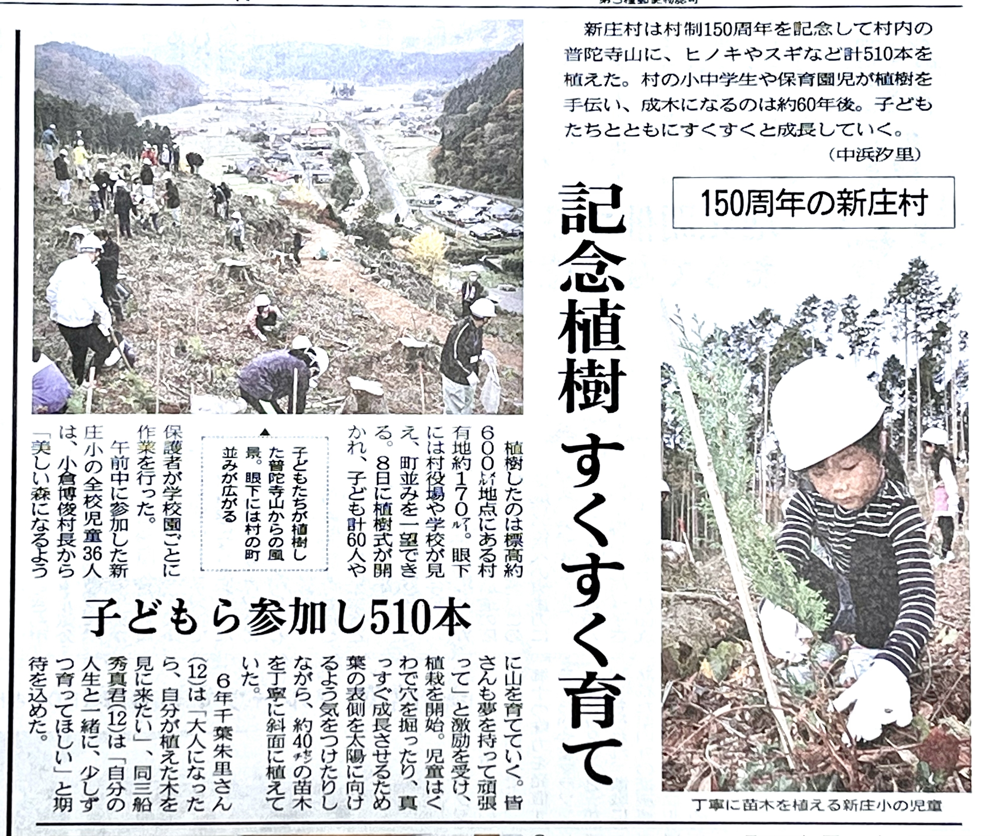 山陽新聞の朝刊の作州ワイド版に記念植樹の話・・・さらに折り込みの「真庭タイムズ」に新庄村の「冬のふるさと便」と「真庭音楽祭」の話題!