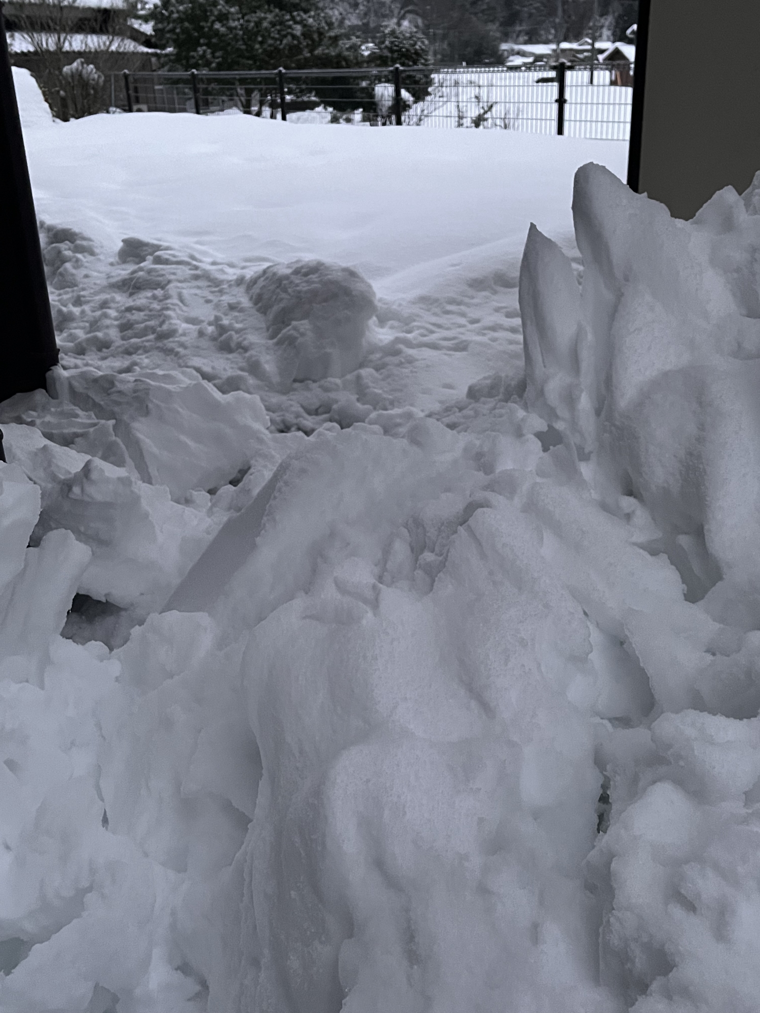 ガレージの屋根の雪がブロックになって落ちている。。。。