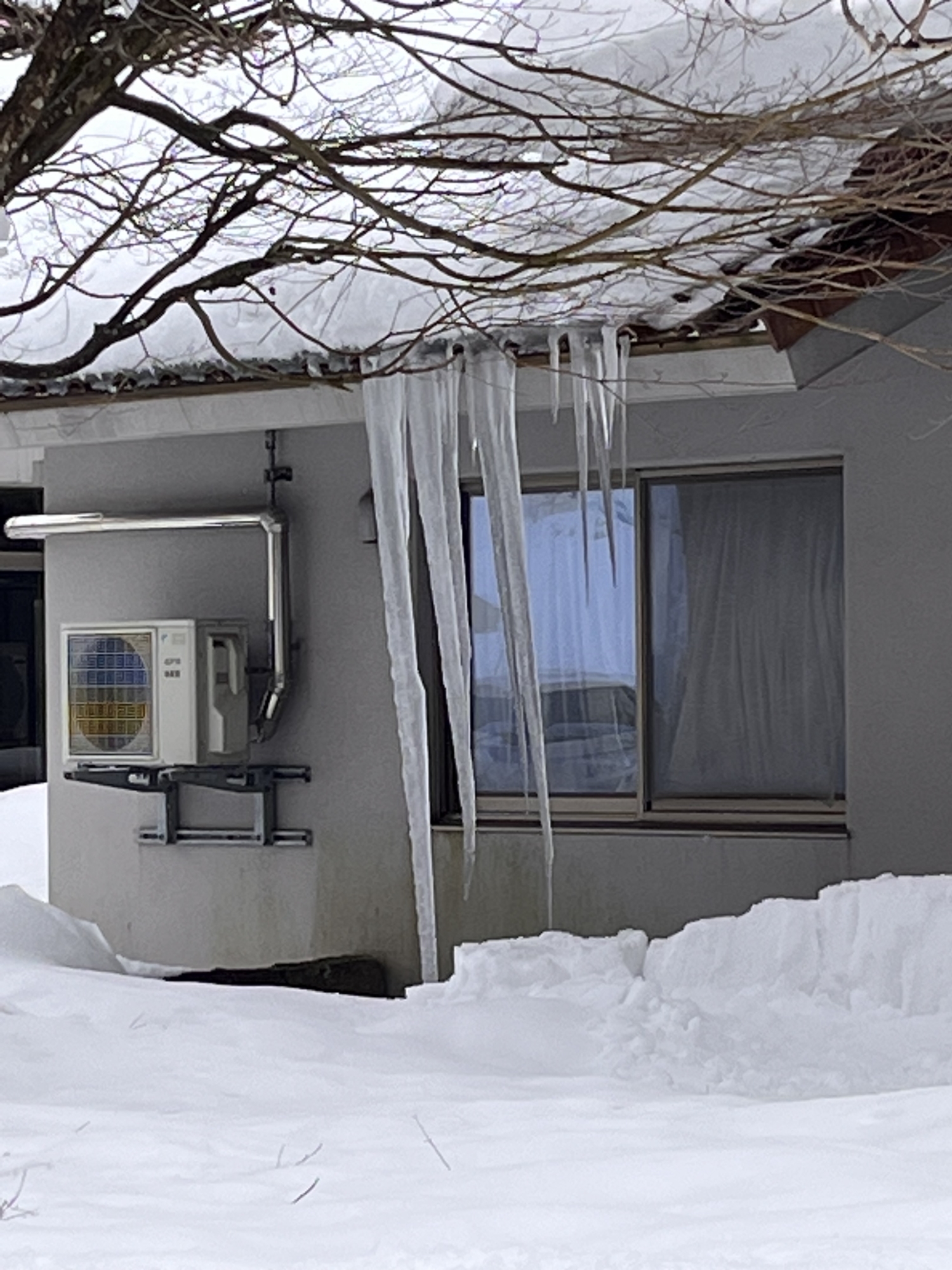 窓には、屋根の雪が落ちそうになって・・そこに氷柱。