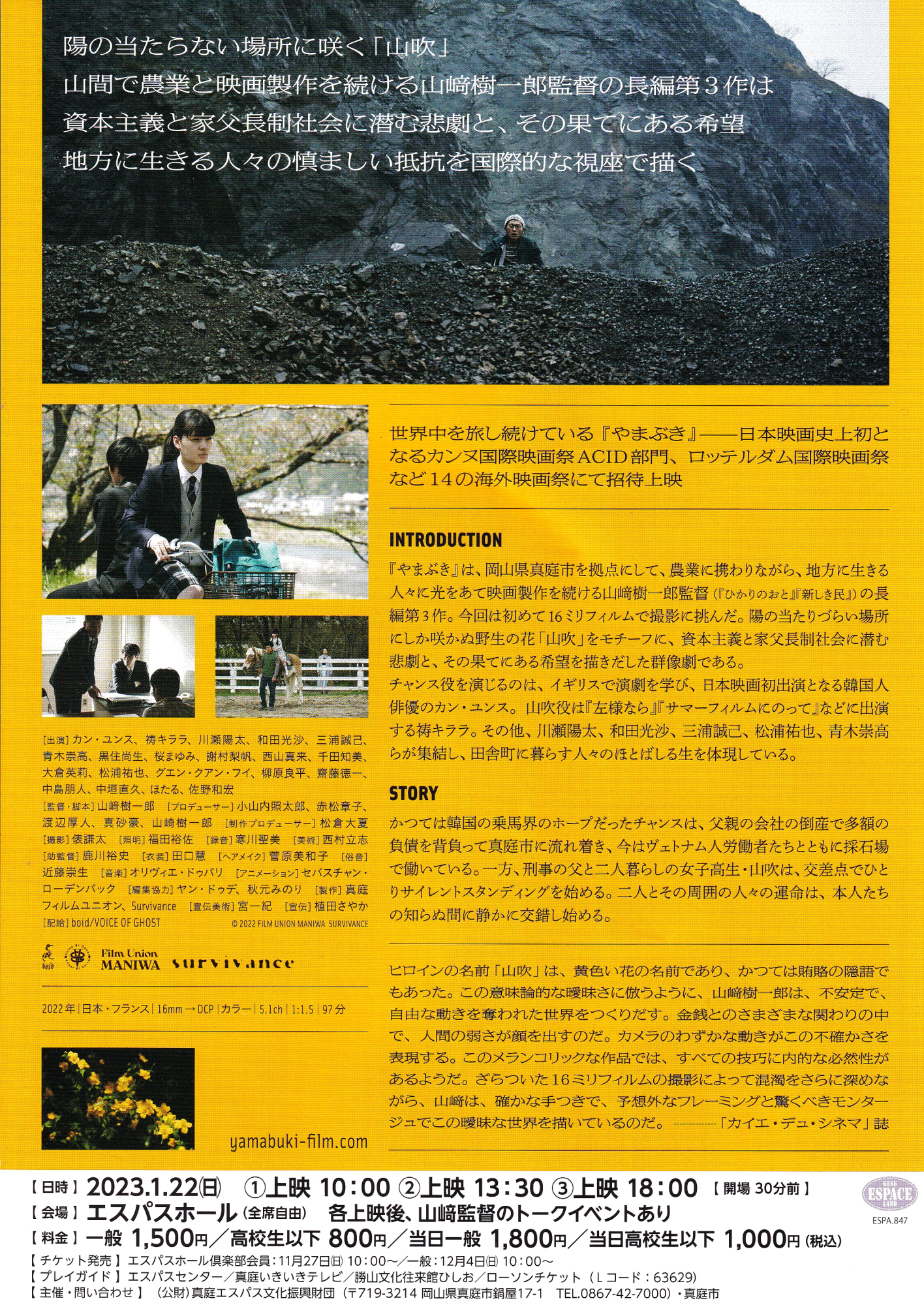 エスパスホールで、山崎樹一郎監督の「やまぶき」カンヌ映画祭のACID部門出店、ロッテルダム映画祭にも・・・