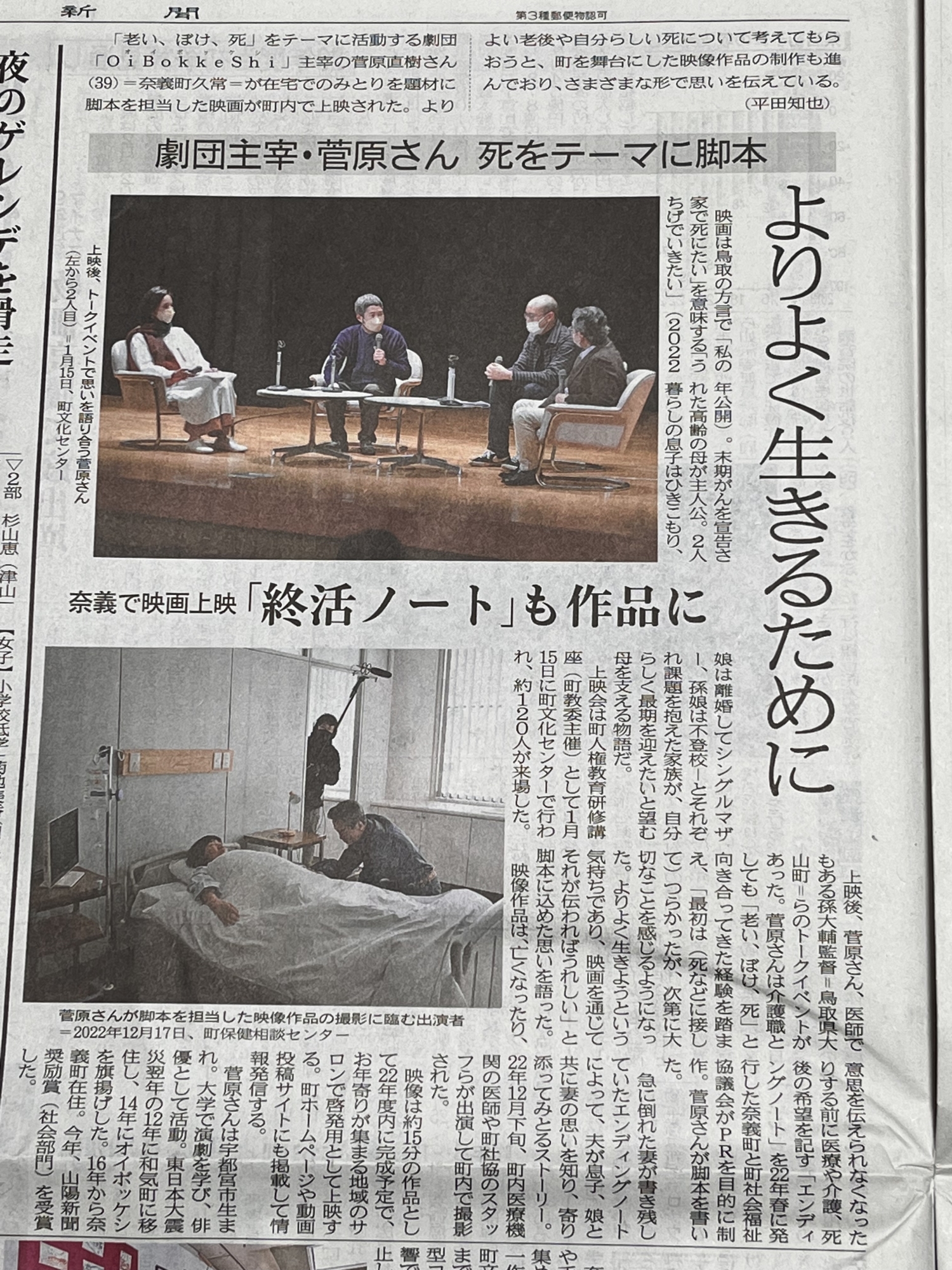 山陽新聞作州ワイド版で・・1/15に観てきた「うちげでいきたい」の記事・・・2/01の朝礼でこの話もし、また、実は新庄村でも上映会を行う予定です。