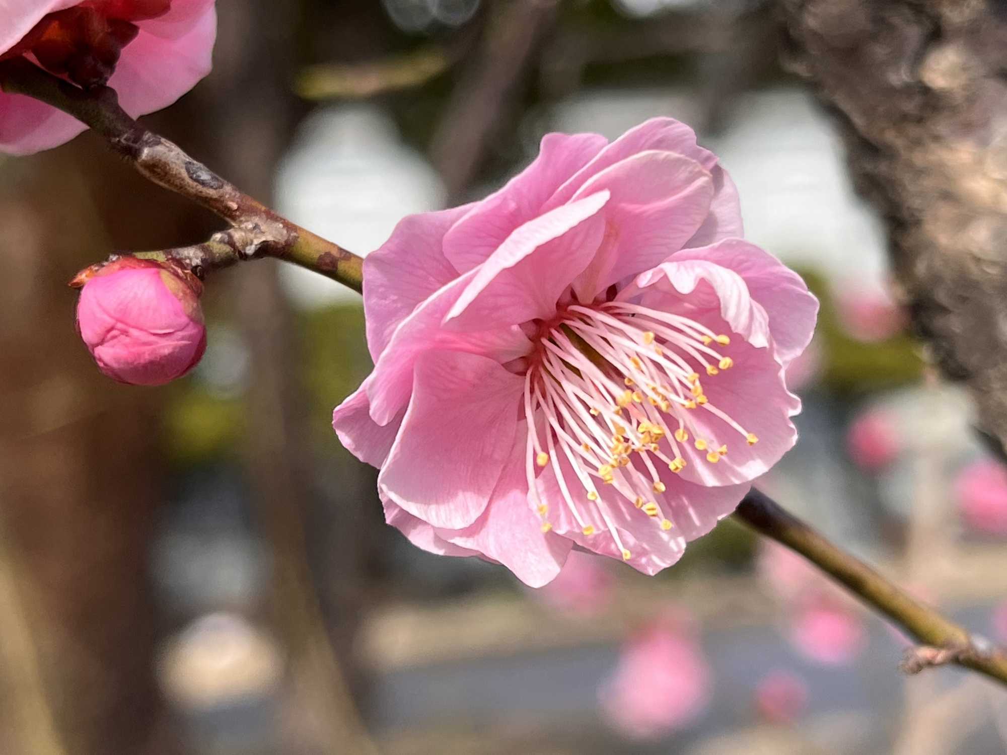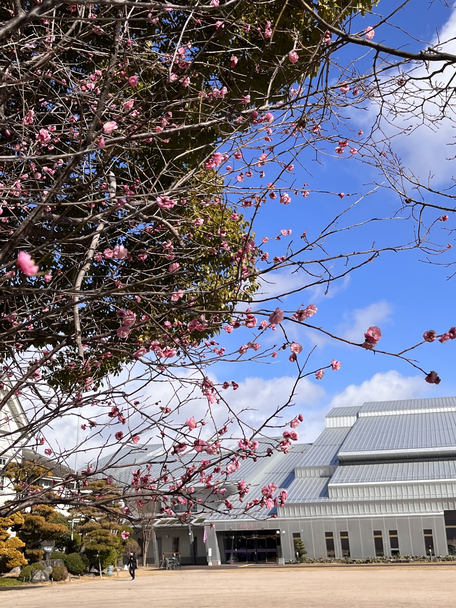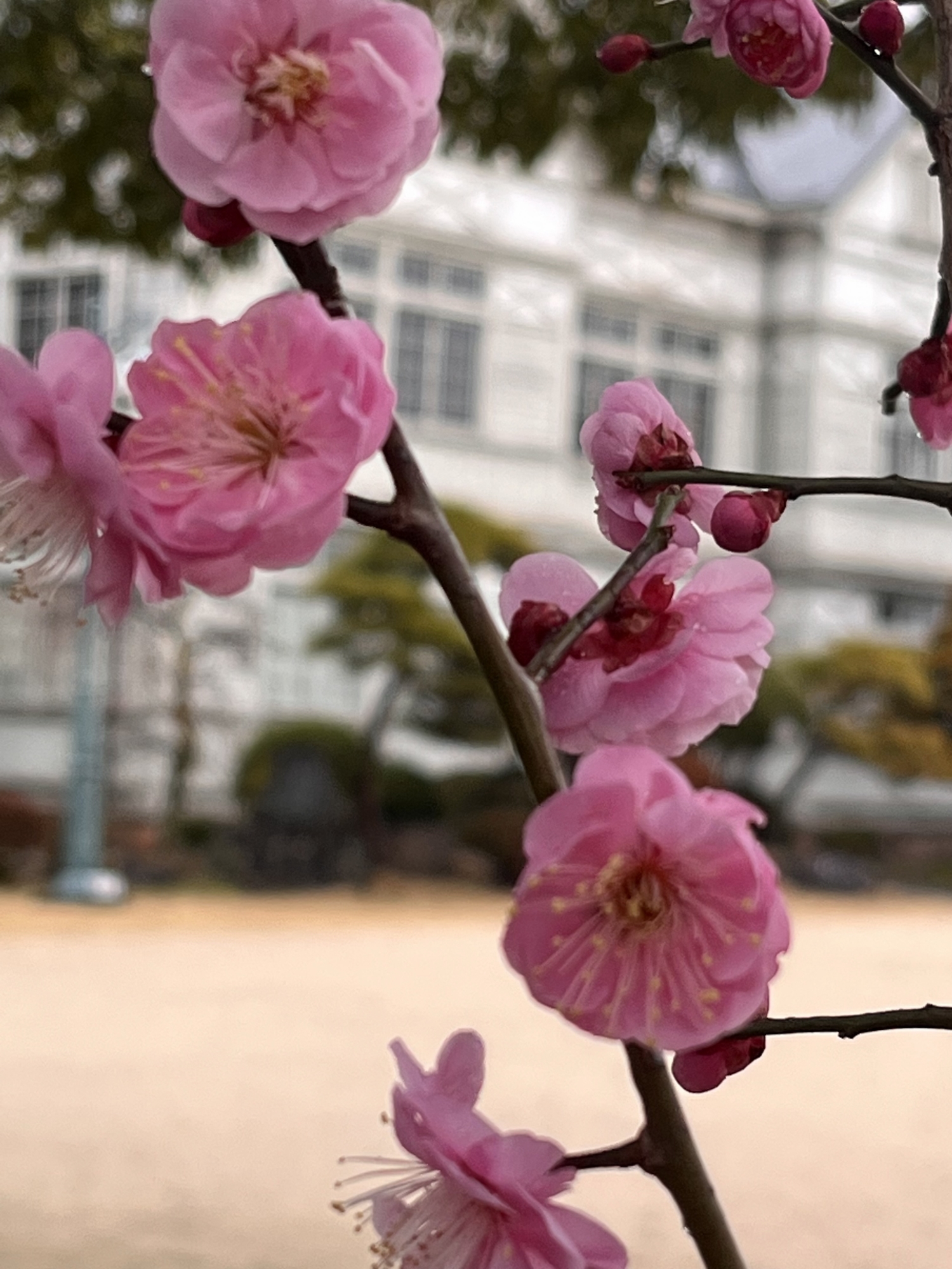 そこからいつもの旧遷喬尋常小学校跡・・・ピンクの梅。