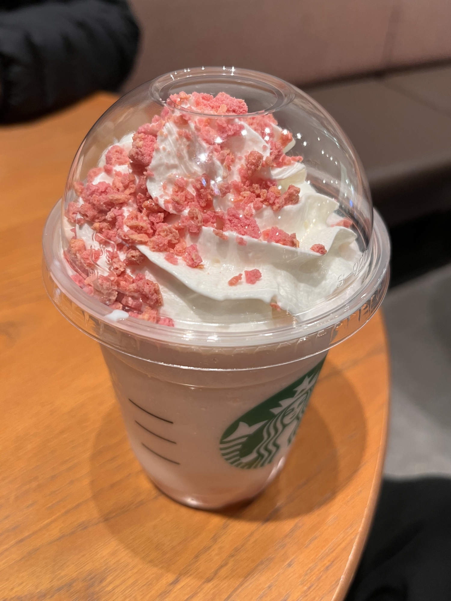 そこから再び米子へ・・・イオンモール日吉津で・・・スタバ!! サクラ咲くフラペチーノで、デザートとしました。紙ストロー。