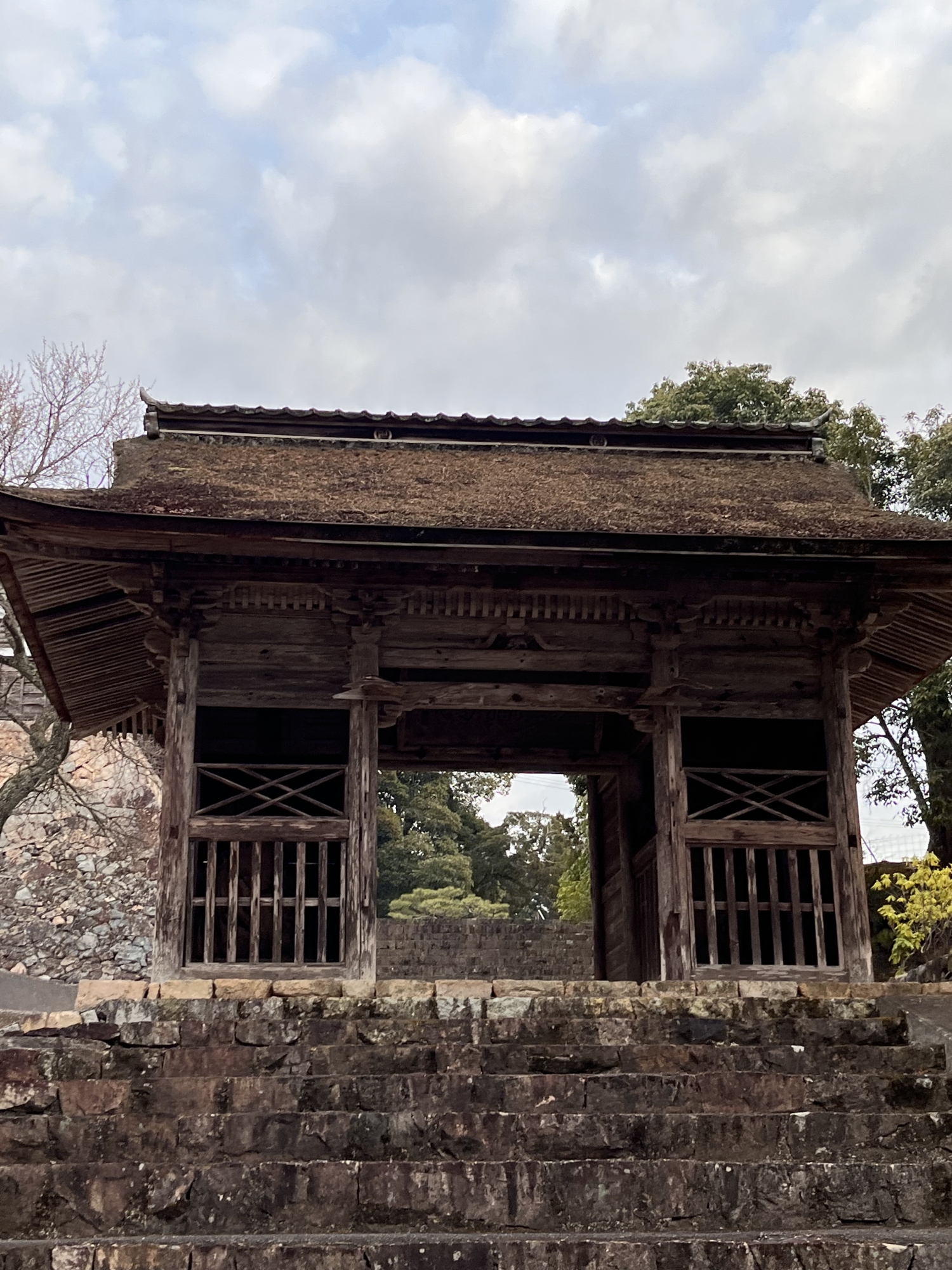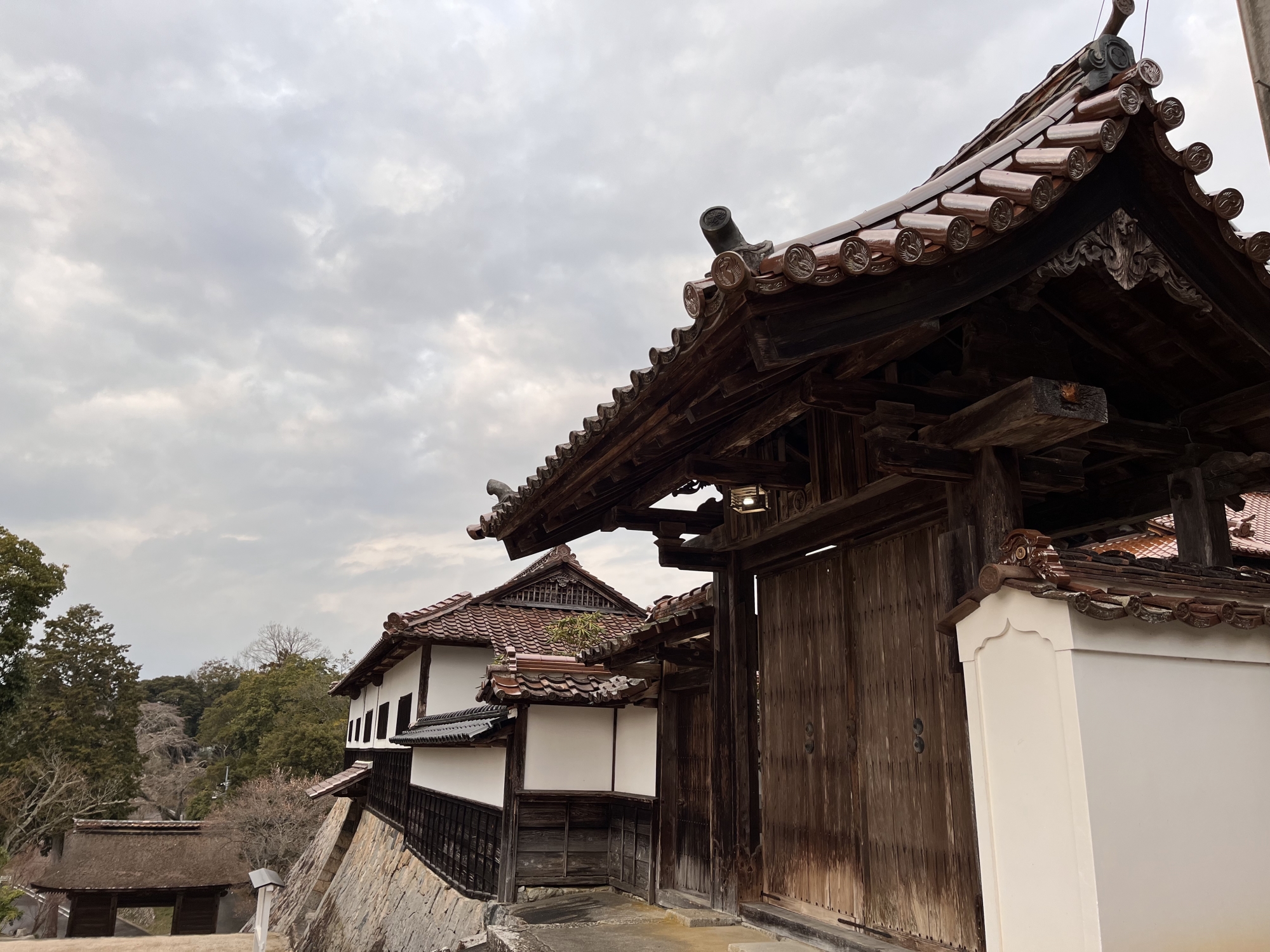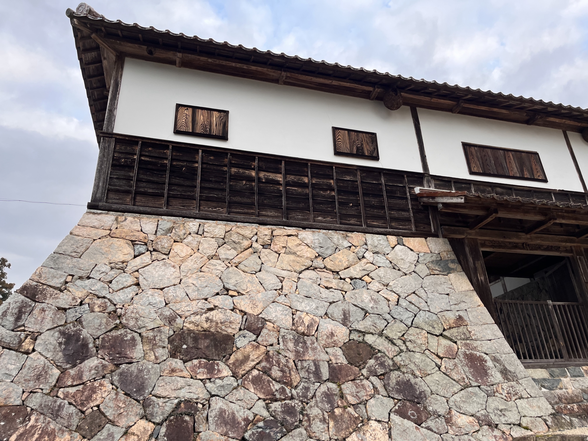 【長屋:幕末の弘化2年(1845年)建造。城郭のような石垣上にあり、門は石垣に囲まれた埋門(うずみもん)となっている。岡山県指定重要文化財。】