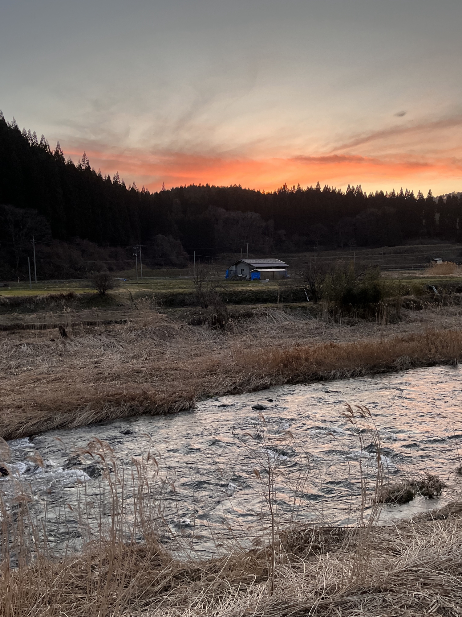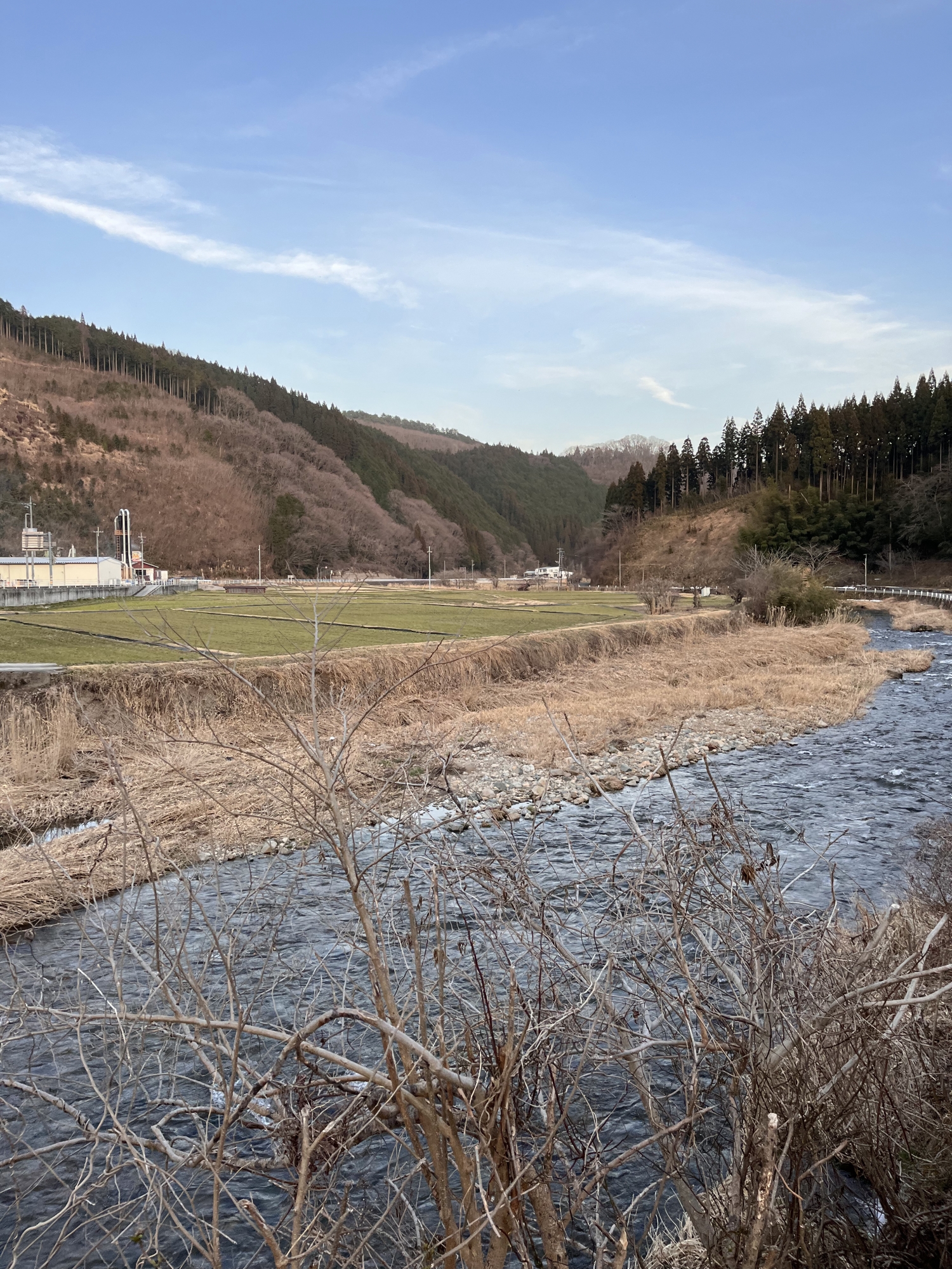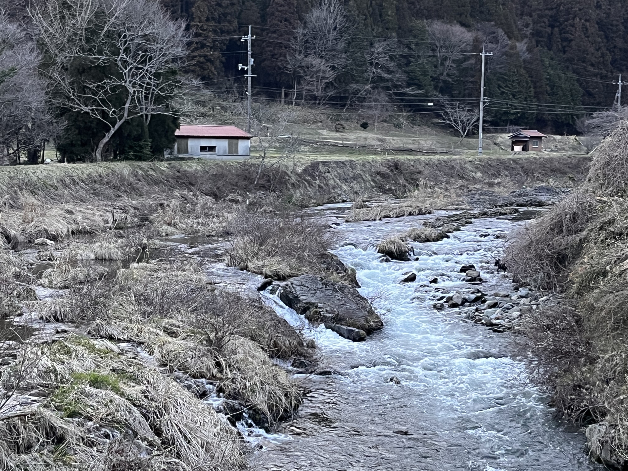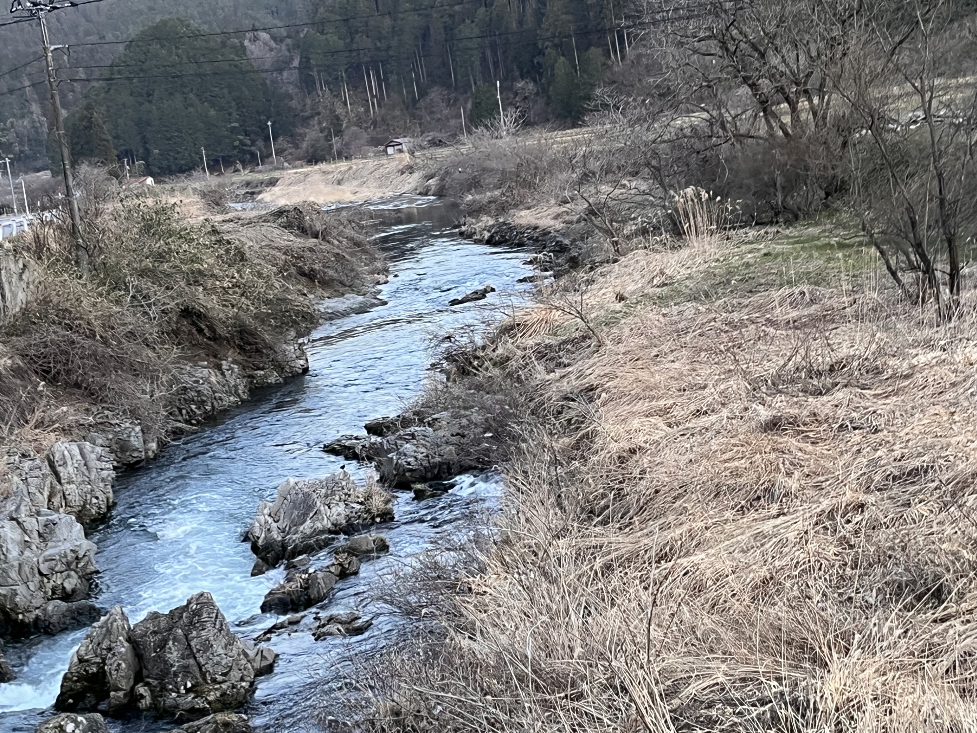 一時期よりも少し水量が減った(渡る石が見えています)新庄川。