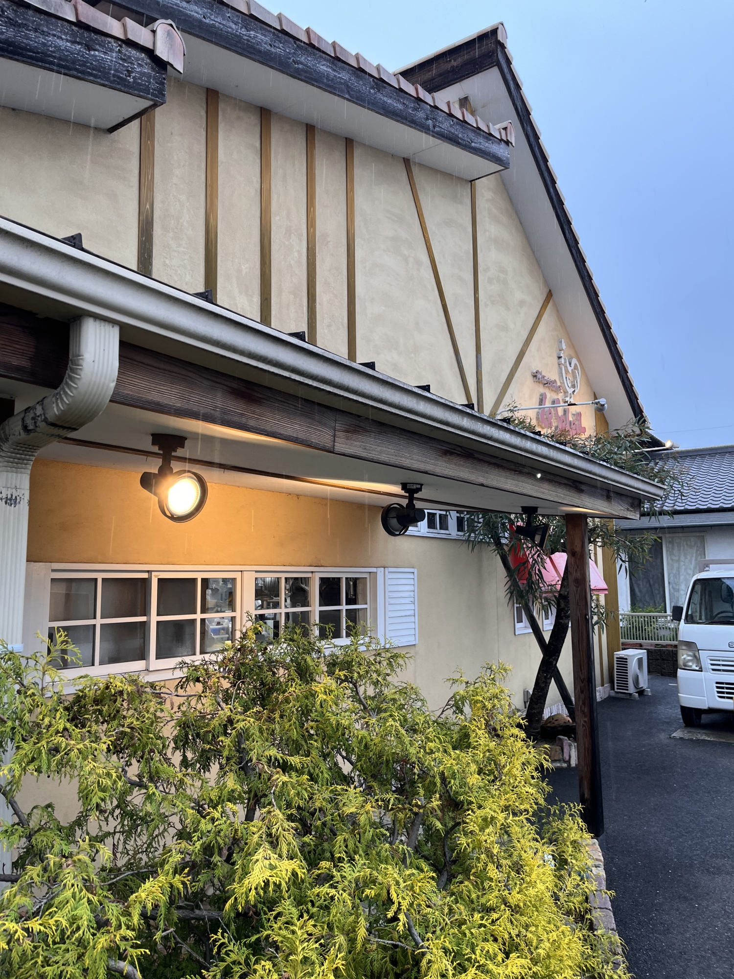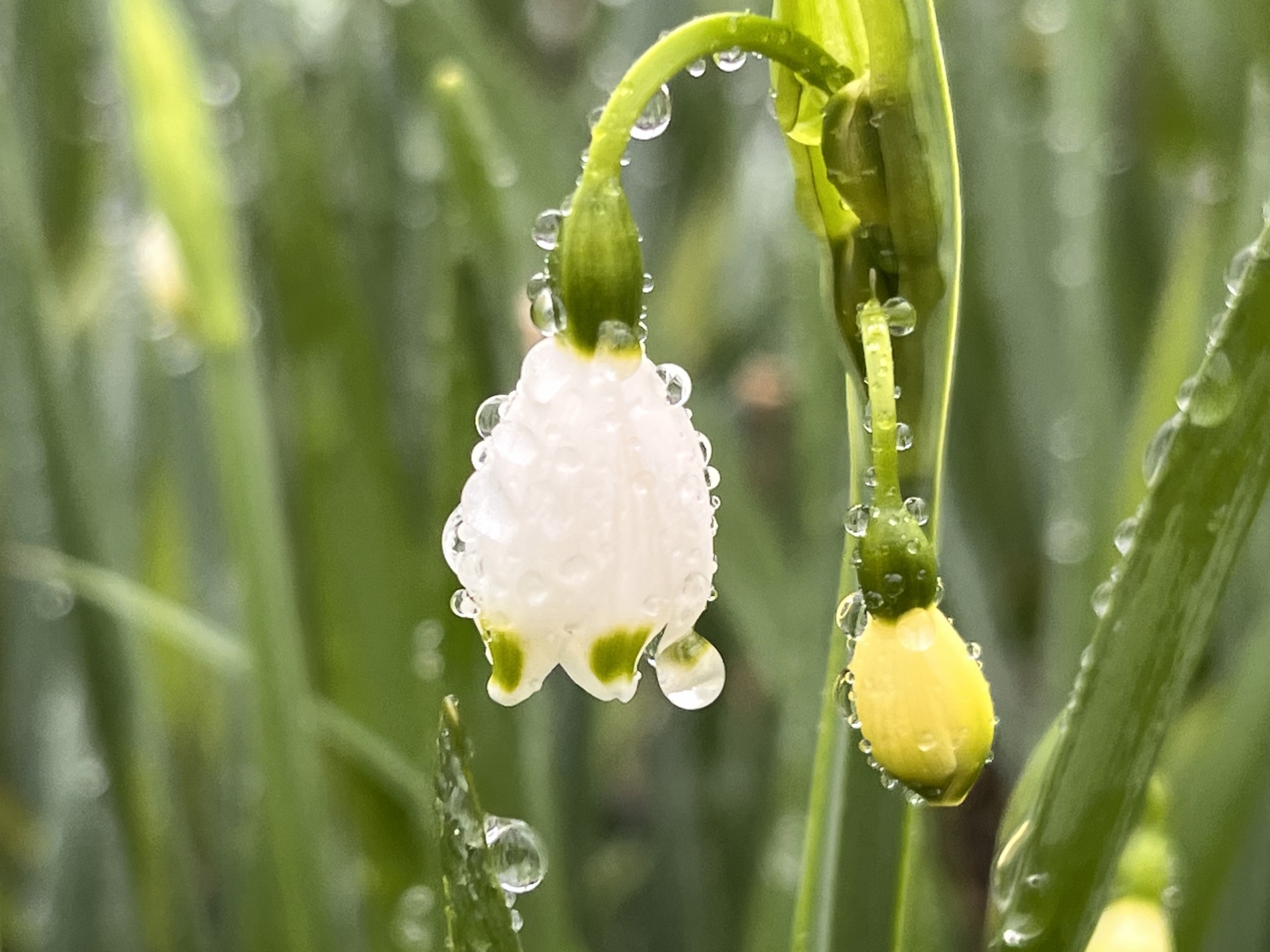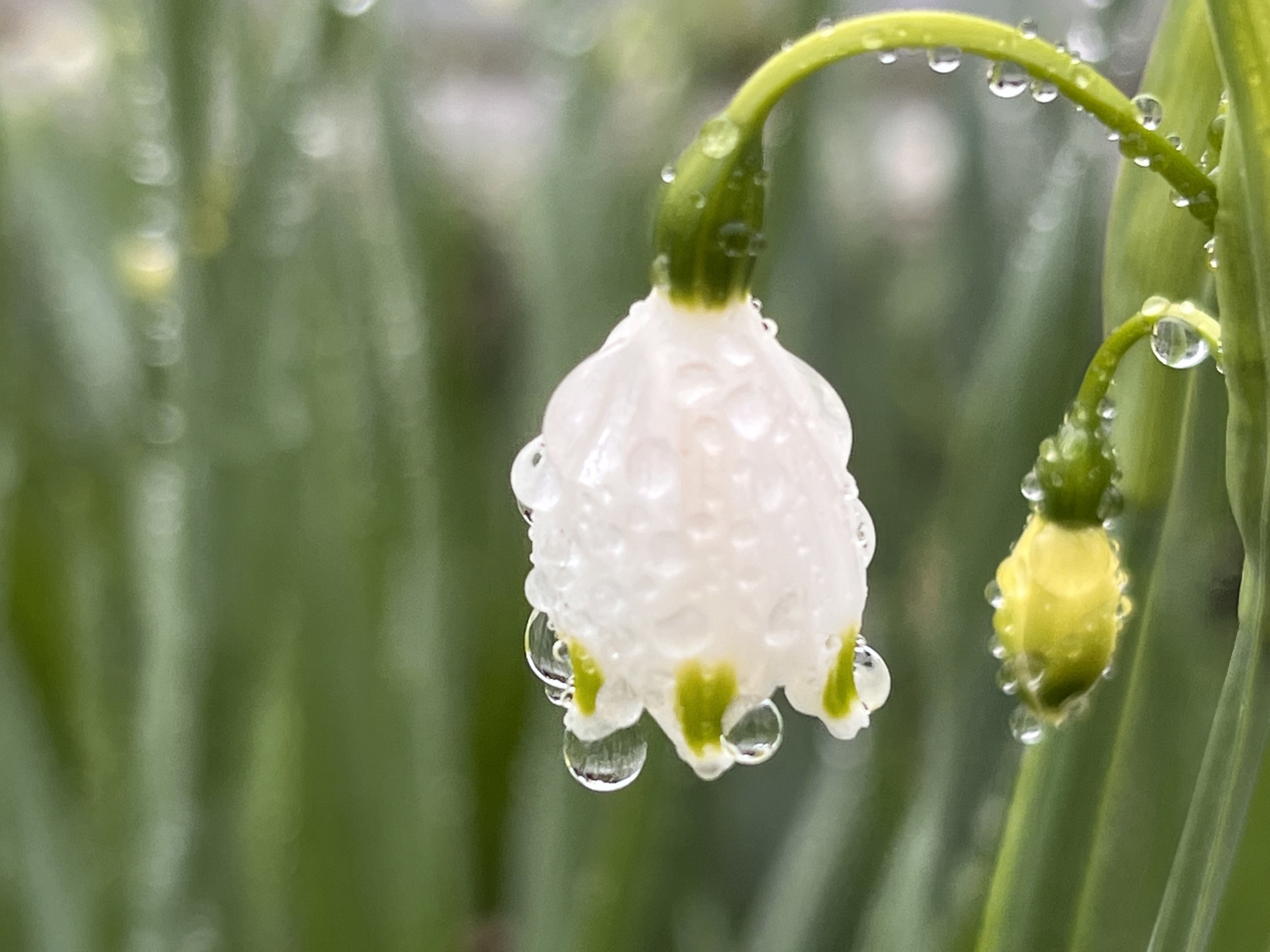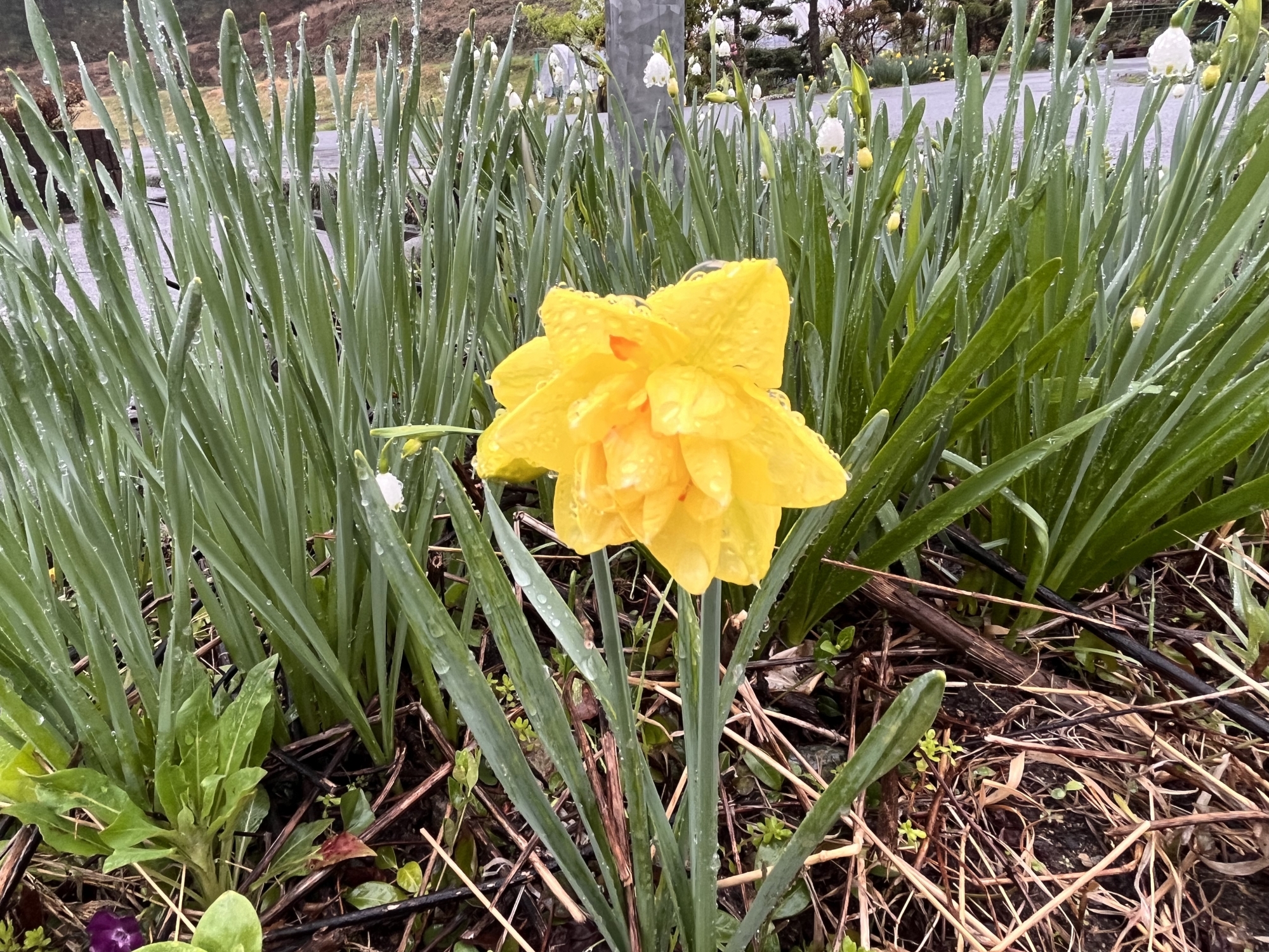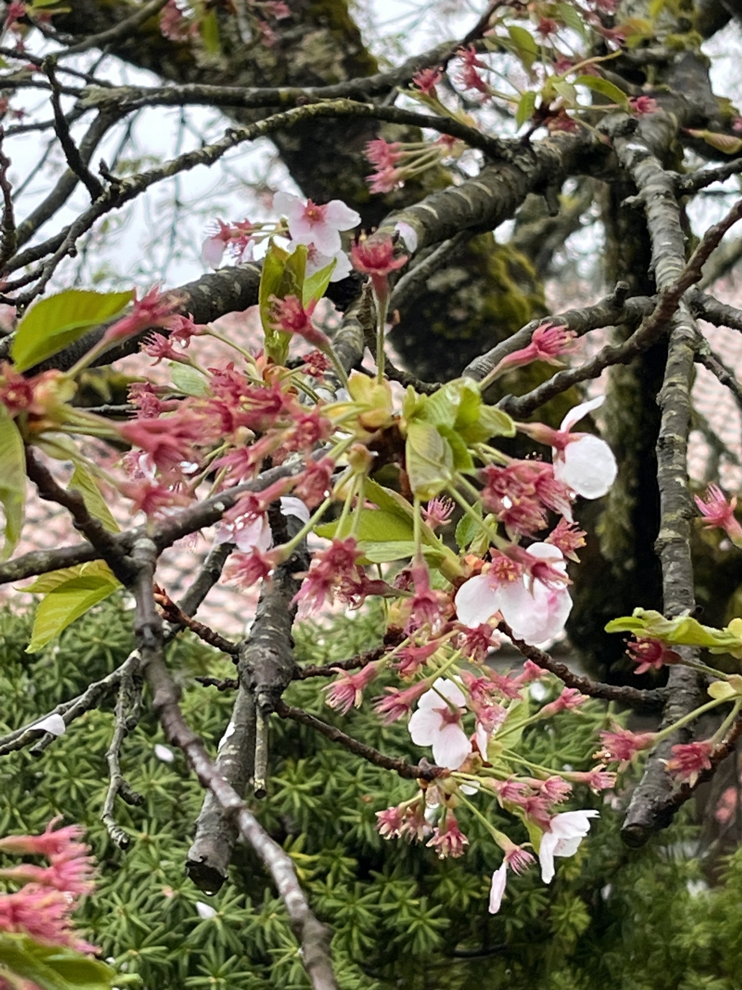 庭の春にも雨粒。