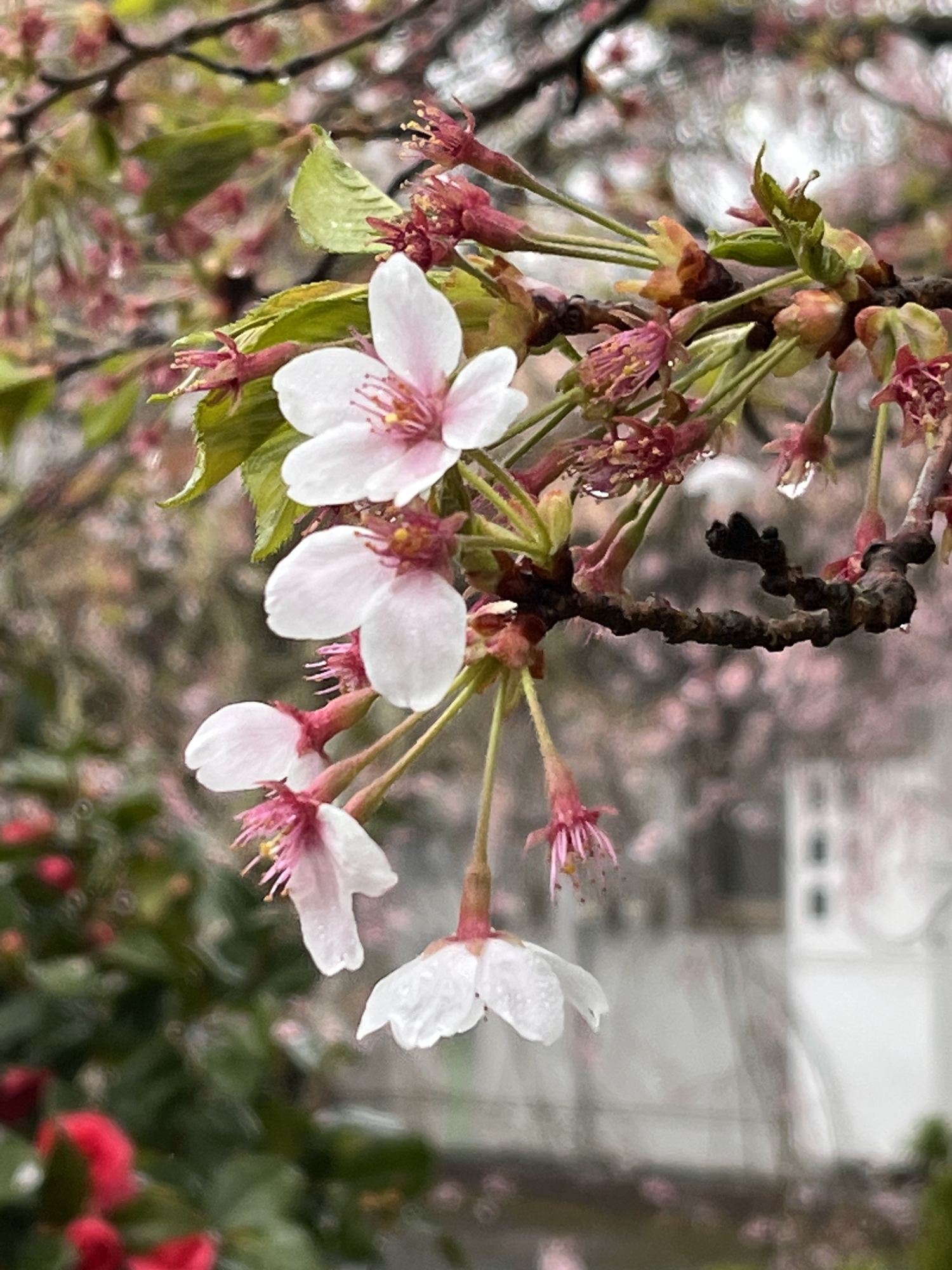 昼・・・郵便局への往復・・名残りの染井吉野&椿・・そして、枝垂れ桜も・・少し散り始めました。