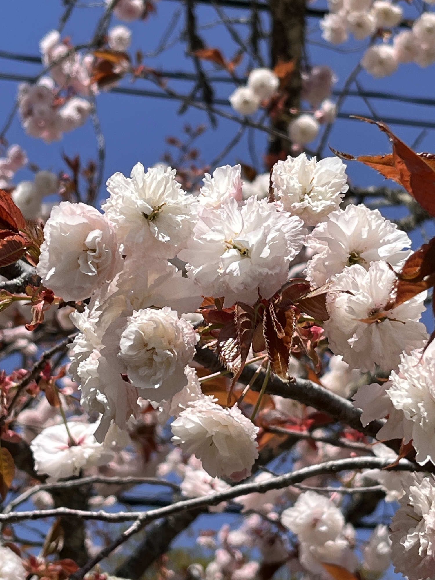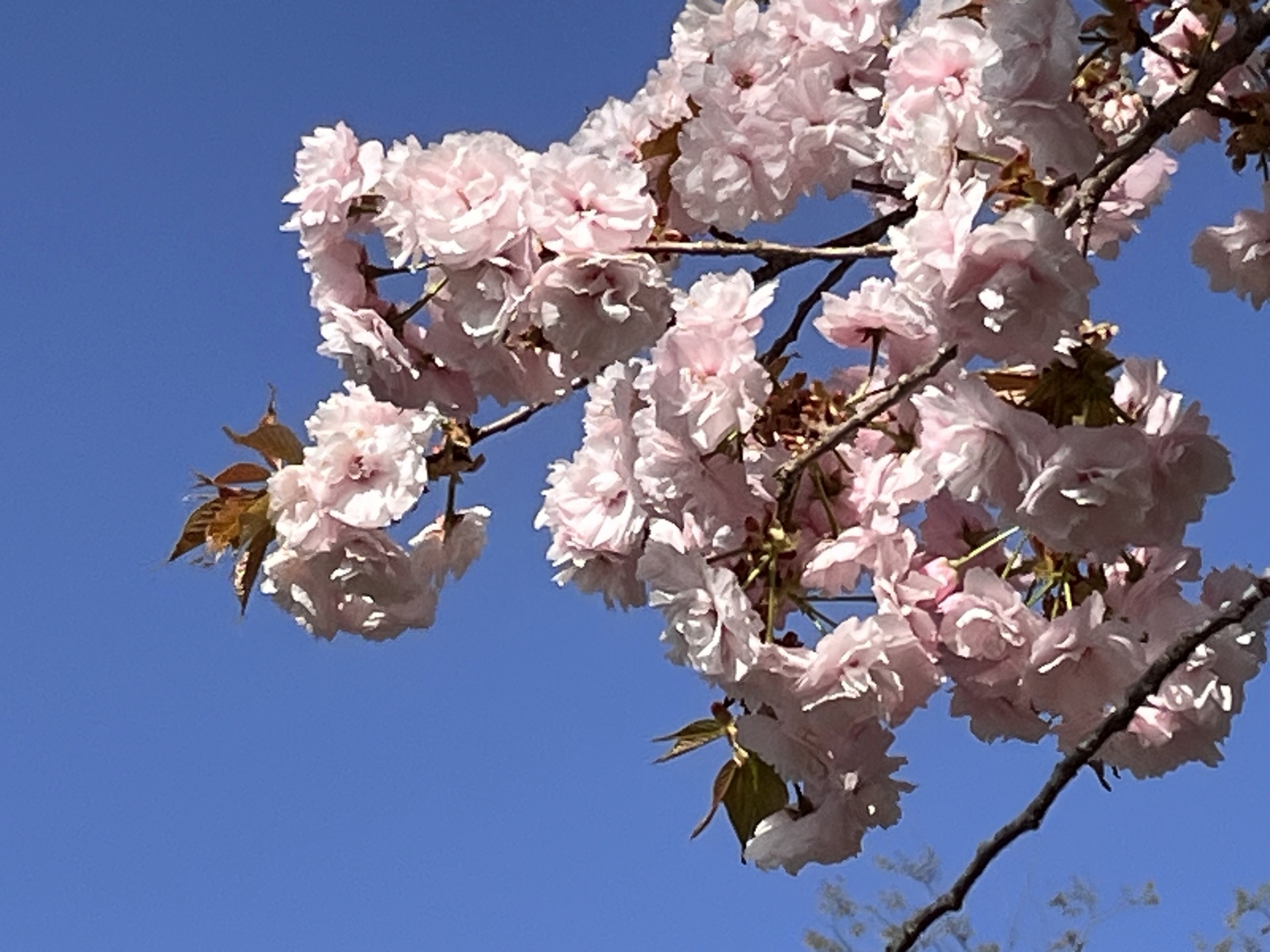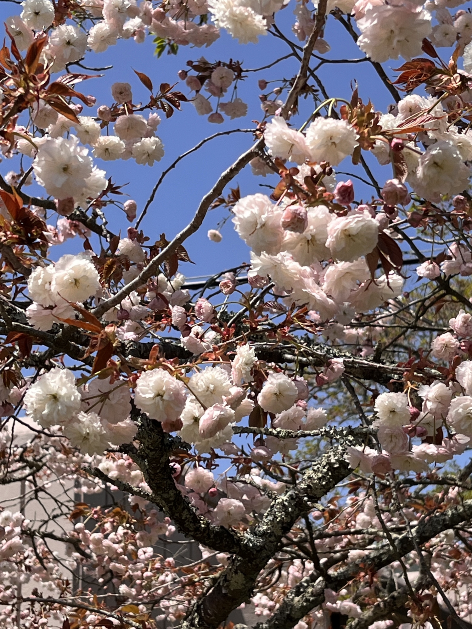 ほら・・公民館の夜の八重桜も満開で・・昨日も、観ましたけど・・でも、青空の中が良いですね、やっぱり。