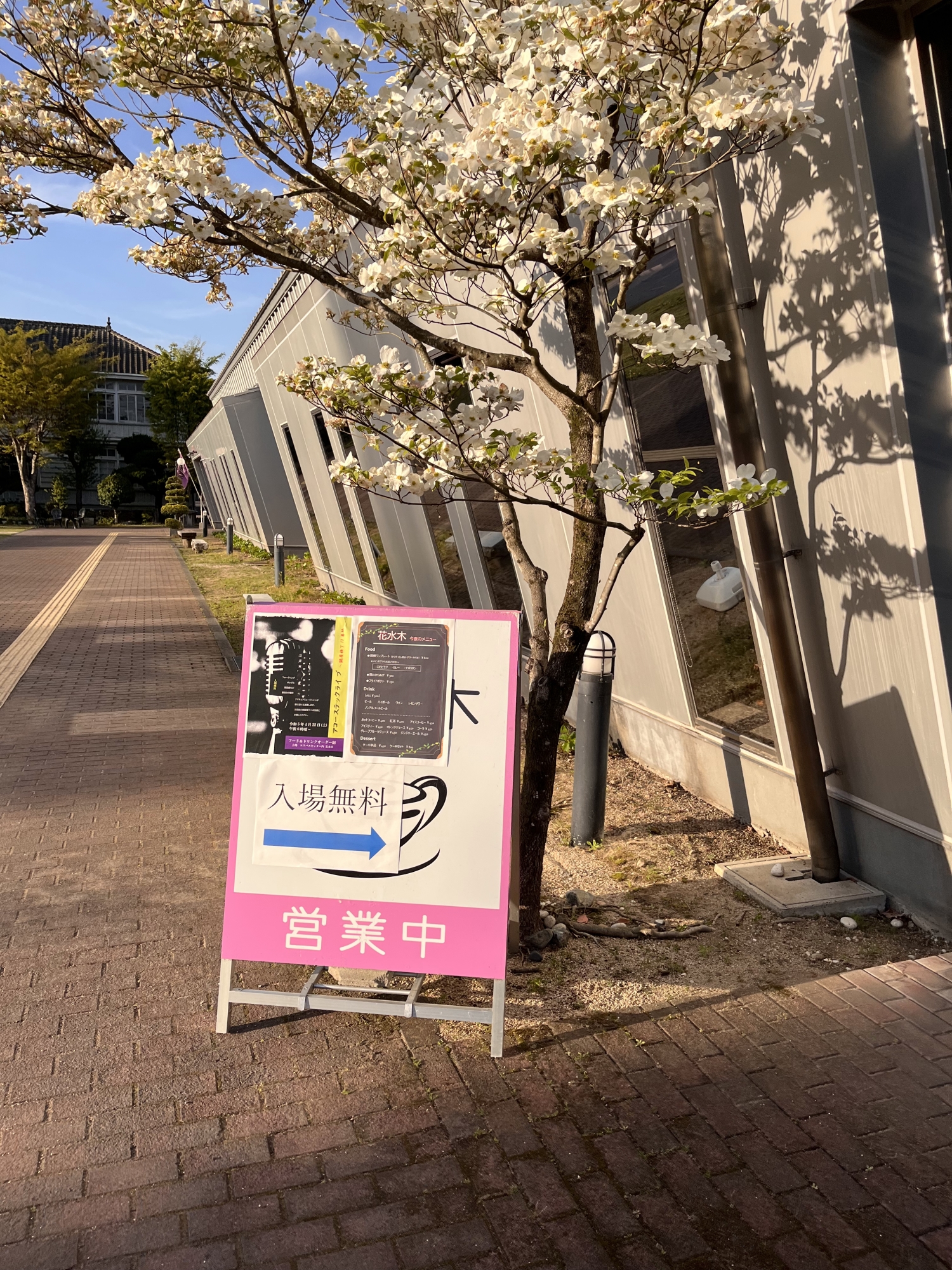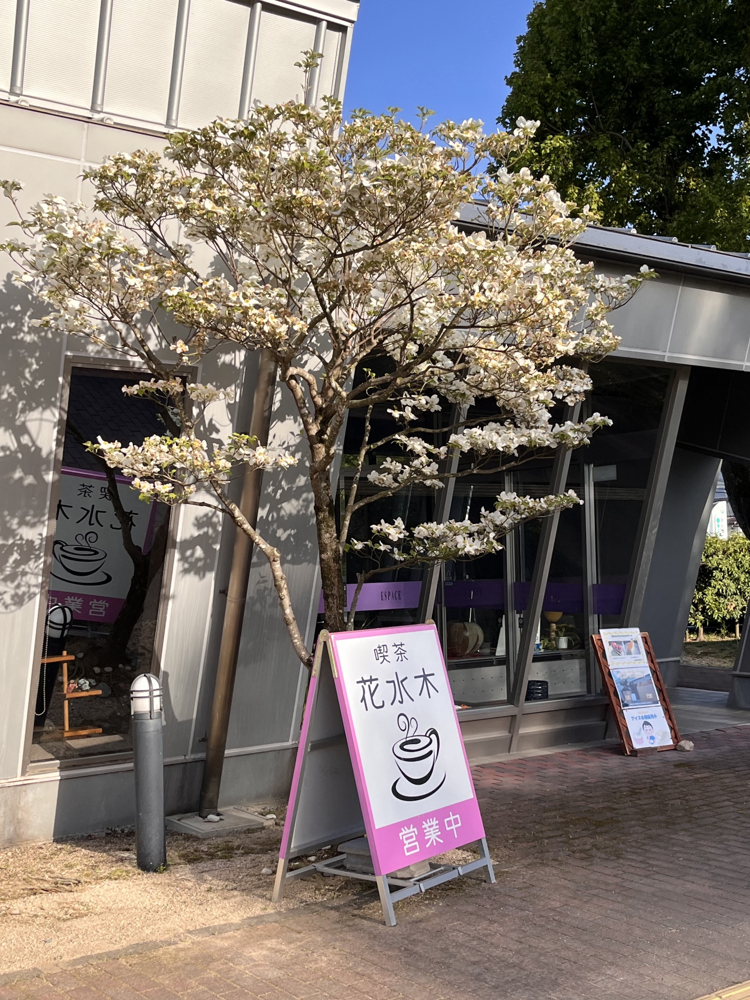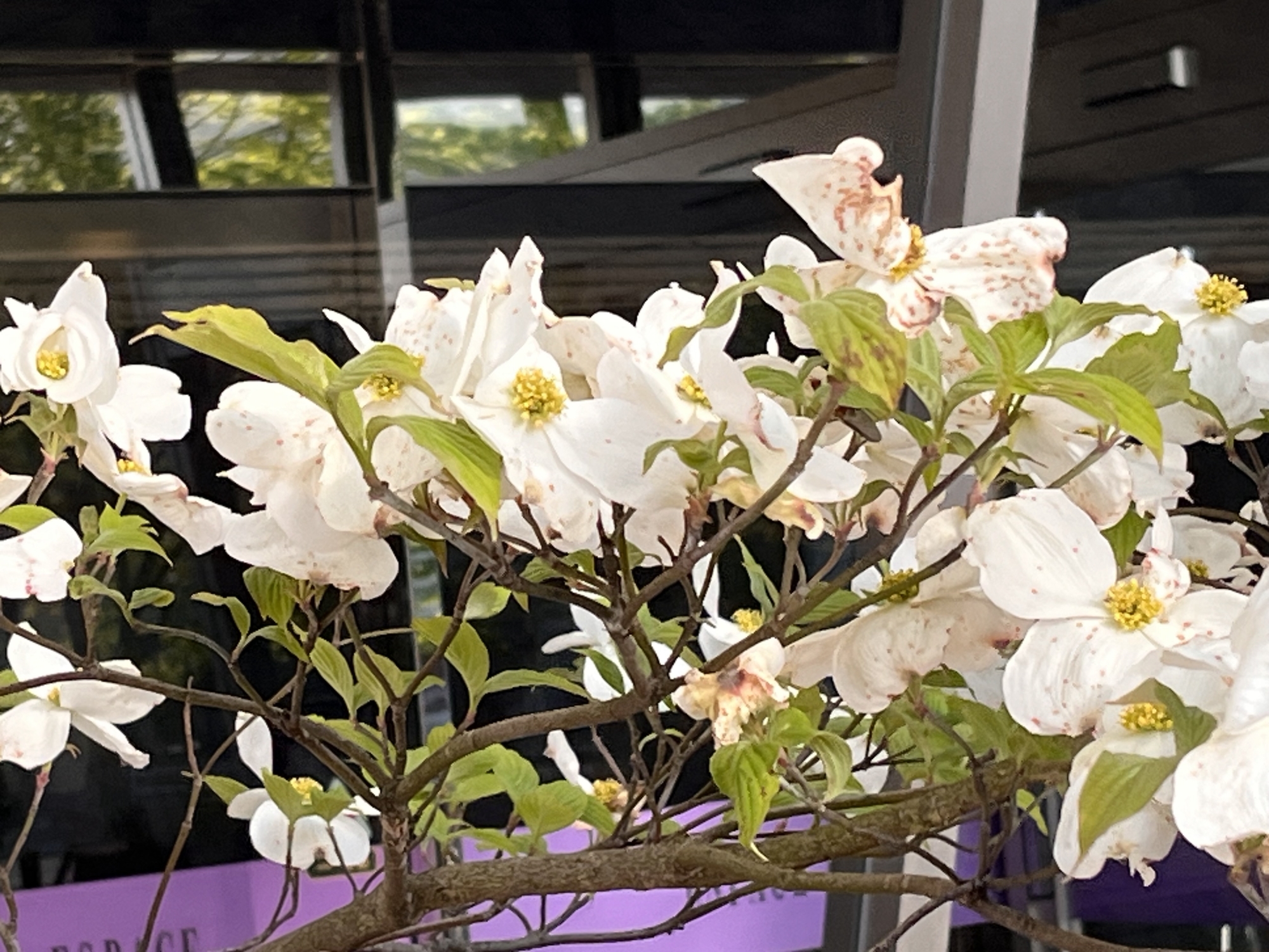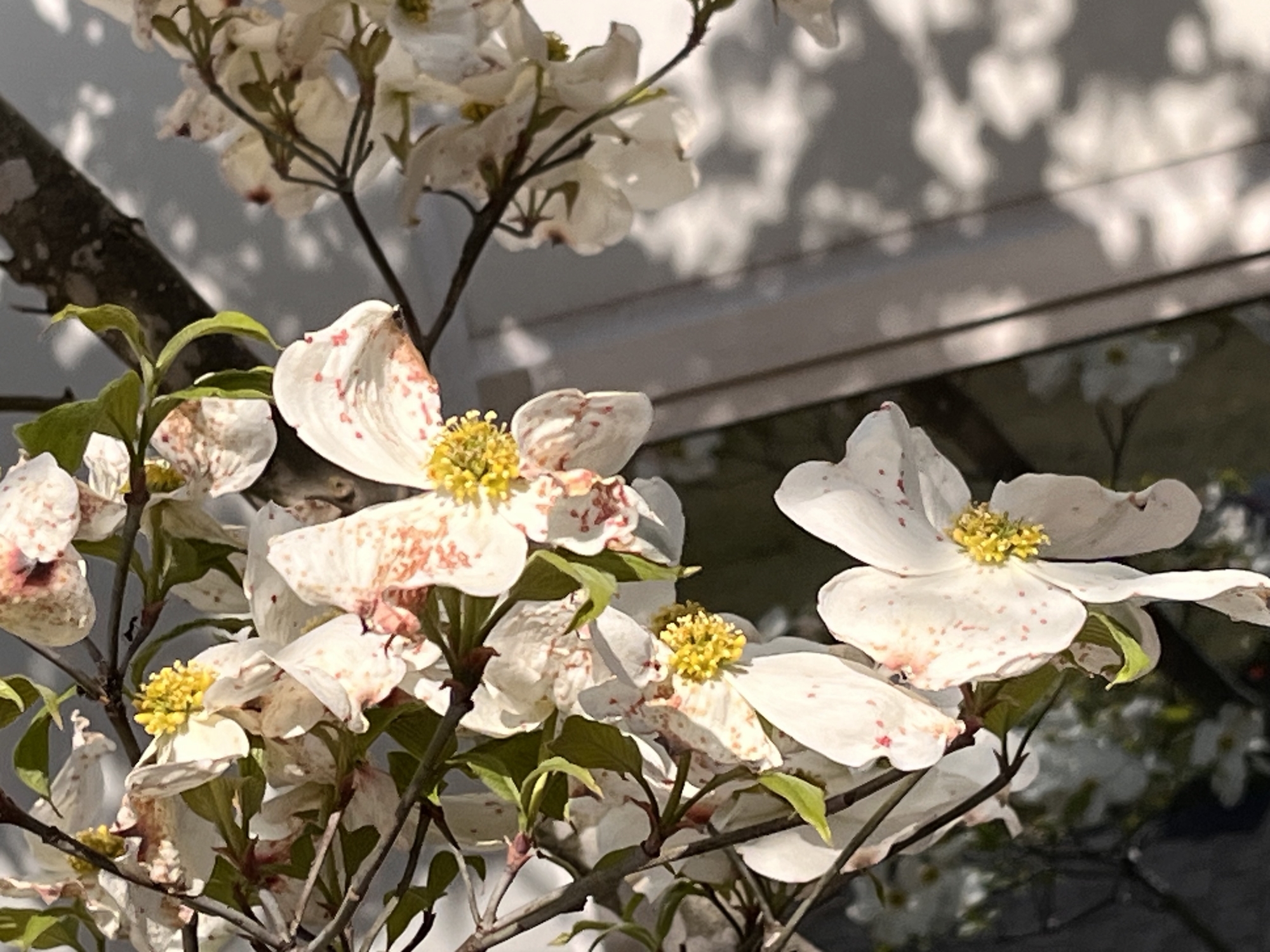 喫茶「花水木」の入口のハナミズキは・・もう、盛りを過ぎてる?? びっくり。