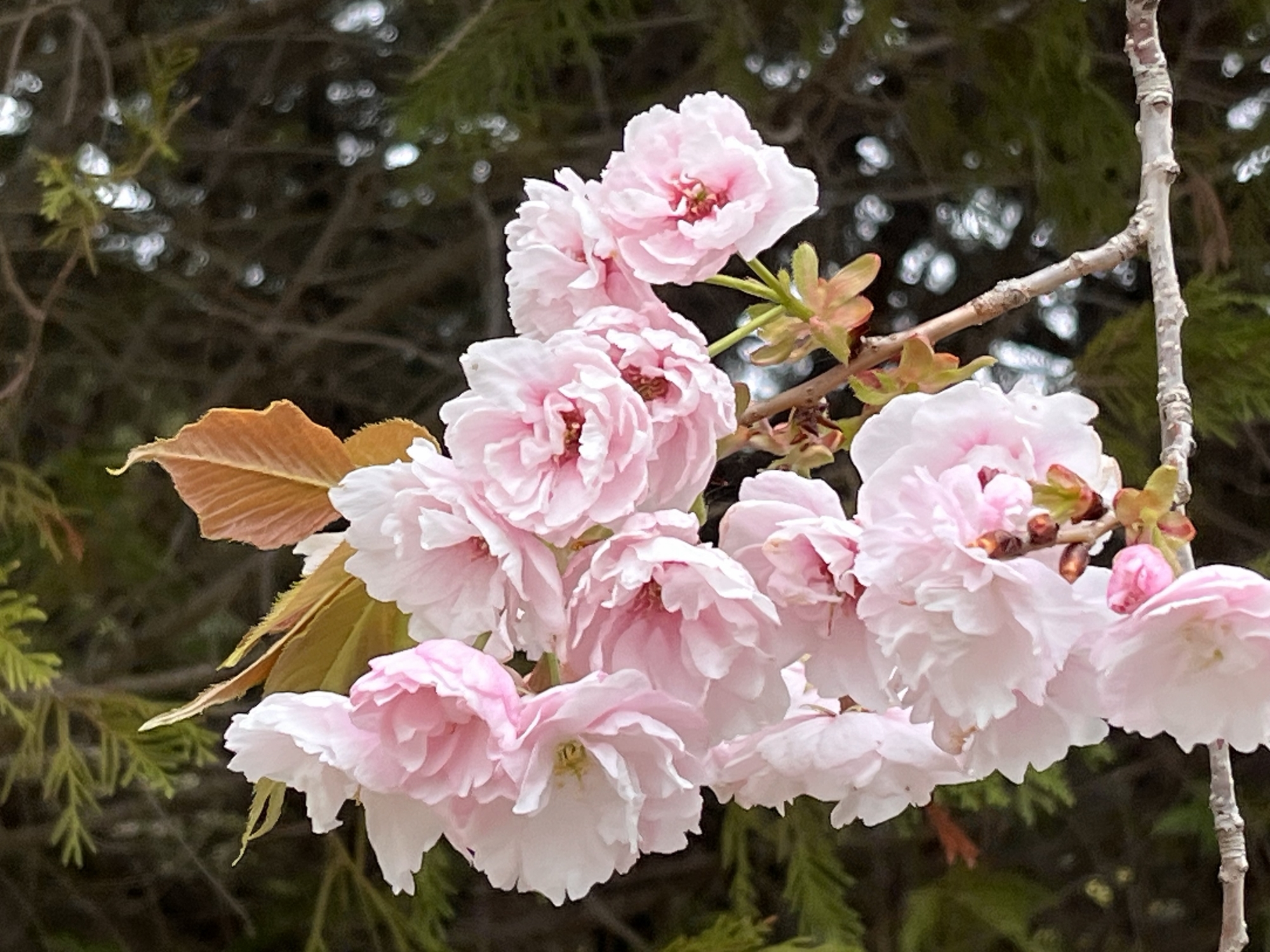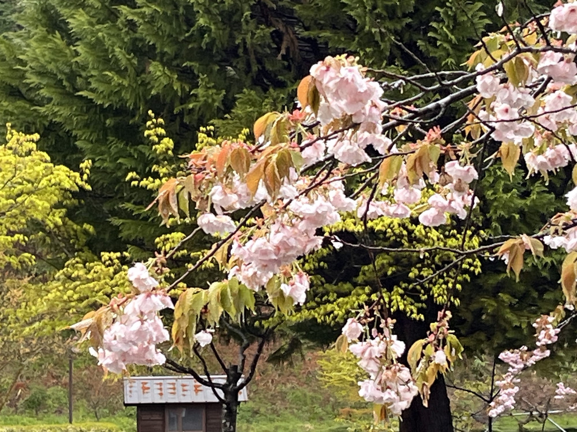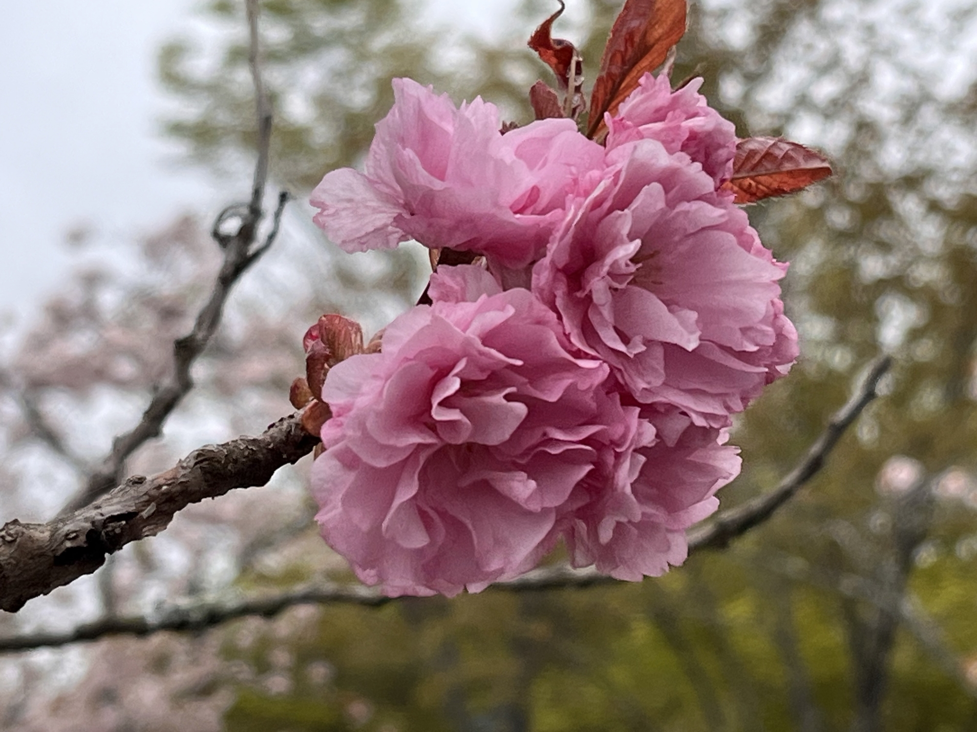 朝に続いて・・濃い色の八重桜も・・。