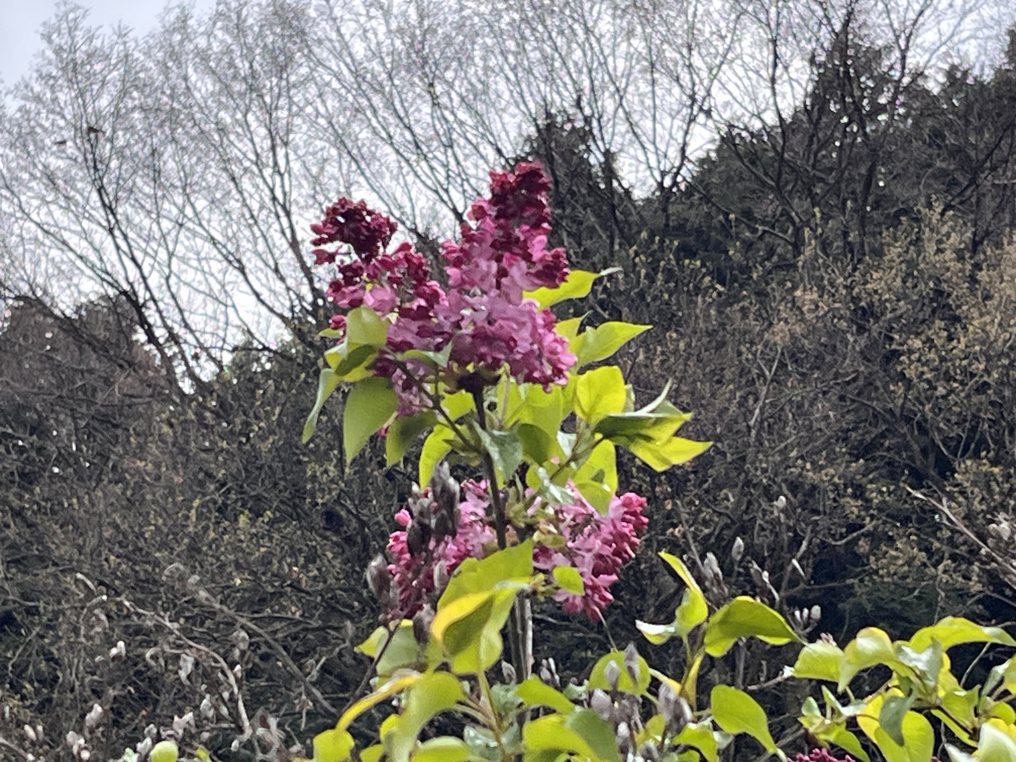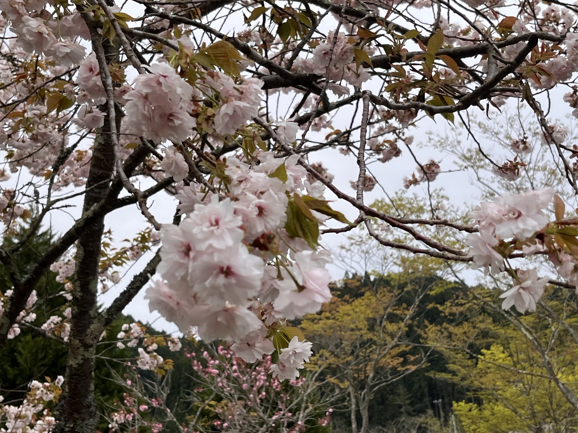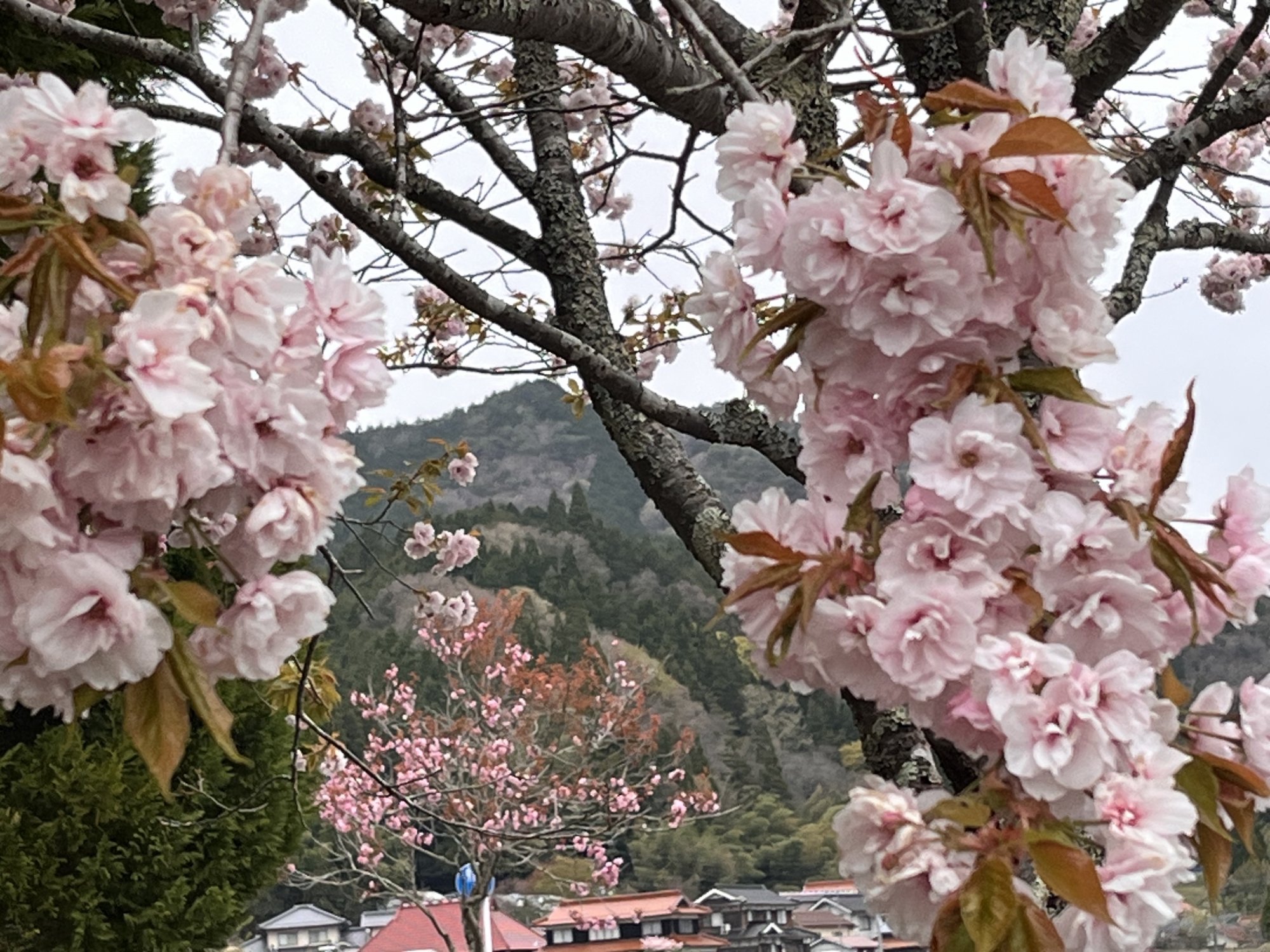 朝に続いて・・濃い色の八重桜も・・。