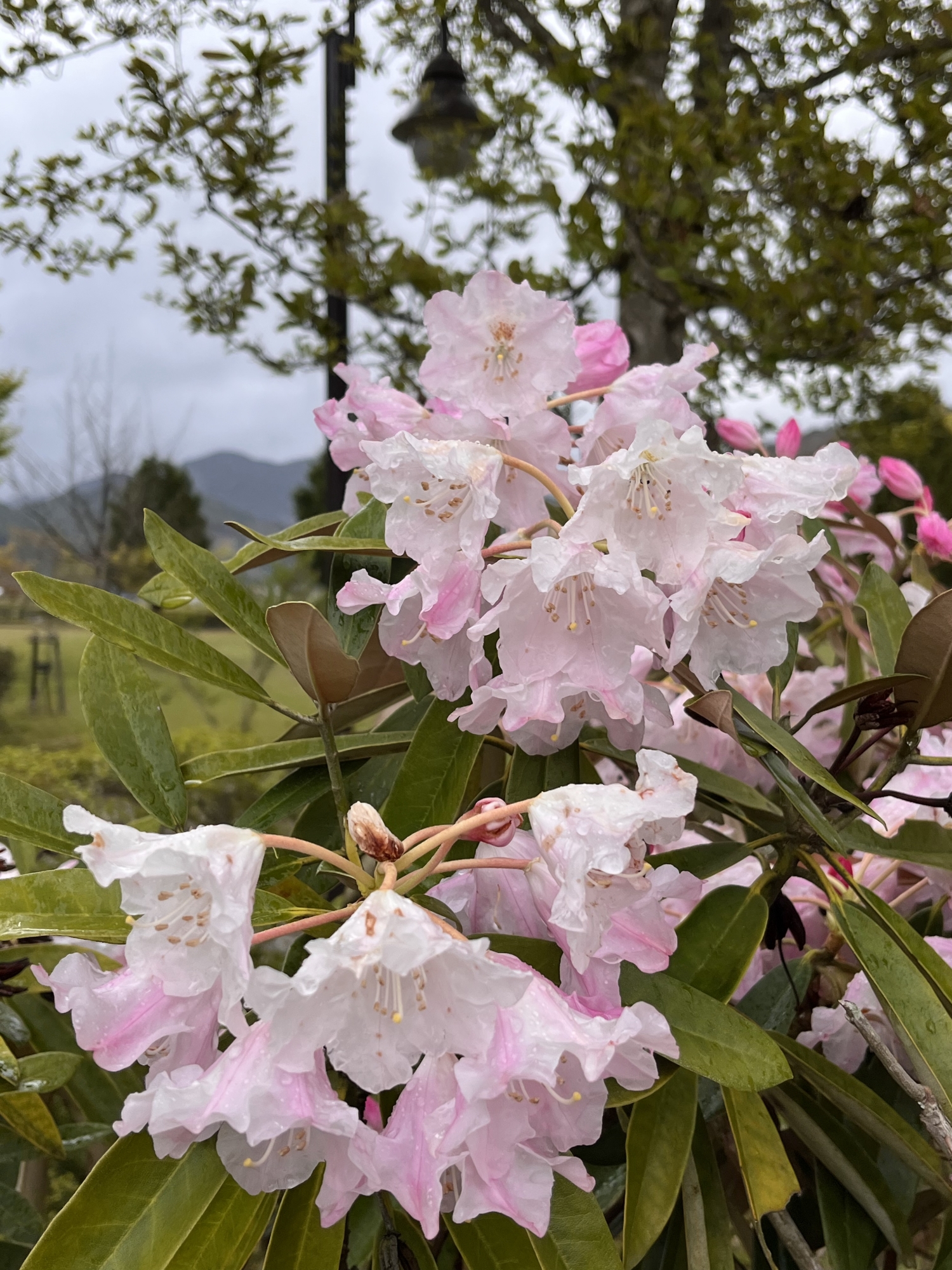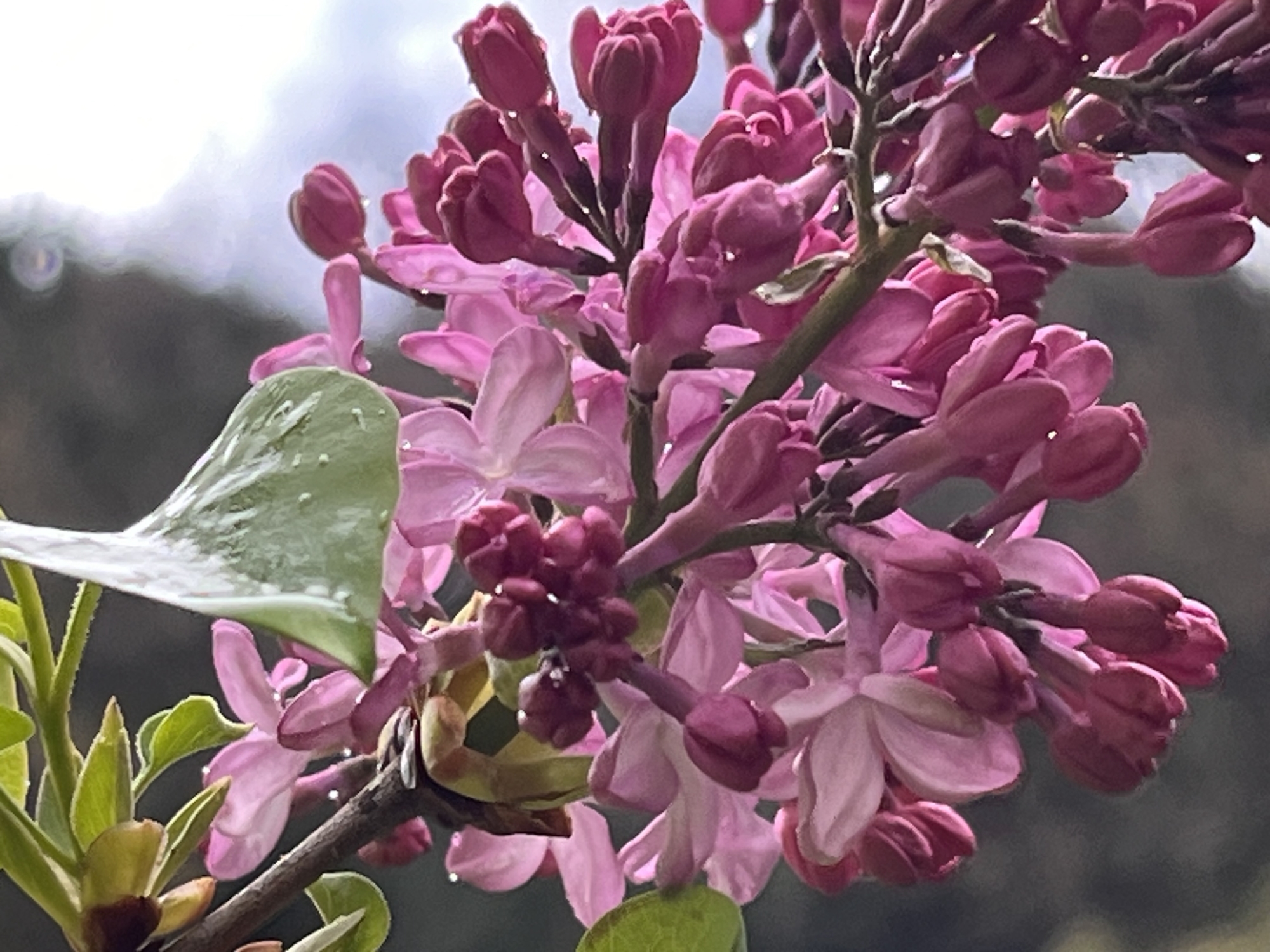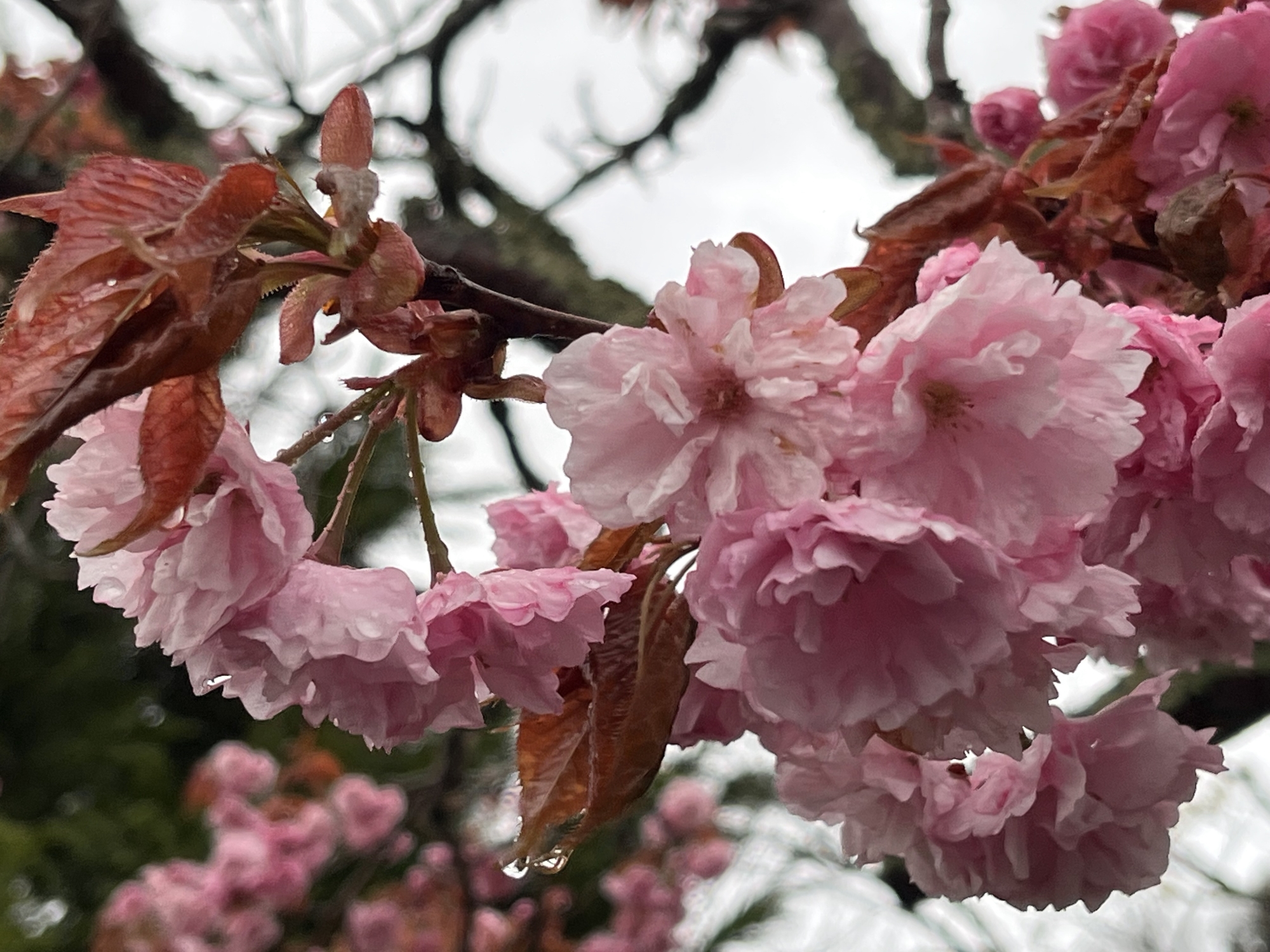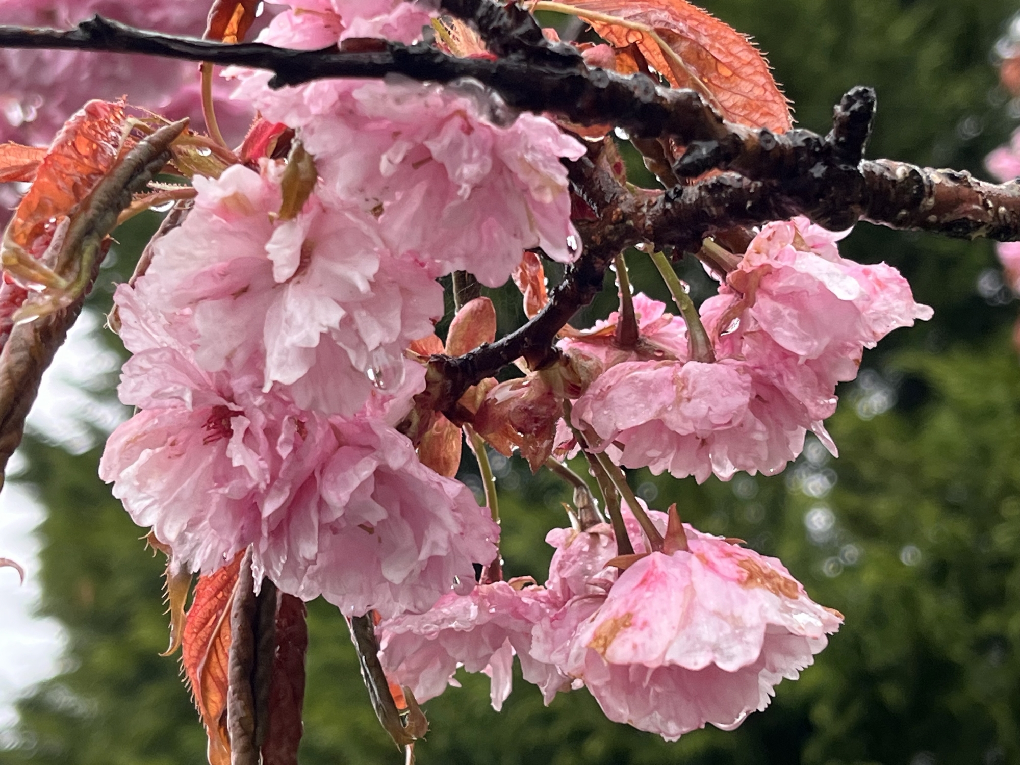 八重桜も雨に濡れています。