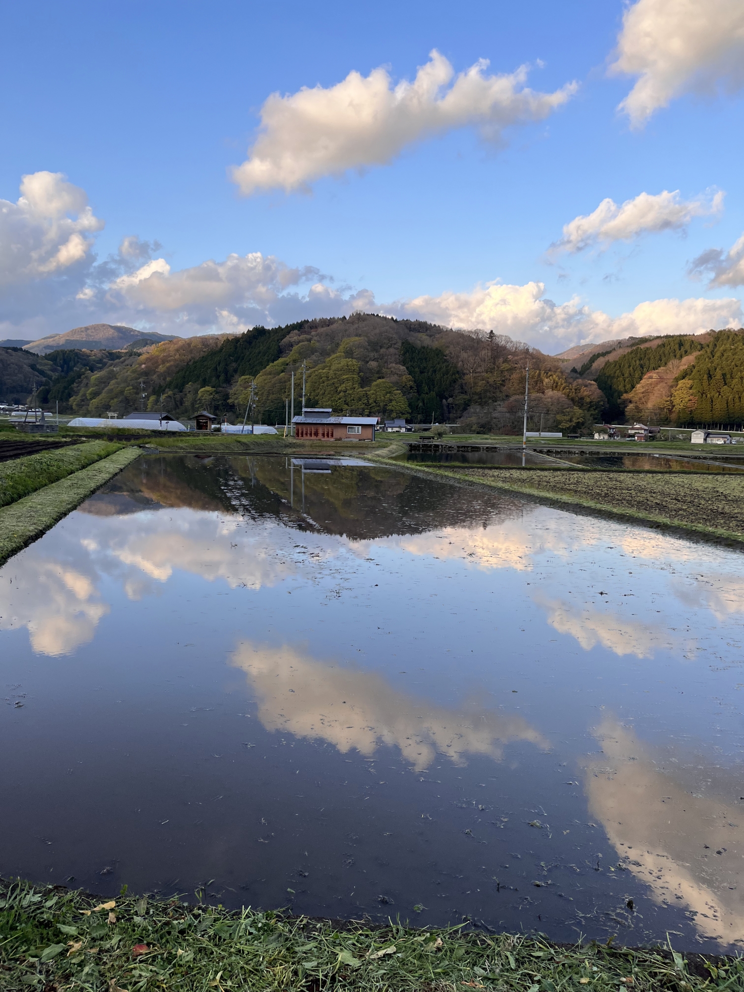 水が張られた田んぼには・・青空と白い雲。