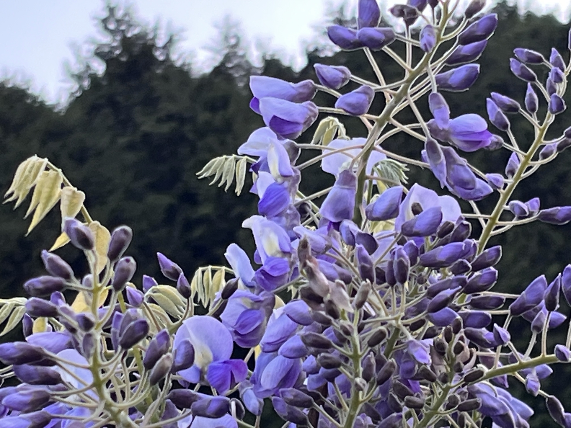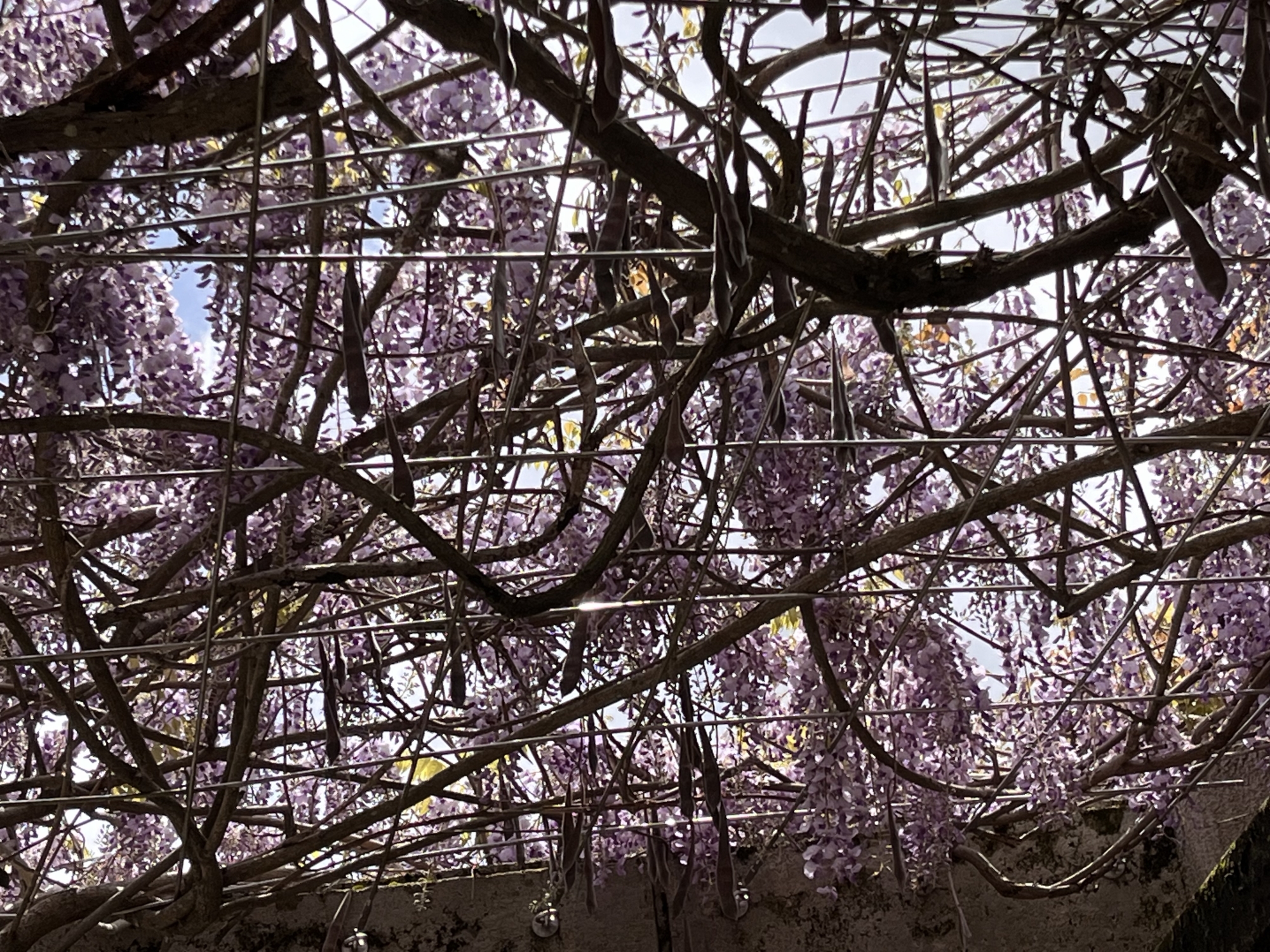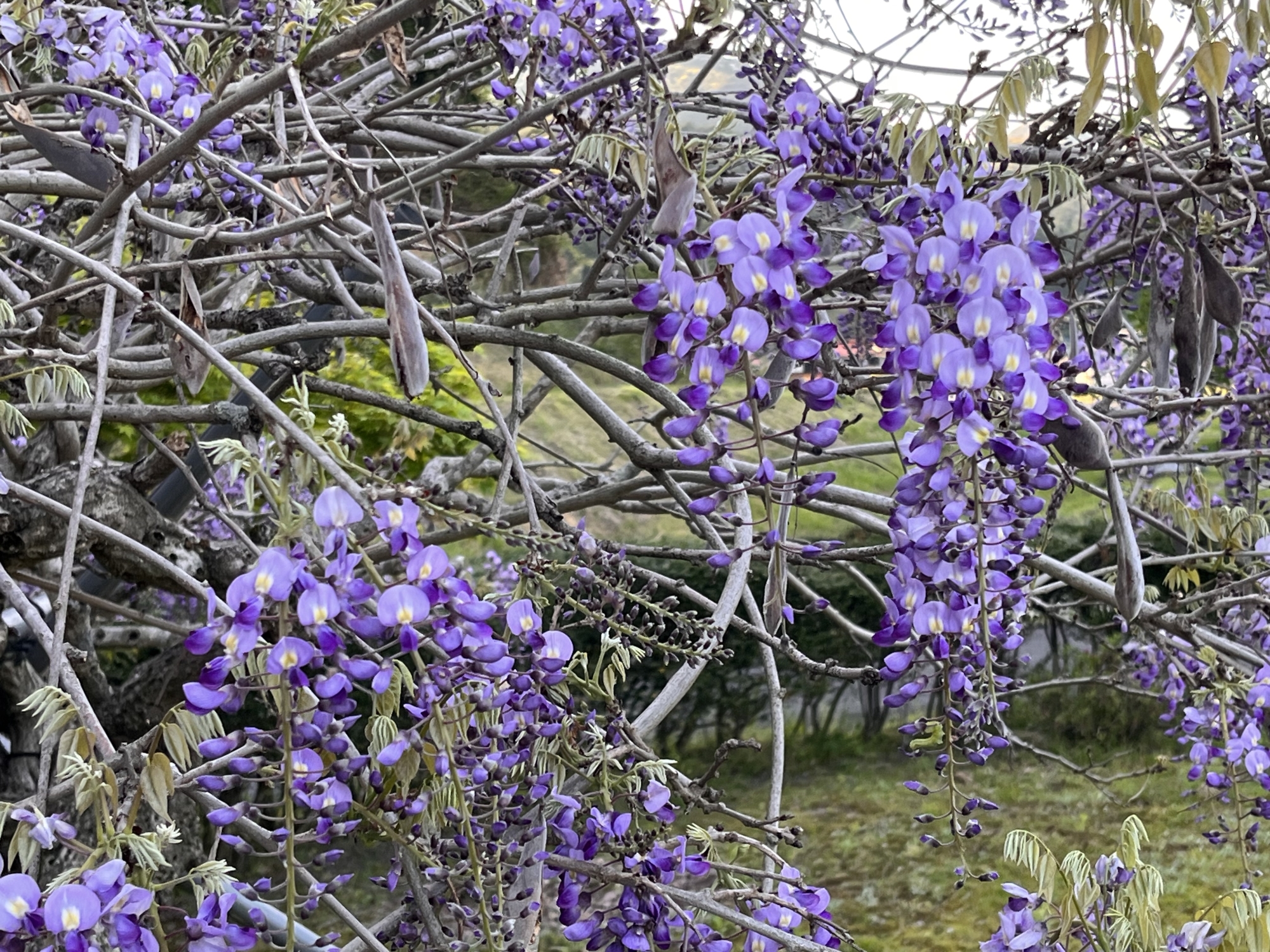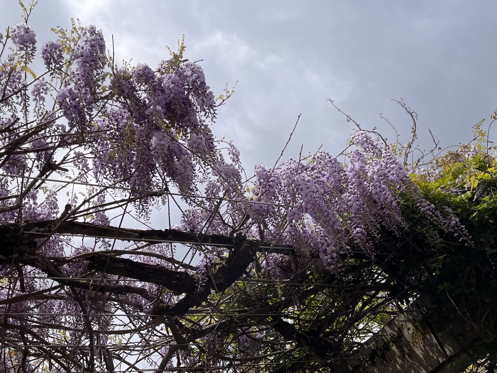 朝と昼は・・まだ厚い雲・・・整体所の処の藤棚も花が増えました。