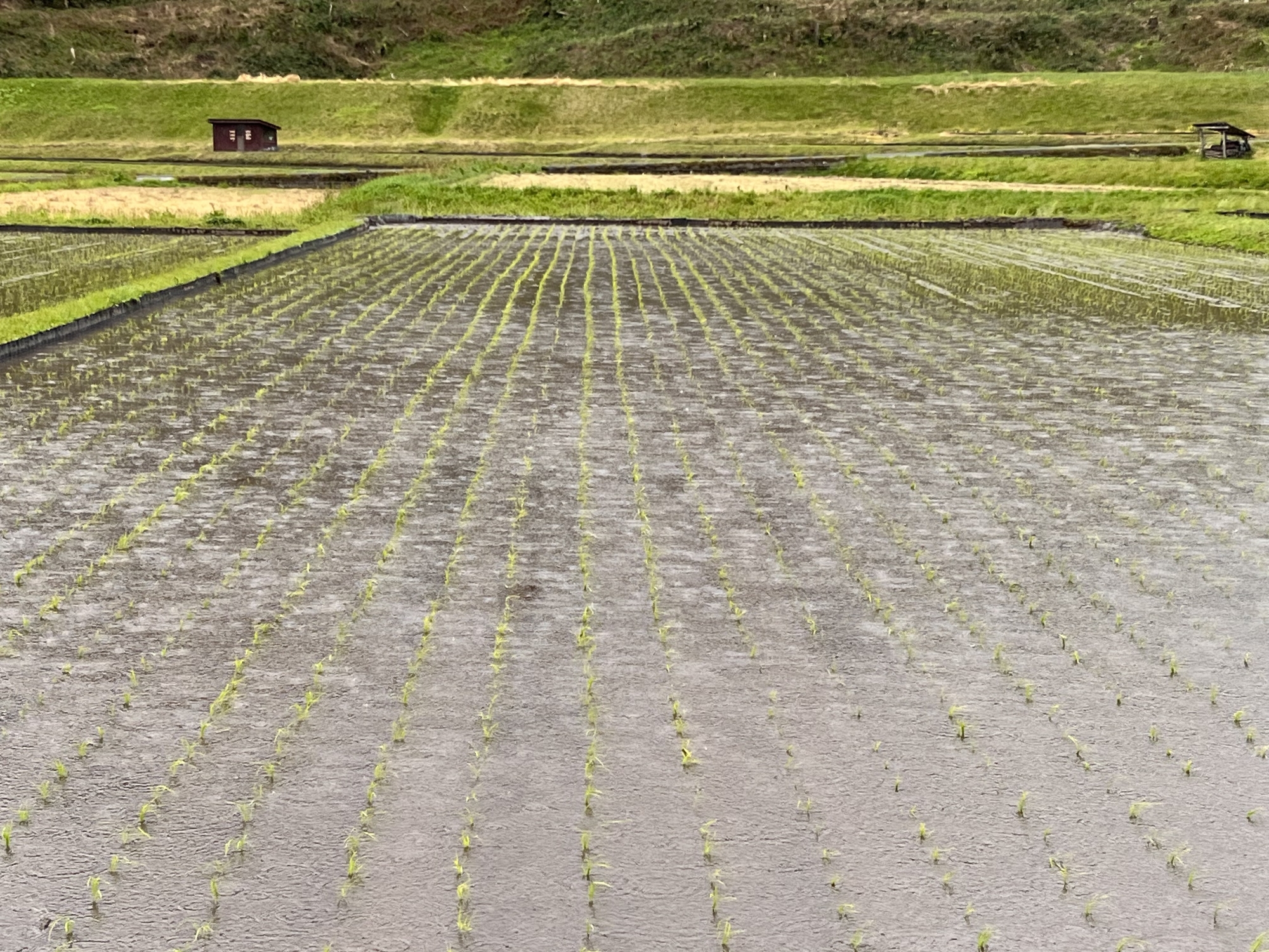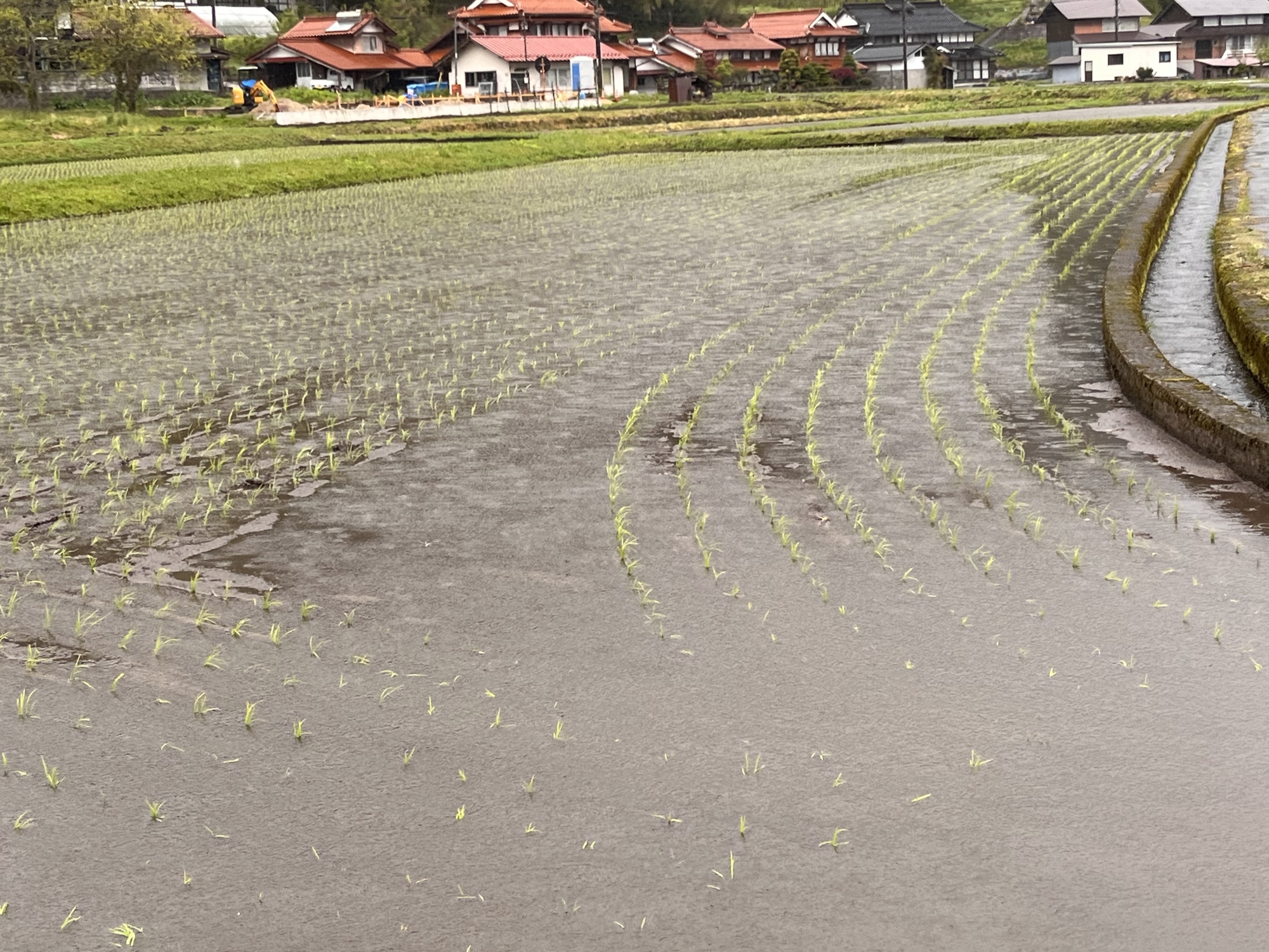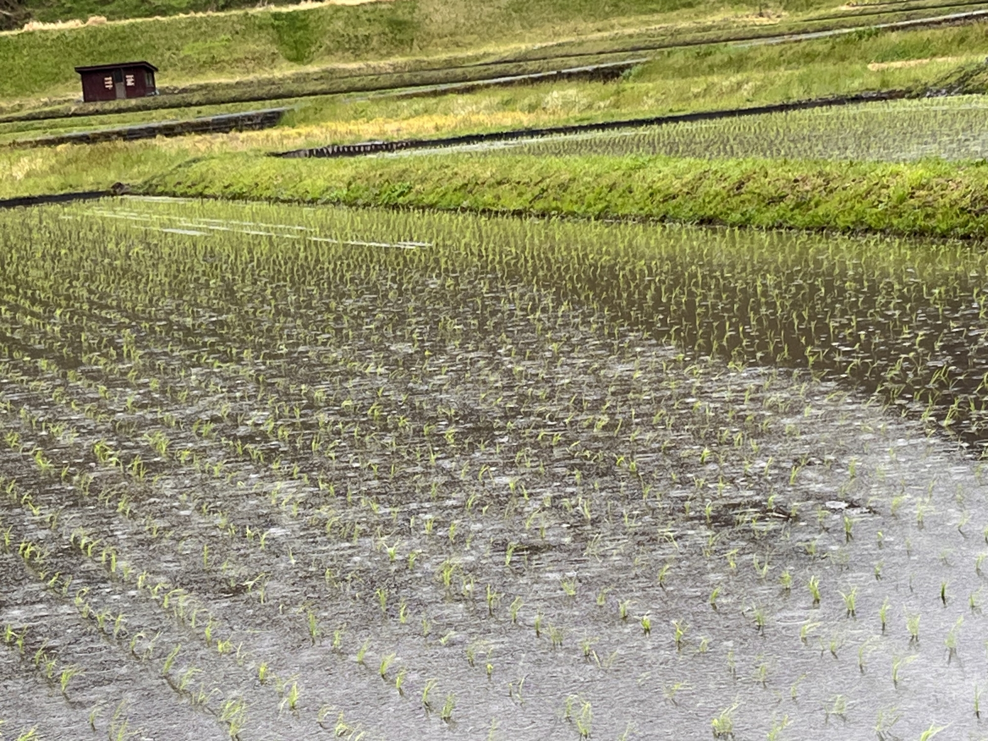 そして、仕事を少ししてて・・・あれ、雨も強くなってるけど、向こうの田圃は田植えも終わっているじゃんってことで・・・。