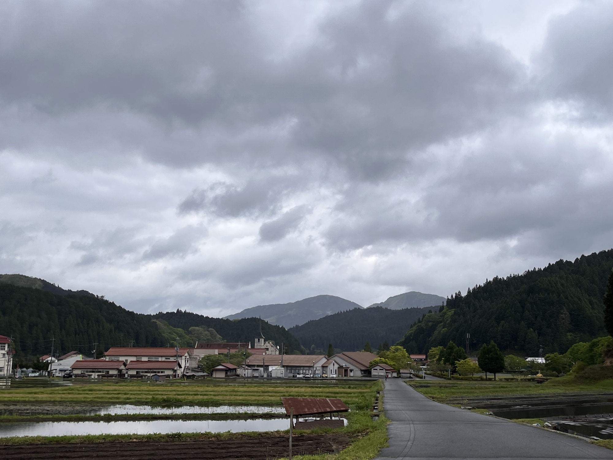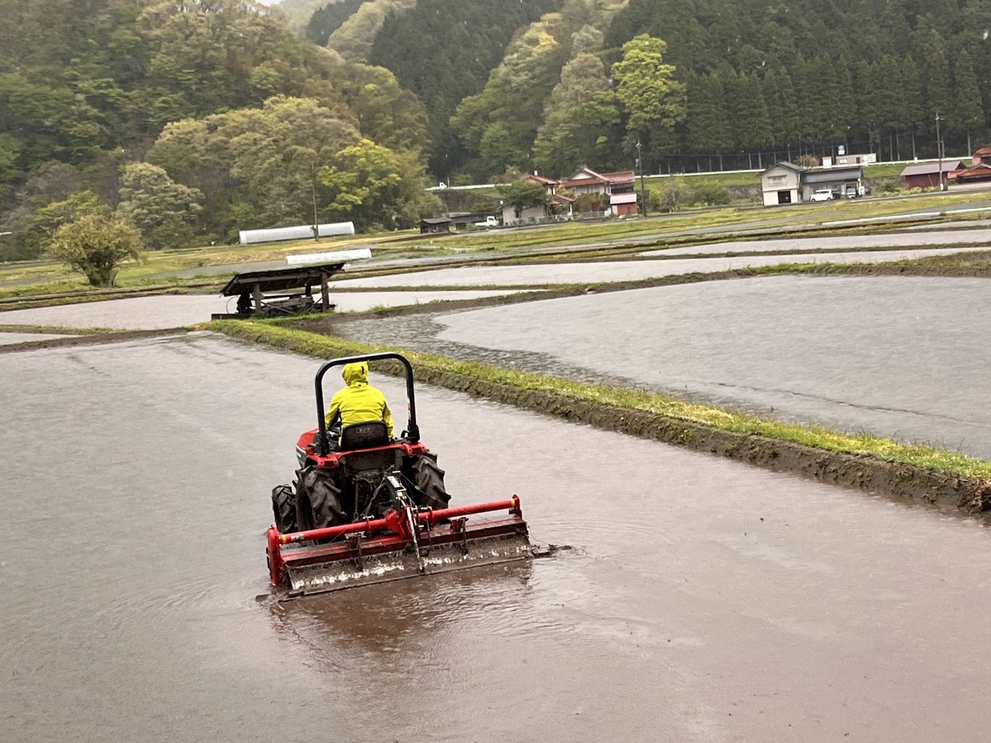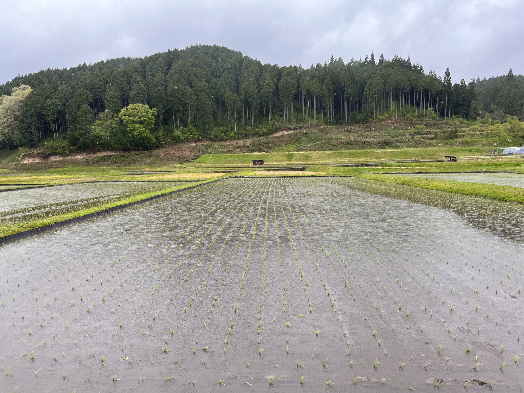 そして、仕事を少ししてて・・・あれ、雨も強くなってるけど、向こうの田圃は田植えも終わっているじゃんってことで・・・。
