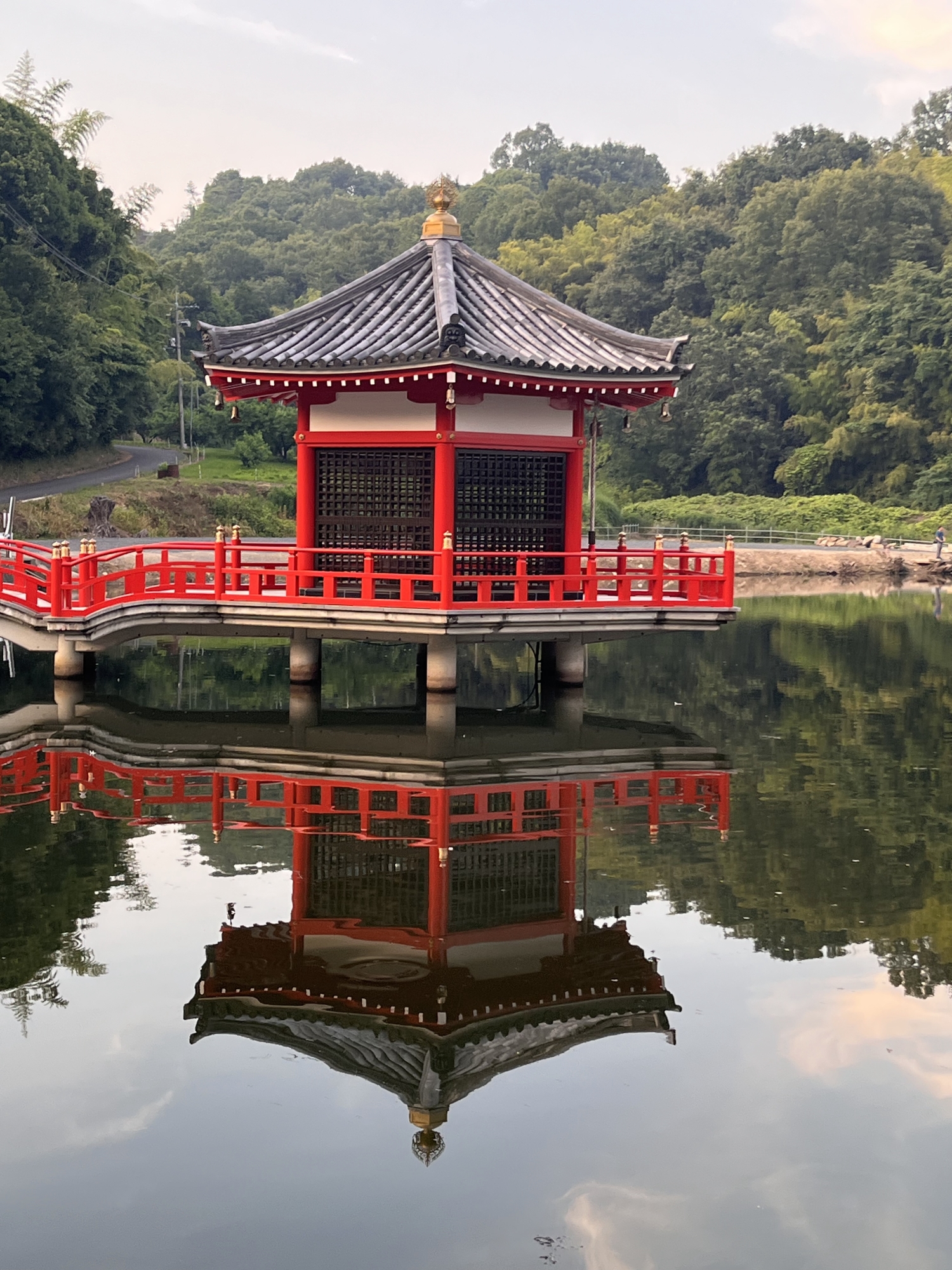 【伽藍:安養寺は倉敷と総社を結ぶ浅原峠にあり、寺社地正面には天王池と呼ばれる池に朱色の浮見堂が造られている。参道の石段にある楼門の上に大きな毘沙門天が乗り、その下には船の大きな碇が置かれている。境内に上がると毘沙門堂に高さ約26mの多宝塔、羅教堂、鐘楼、茶室などが配置されている。】