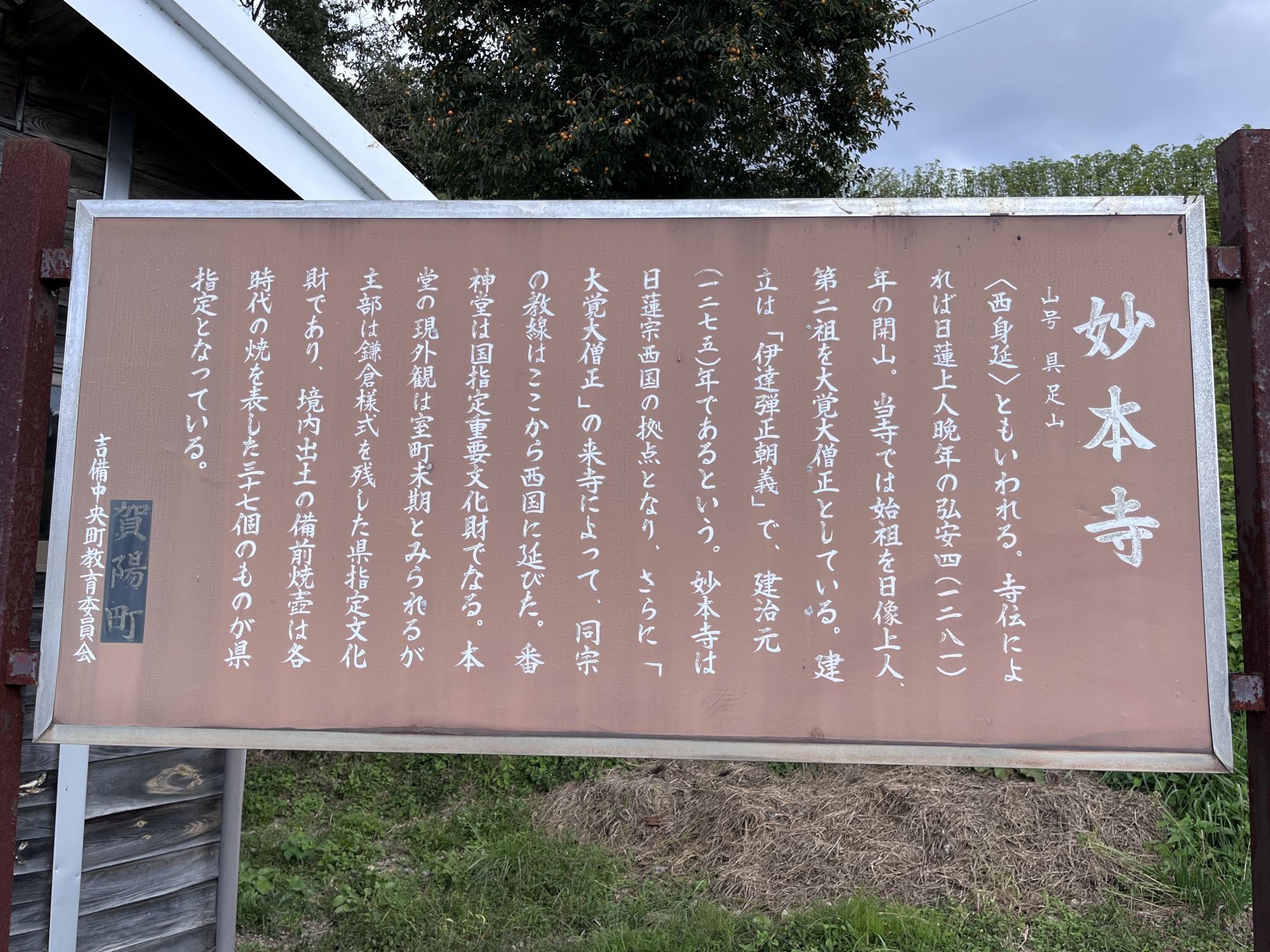 【妙本寺(みょうほんじ)は岡山県加賀郡吉備中央町に所在する寺院。宗派は日蓮宗。山号は具足山。本尊は久遠の本師 釈迦牟尼佛。】