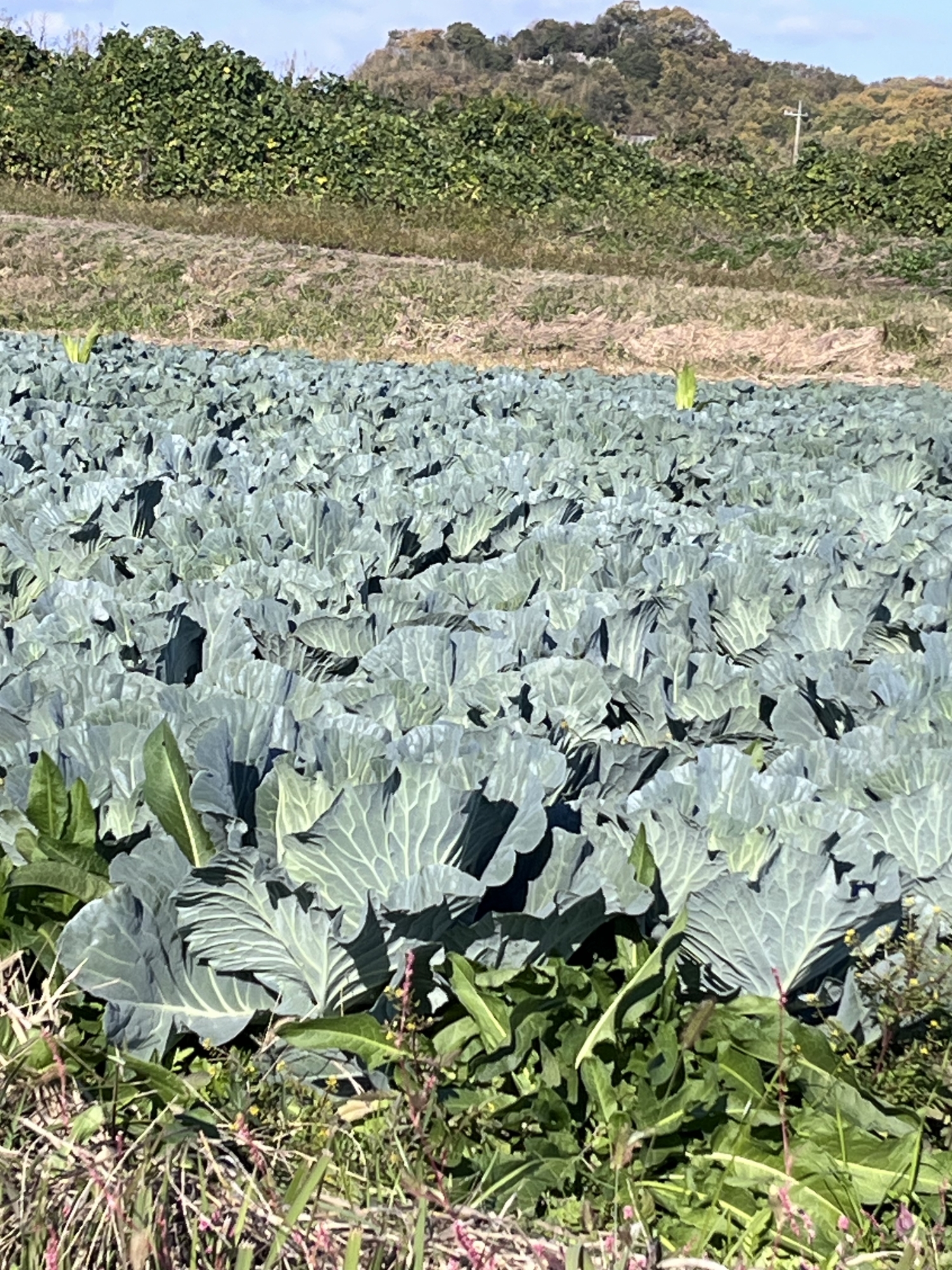畑に菊とキャベツ・・かな・・そして、案内板・・・