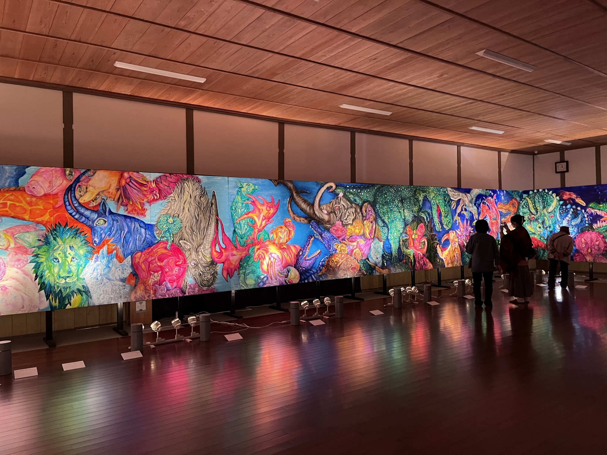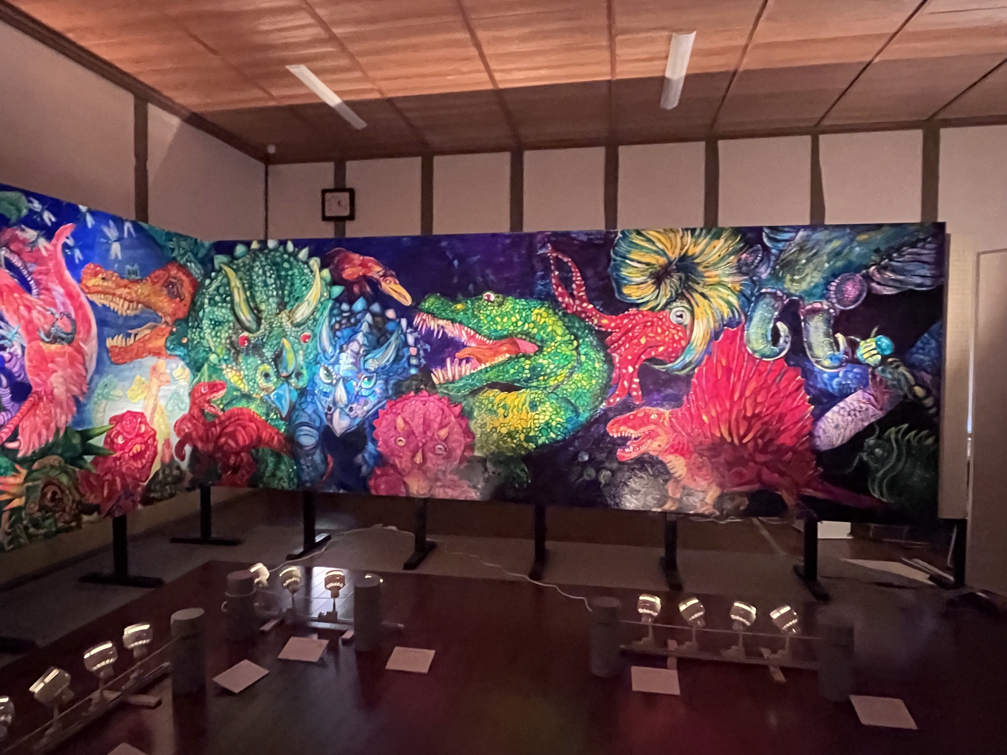そして、別棟では・・・石村嘉成展の吹屋小学校分:自閉症から、ご両親(お母様は小学5年時にご逝去)と、支える美術関係を含めた先生方の力で、アートに目覚めて、活躍されている若者です。ここでは、全長26mの大パノラマのアニマル・ヒストリーを、観ることが出来ました、素晴らしい熱量でした。