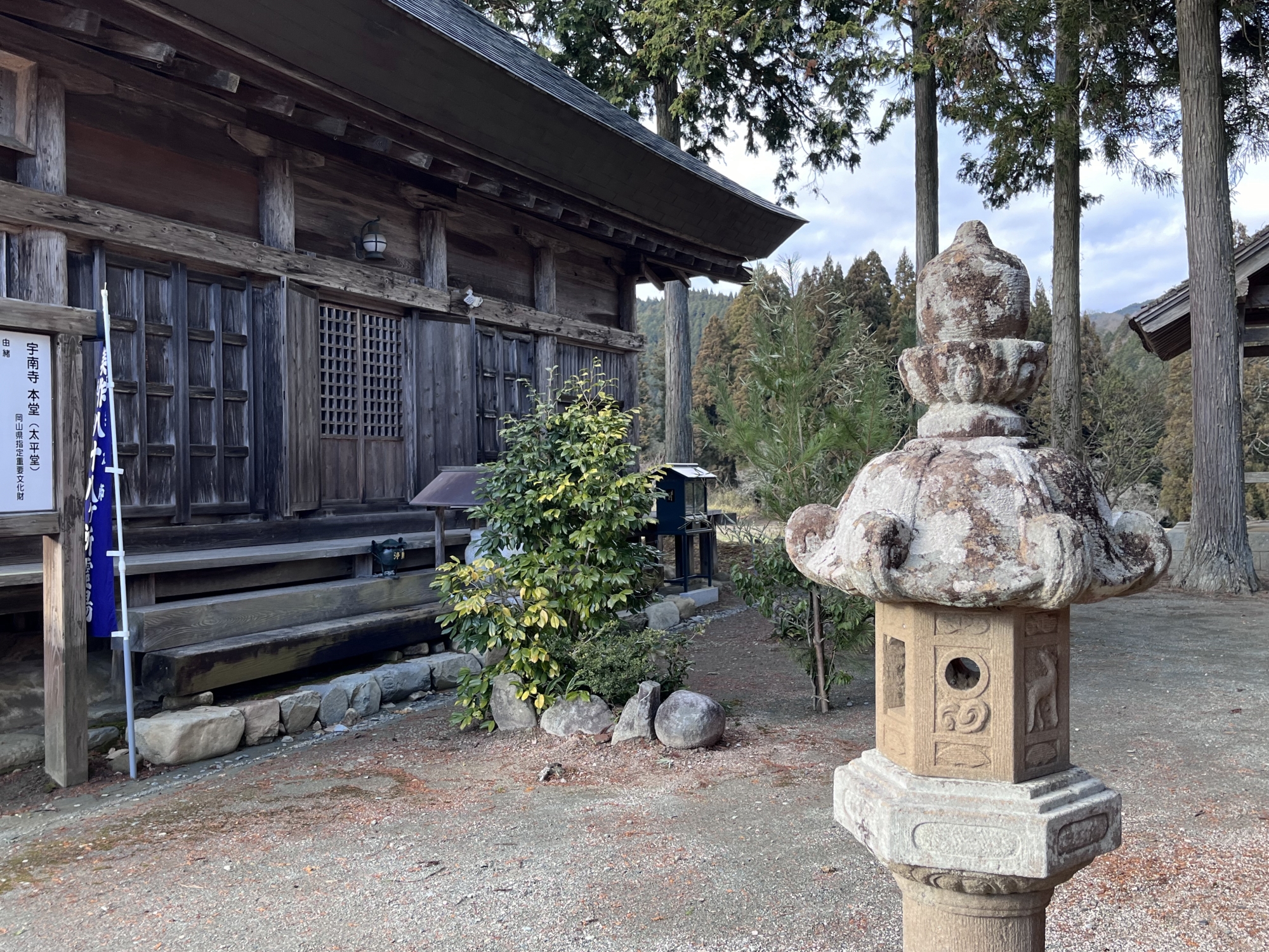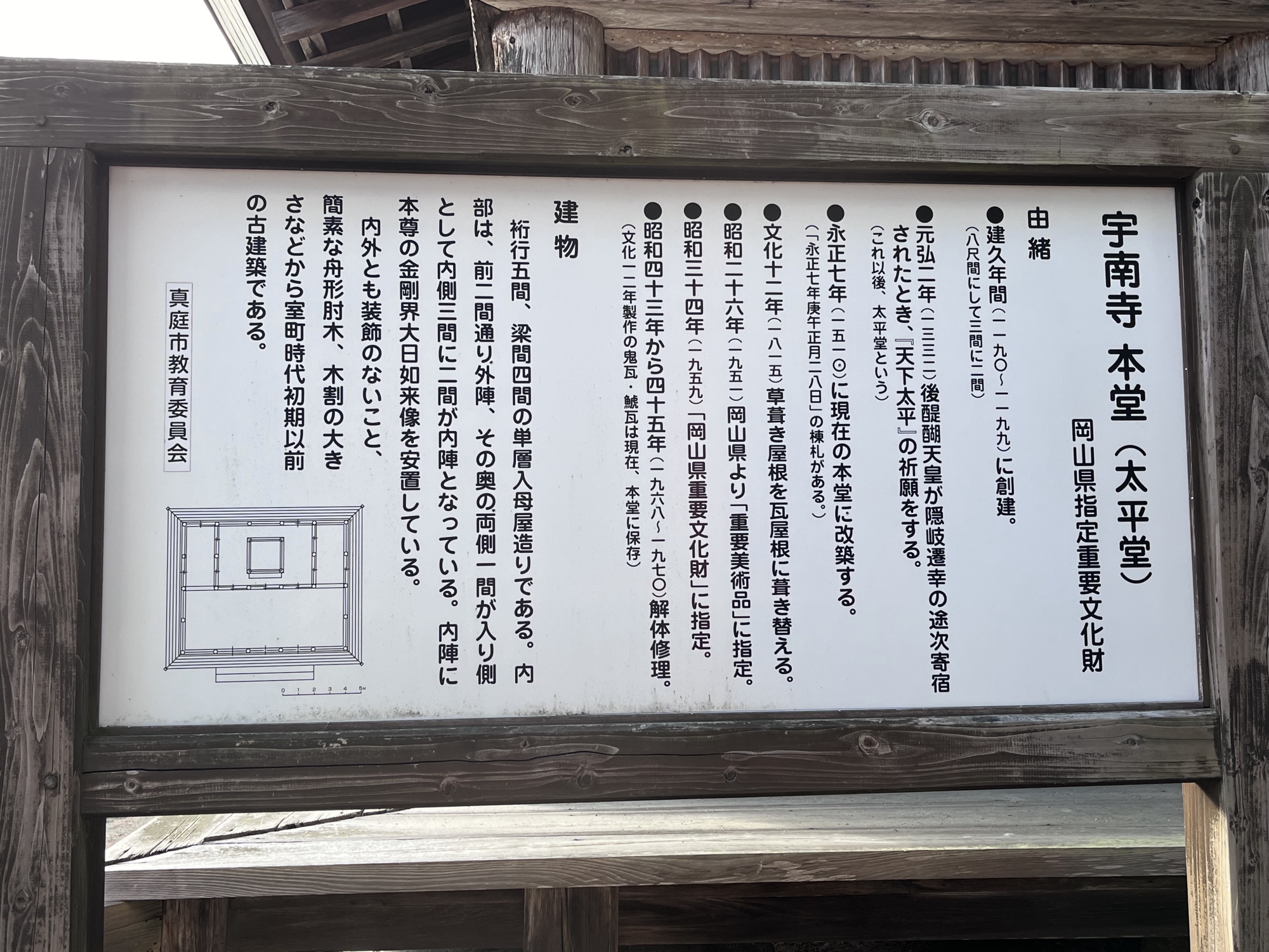【1691(元禄4)年に編纂された美作西部6郡の官撰地誌「作陽誌」には、室町・戦国時代、美甘庄の農民の代表52任が毎月28日に当寺に集まり、村政の運営を討議・決裁し、酒食をとって散会したとあり、これを「宇南寺寄合」と称したという。】だそうです。