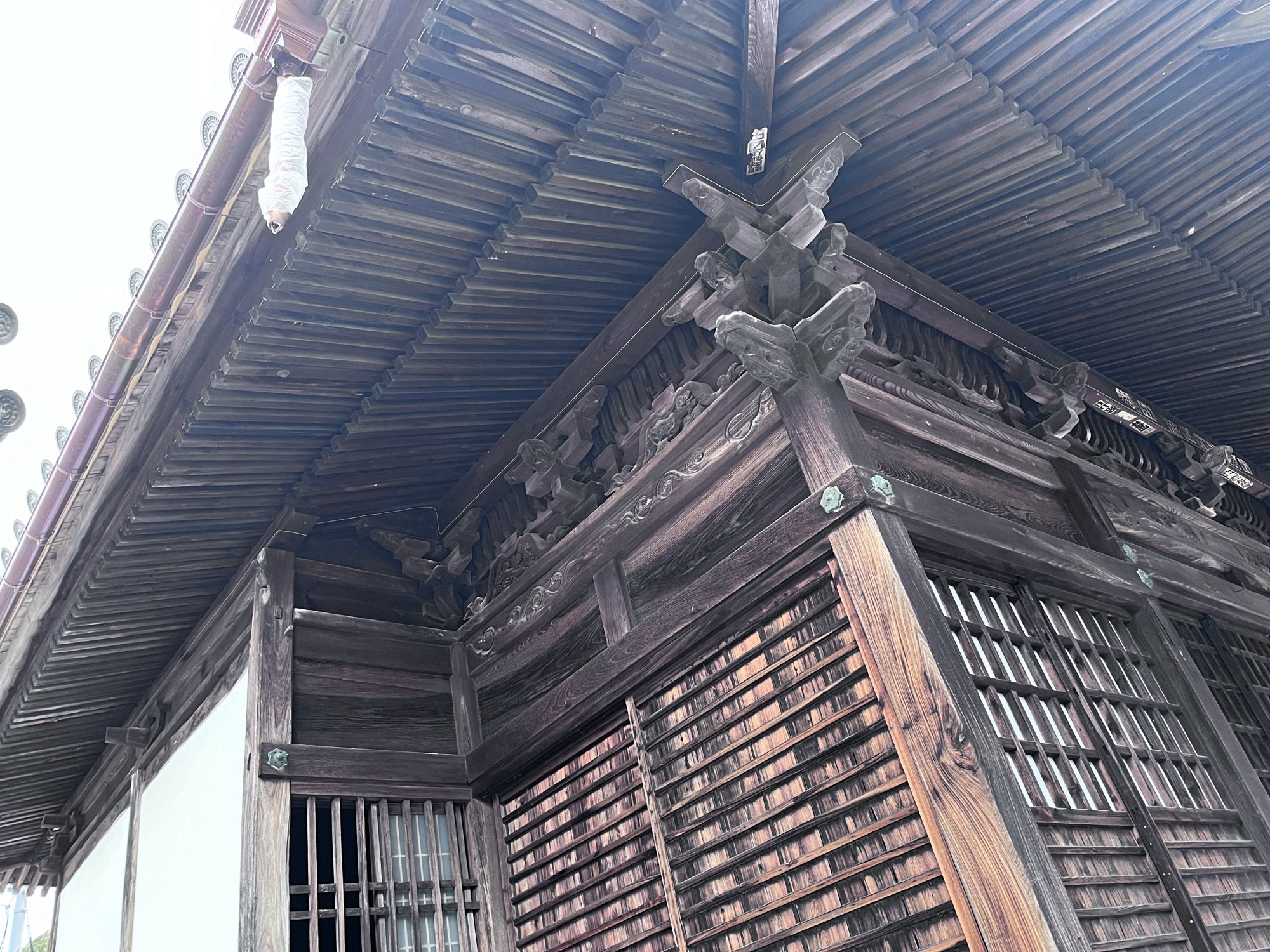 【本堂右にある観音堂には、秀吉が朝鮮へ出兵をした文禄の役(1592~1593)の総督、岡山城主・字書多秀家の御座船の格天井と船戸があります。】