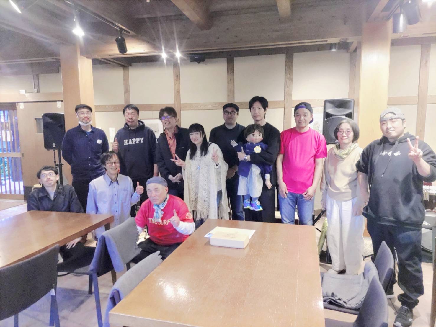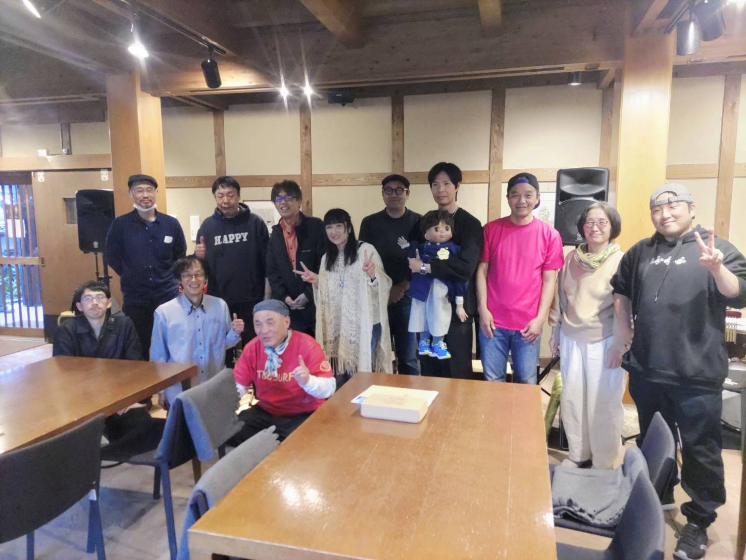 そして、なぜか、大西貴也監督!新庄村ドキュメンタリー映画「村ぞ、生けり」、そして、大槻も出演した「ミネルヴァの梟」の監督、大西貴也氏も、ご参加下さいました。7月7日に、天神山プラザで行う予定の「シネマ・ジャンク」のPR(上映会)も兼ねて。なので、ボクも急遽「ミネルヴァの梟」、オリジナル・サポートソングを弾き語りしました。