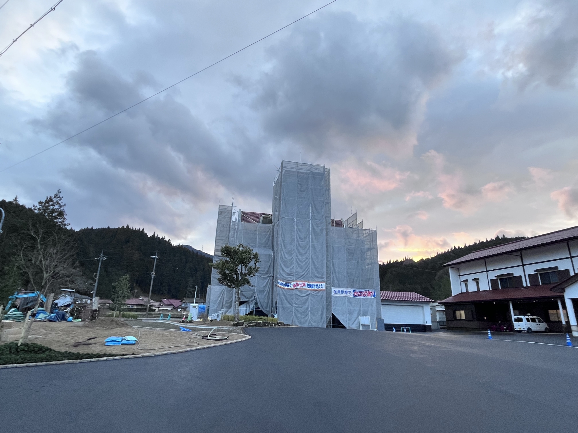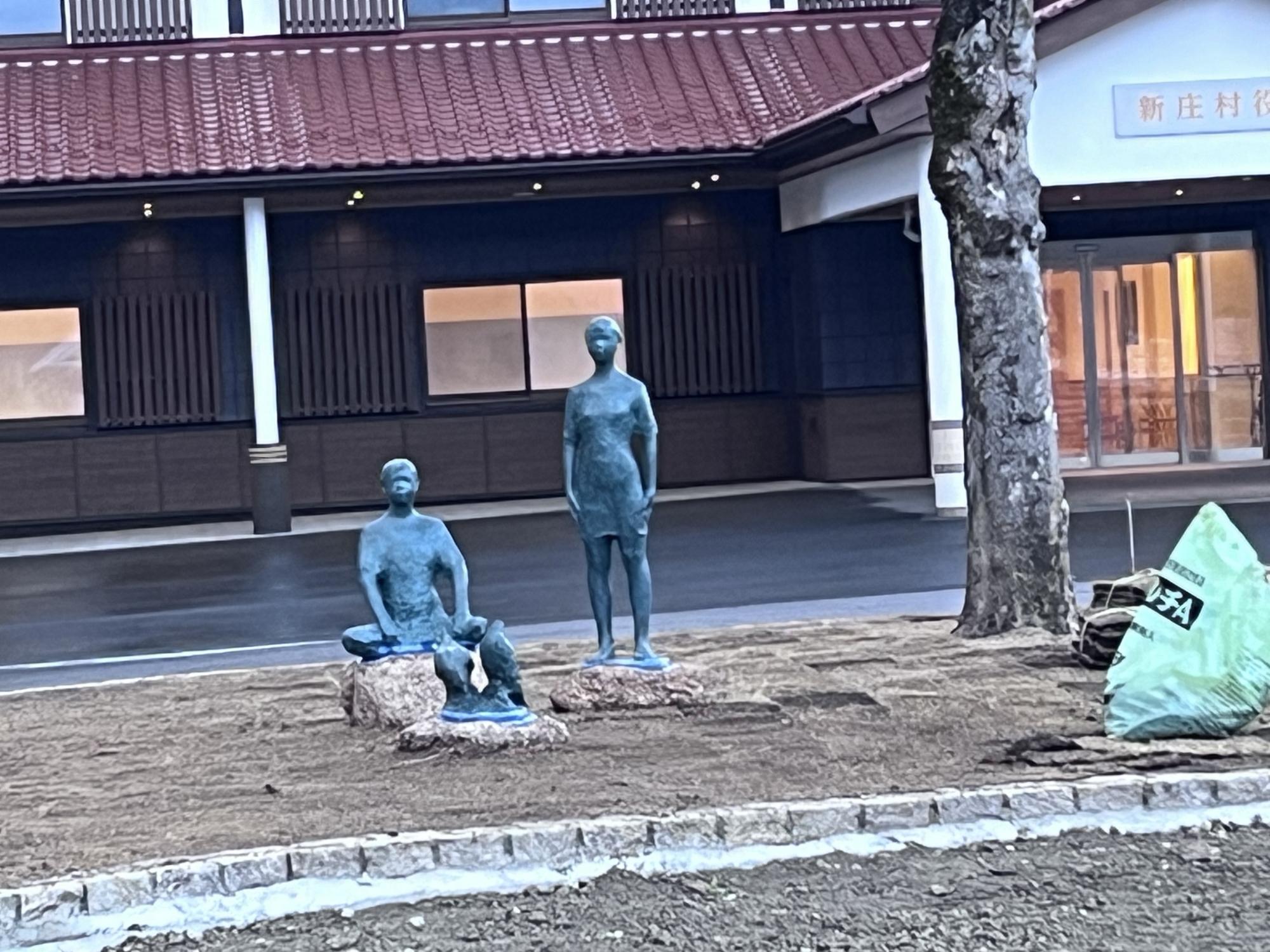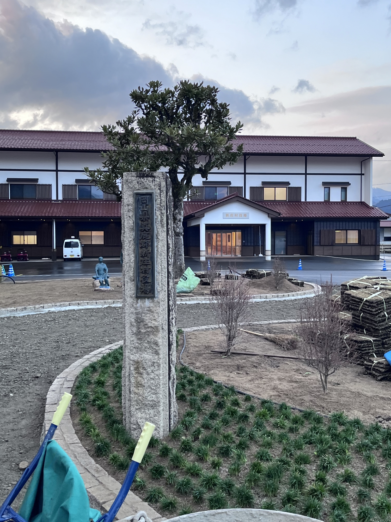 そして、終わって築いたのですが、役場前の広場の工事も進んできて・・・アスファルト舗装も、そして、モニュメントっていうか、彫刻も、植栽も。