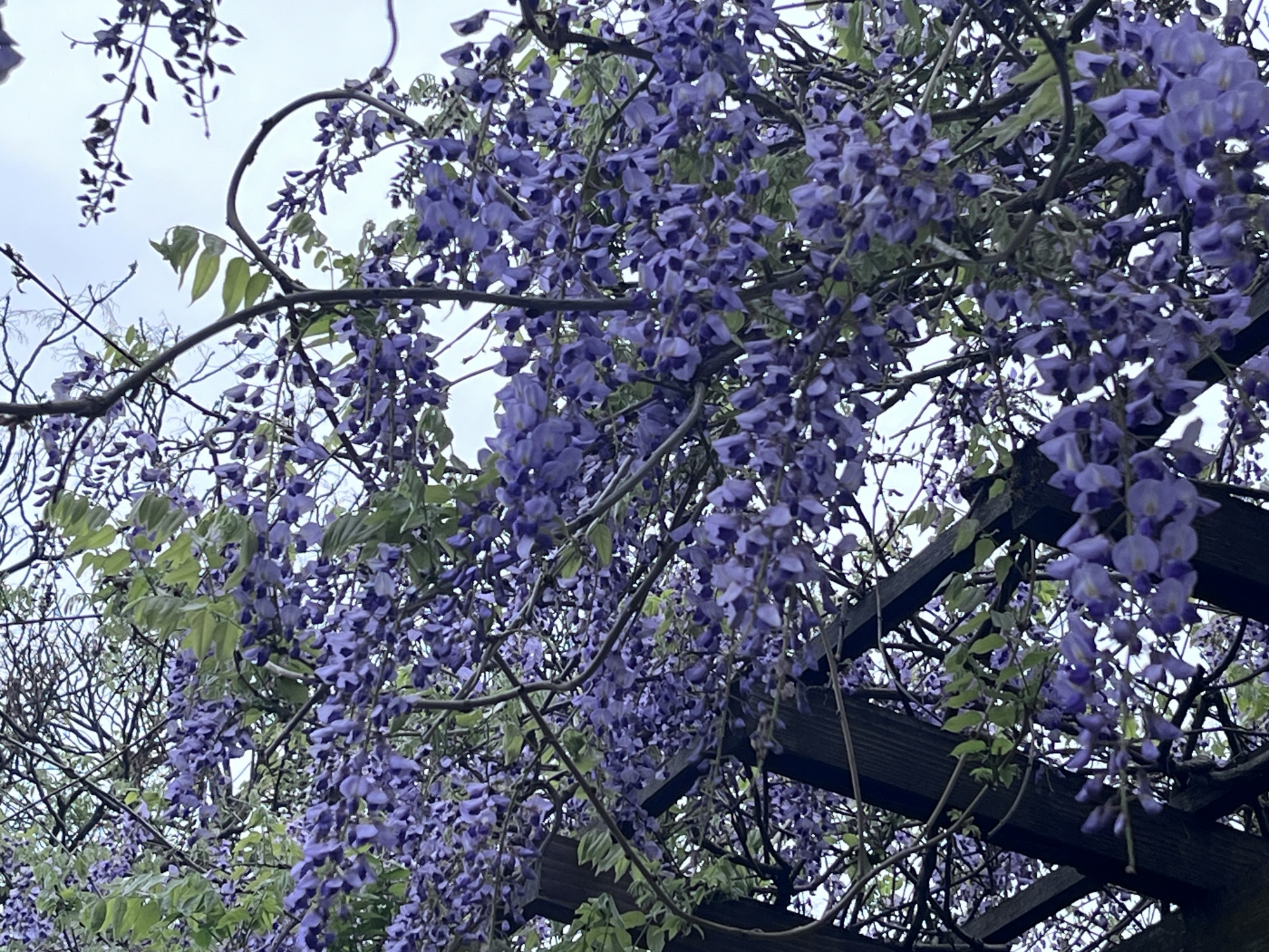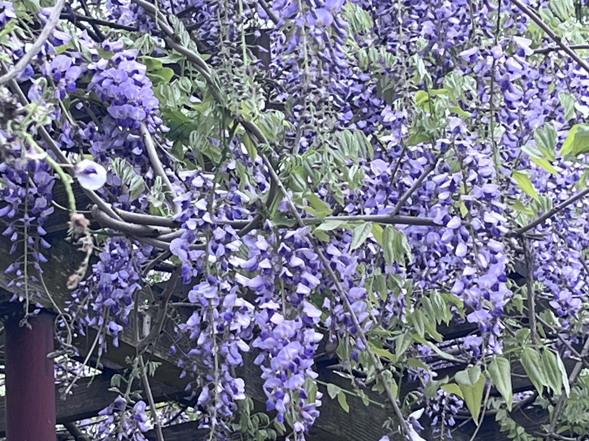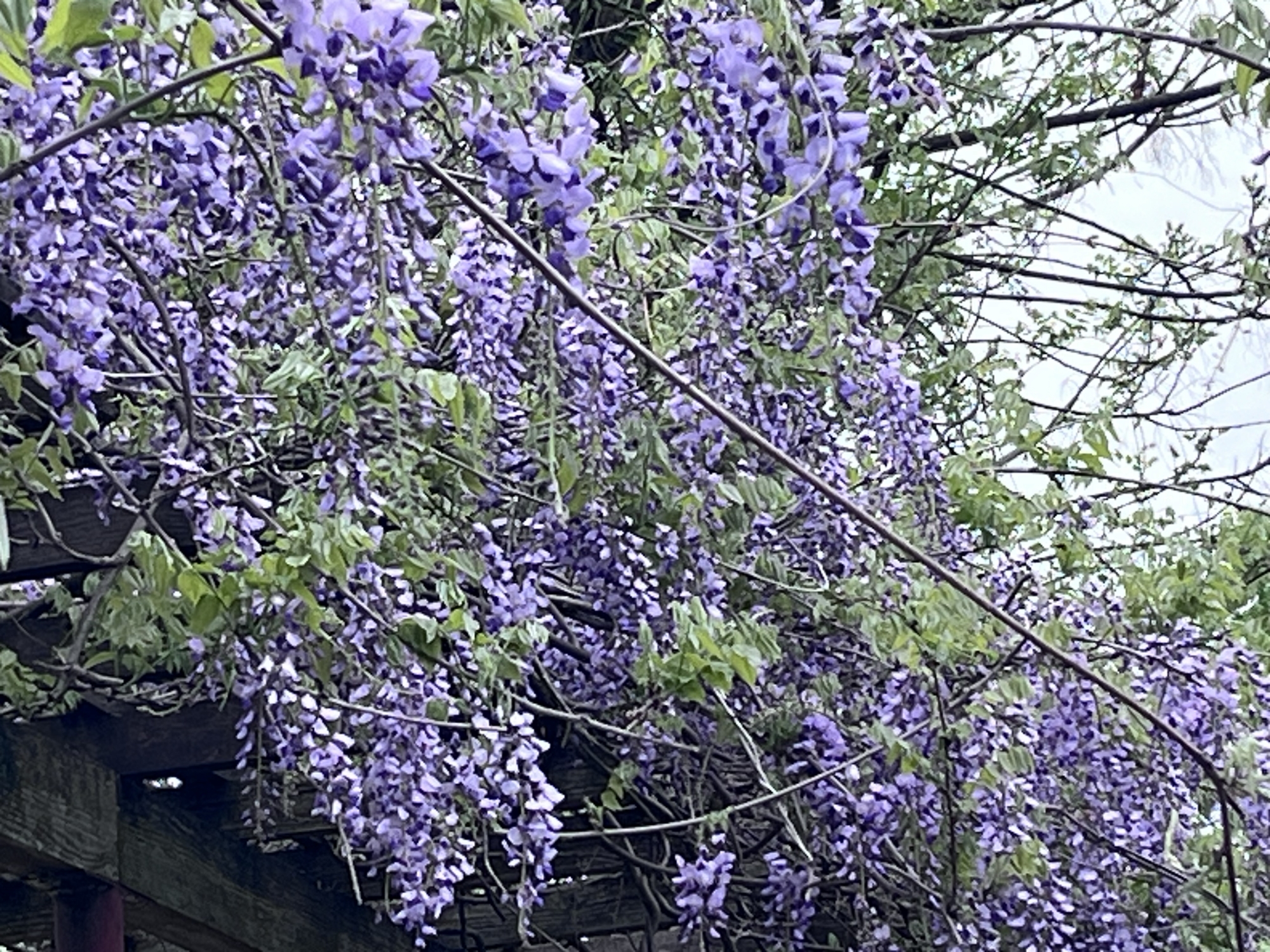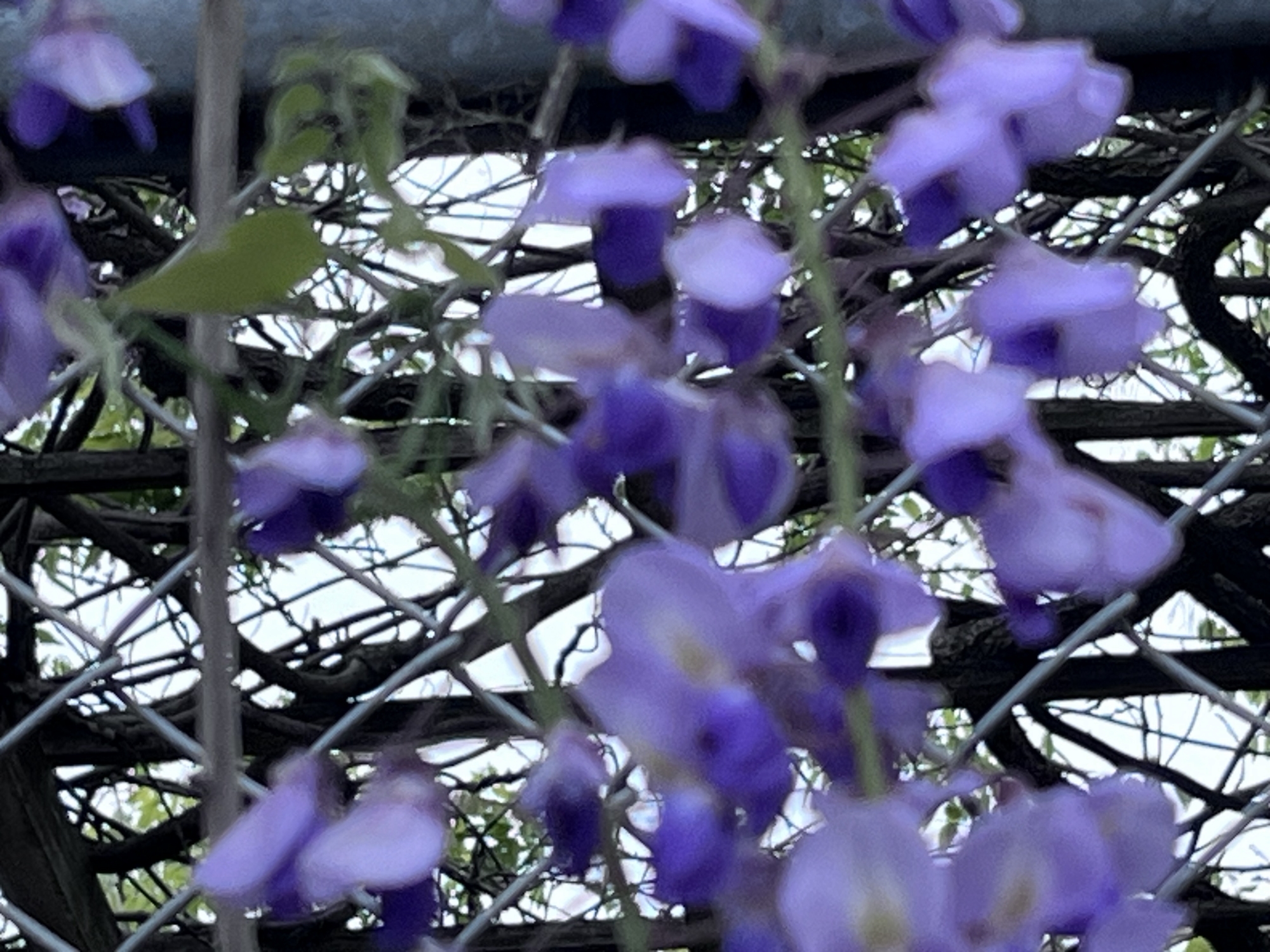 斜め向かいは、総社東小学校・・・フェンスから藤棚の花が、はみ出していました。