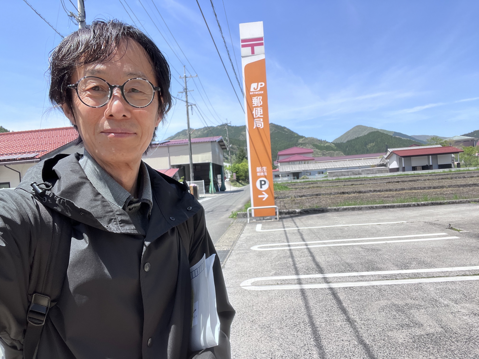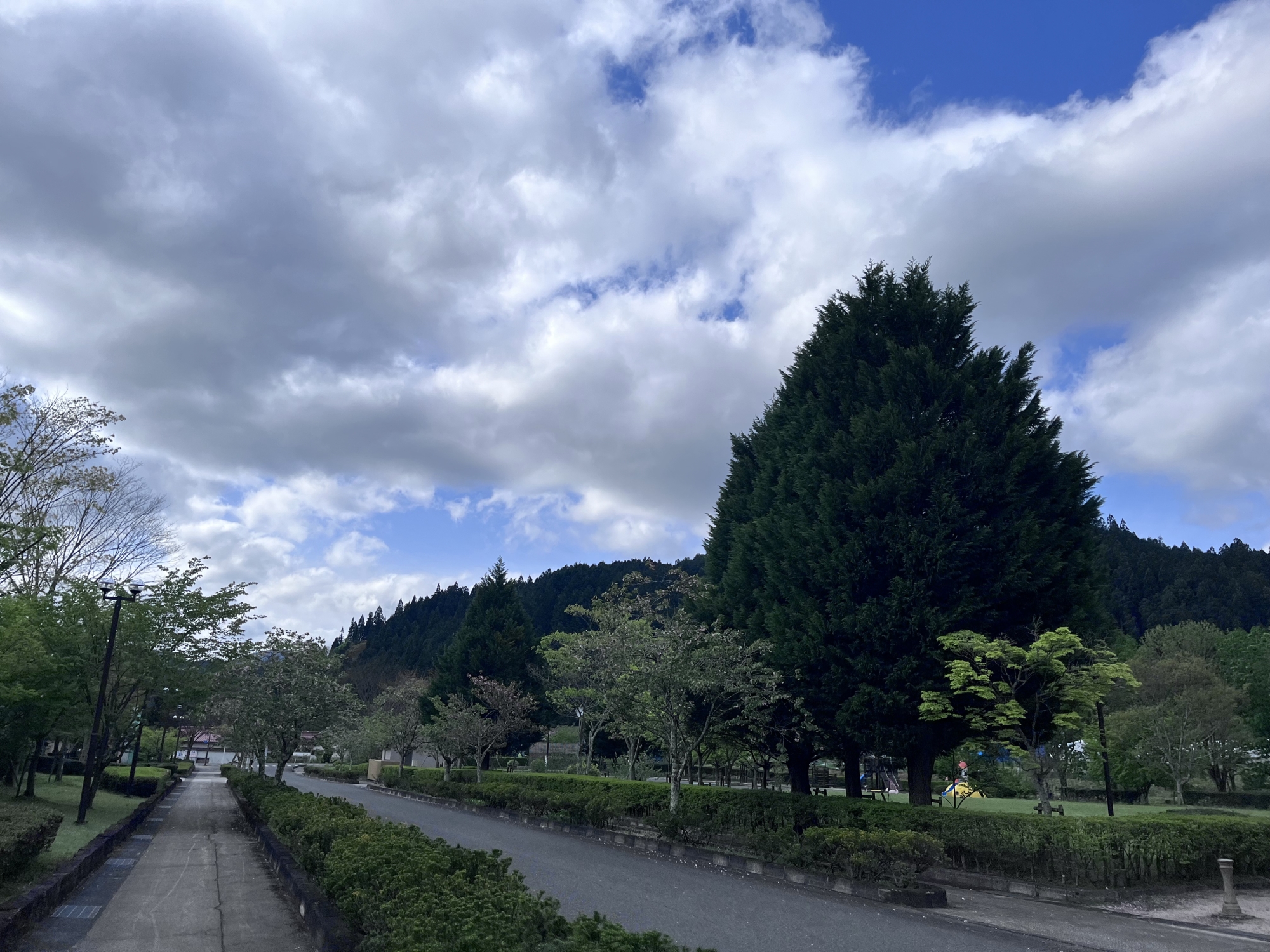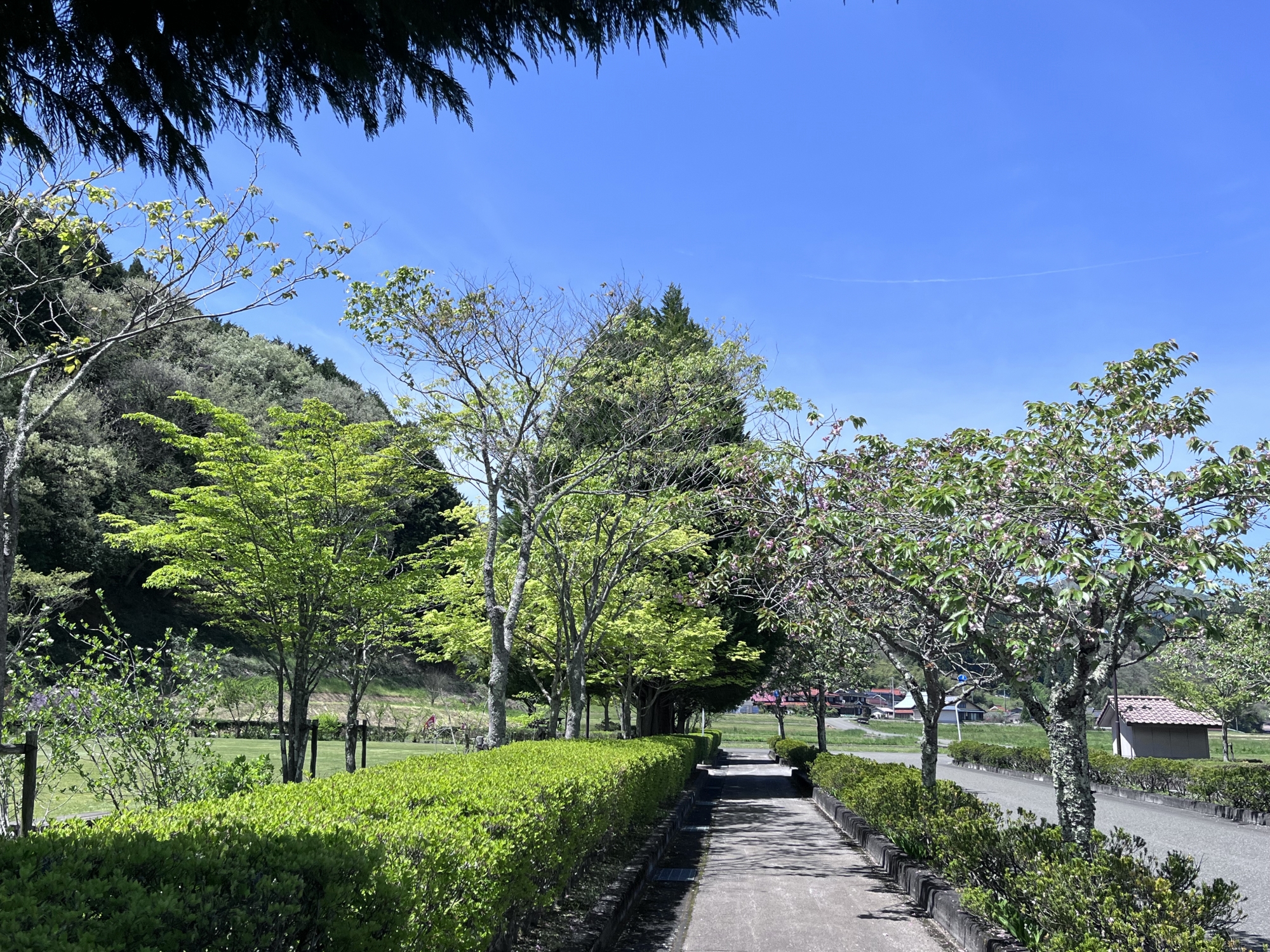 昼にはポストからの役場・・で、職場横の花壇とすっかり緑の枝垂桜。