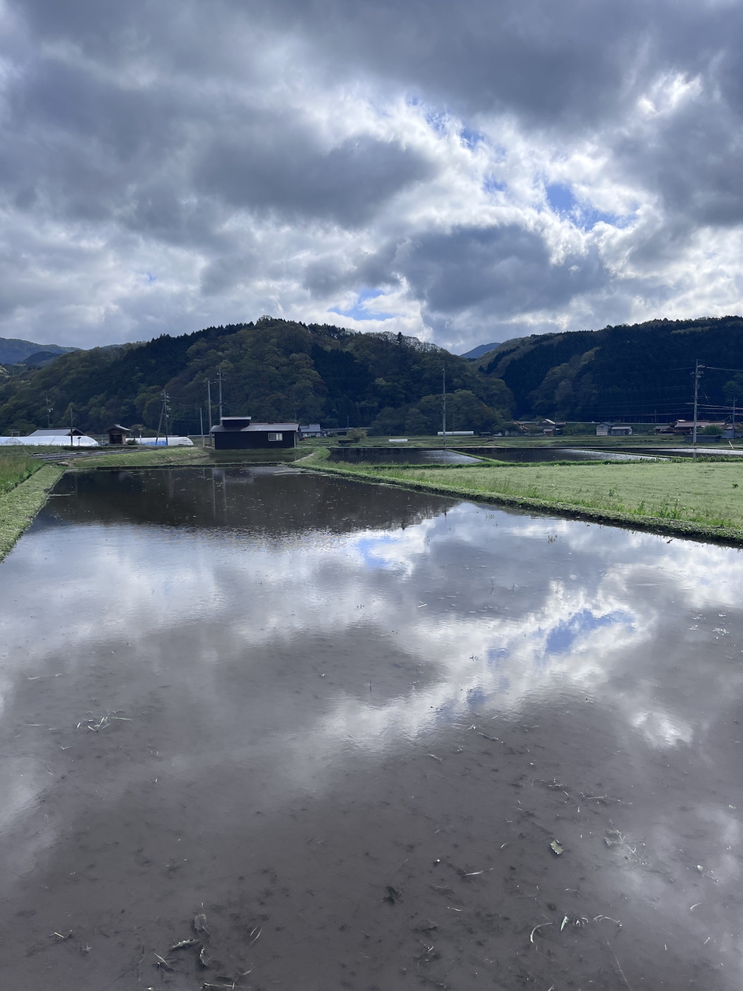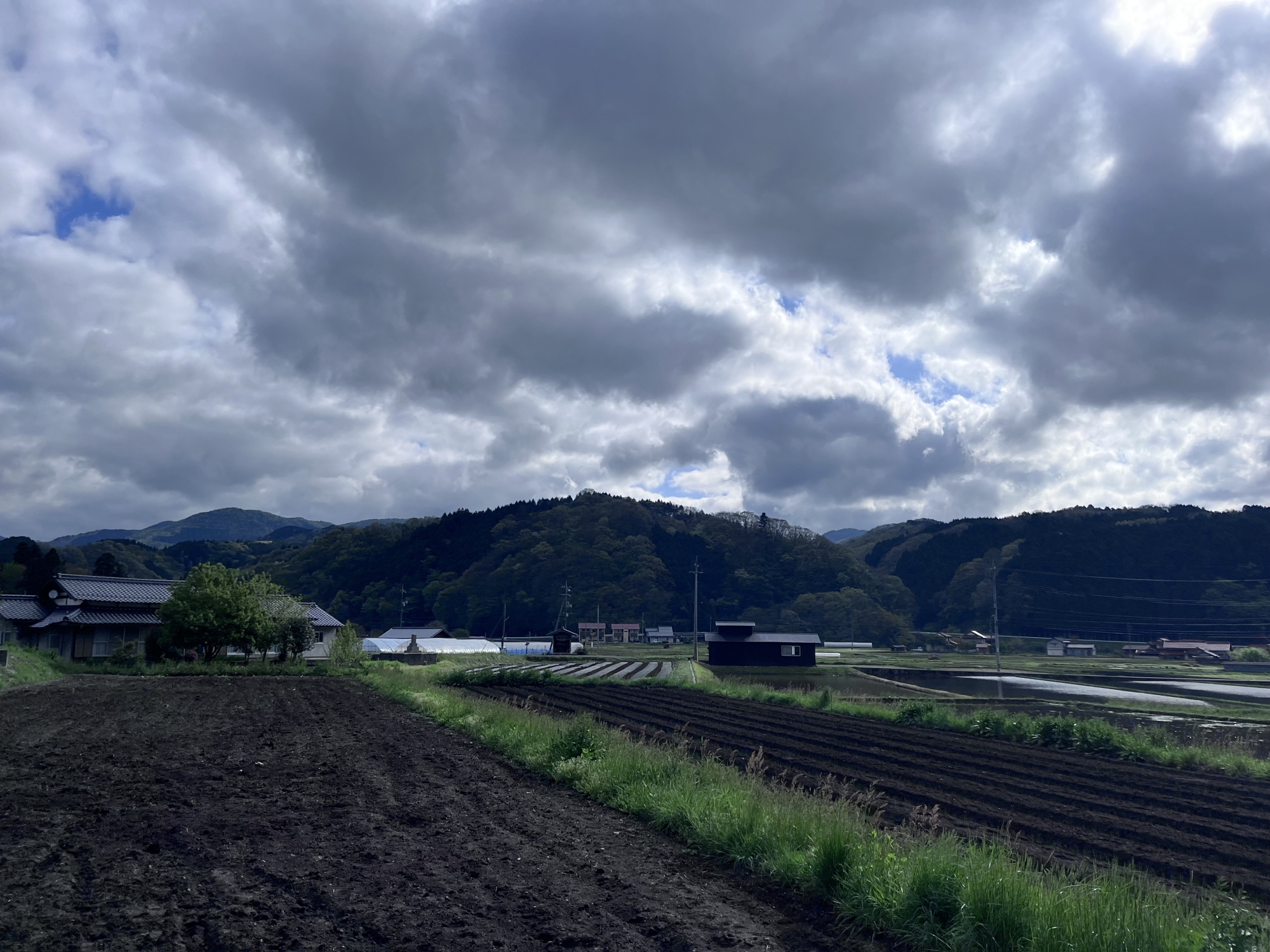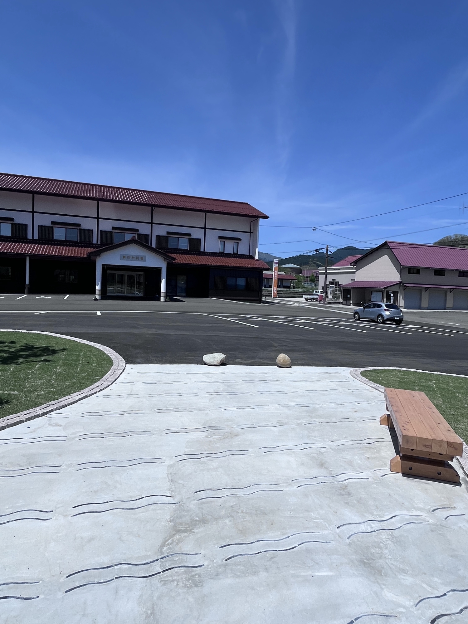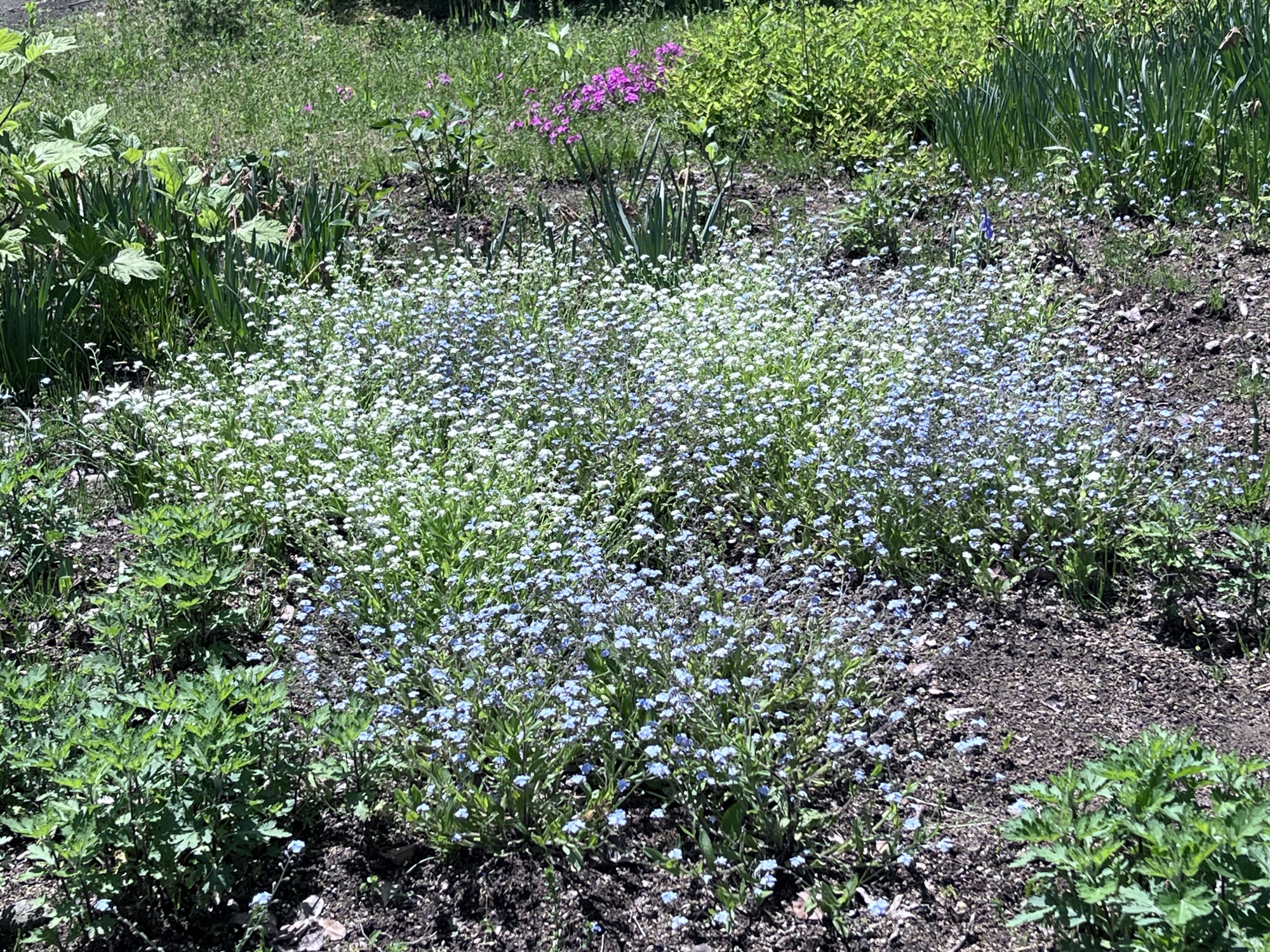 昼にはポストからの役場・・で、職場横の花壇とすっかり緑の枝垂桜。