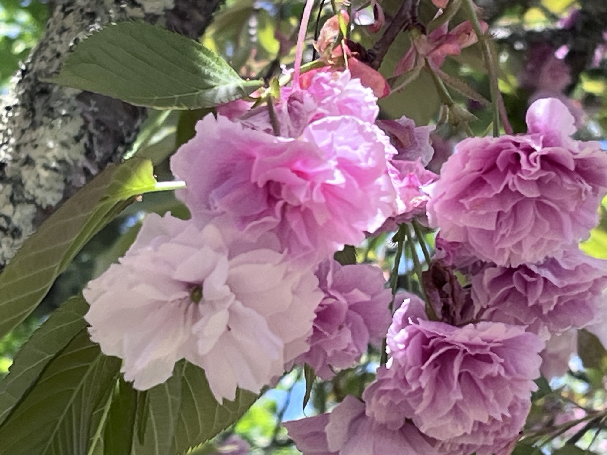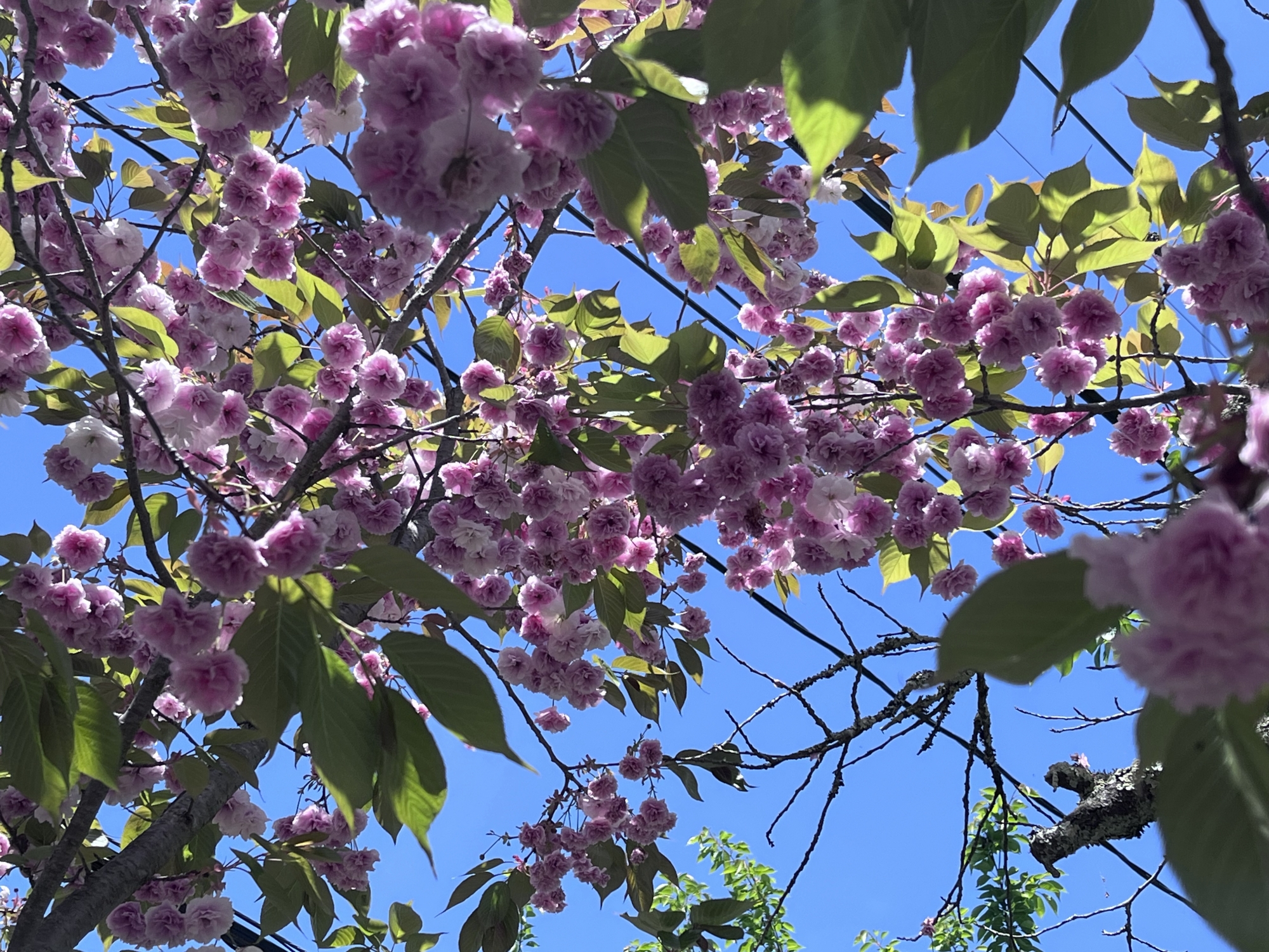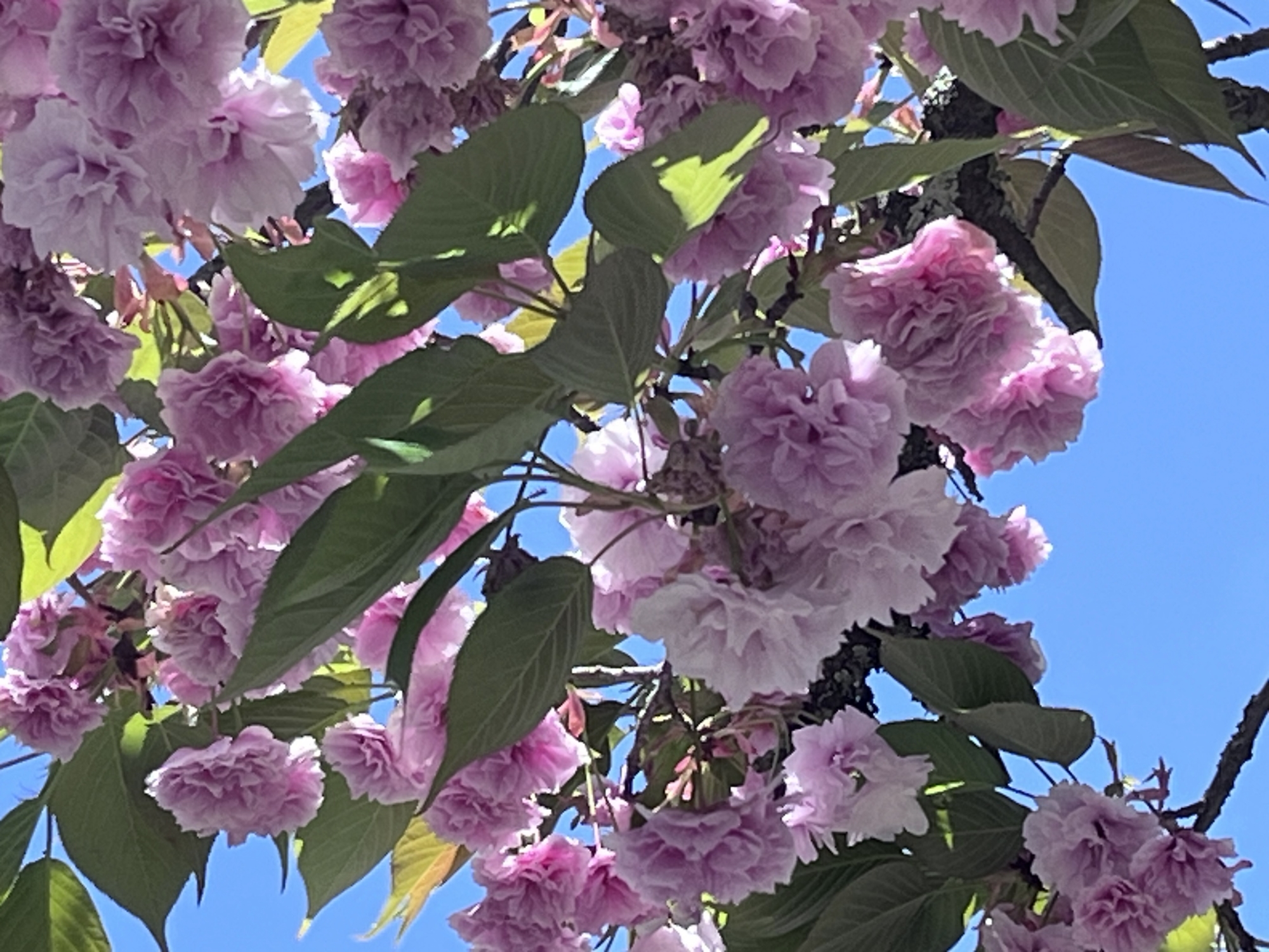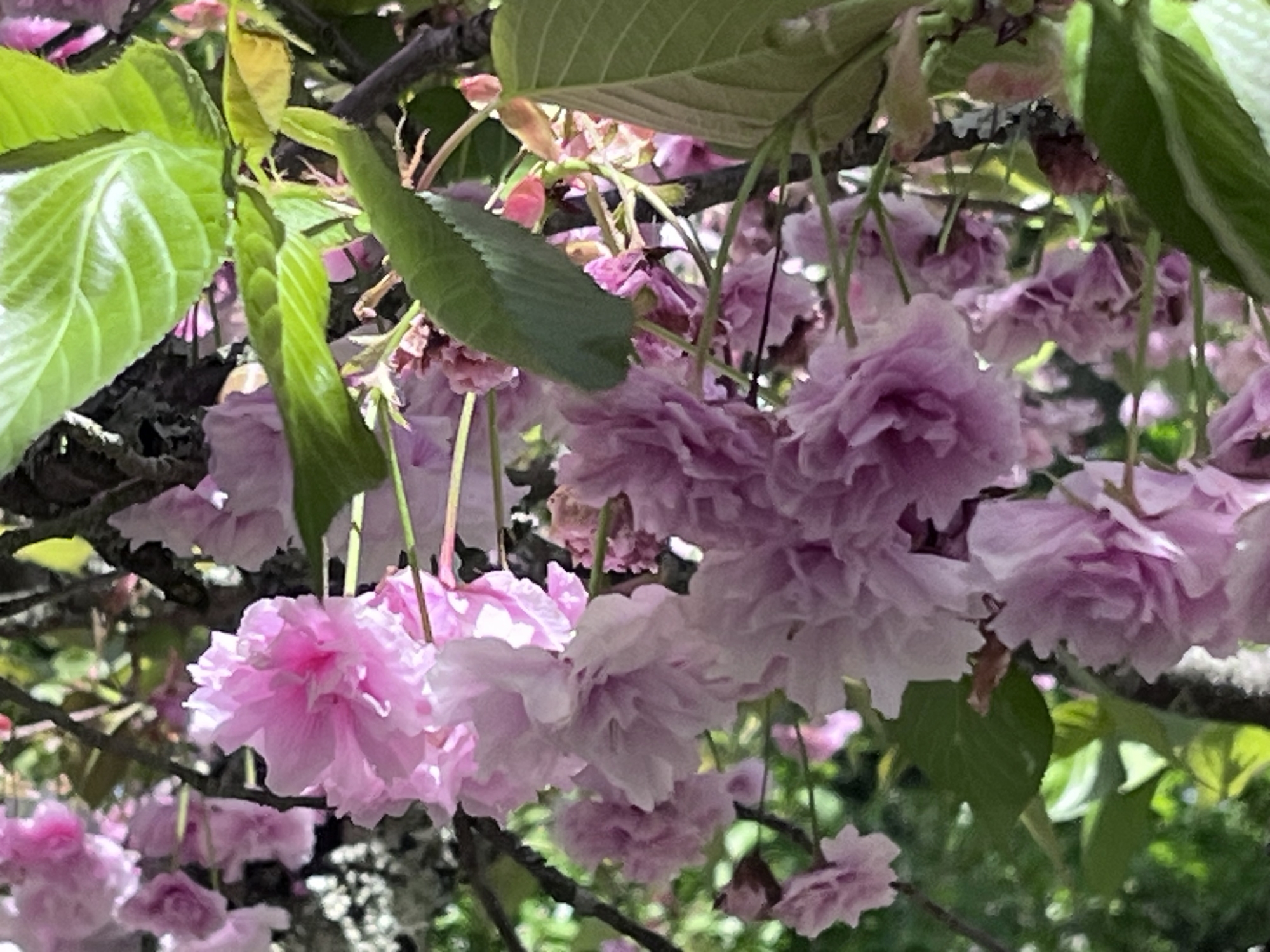 公民館横の八重桜は、まだまだ、花もたっぷり。