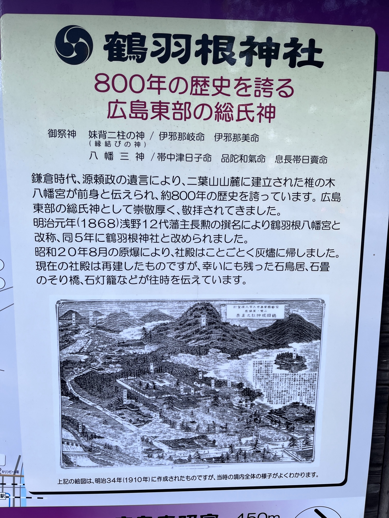 1869年、浅野長勲の撰名で「鶴羽根八幡宮」と改称。さらに、3年後の1872年「鶴羽根神社」と改められた。名称は背後にある二葉山が鶴が羽を広げたような姿であることから名付けられた。1945年8月6日に原子爆弾が投下された際、社殿は廃墟と化したが再興されている。石鳥居、石ノ太鼓橋手水舎、唐獅子、石燈籠は当時のままのものである。また、松、楠、イチョウの被爆樹木もある。】