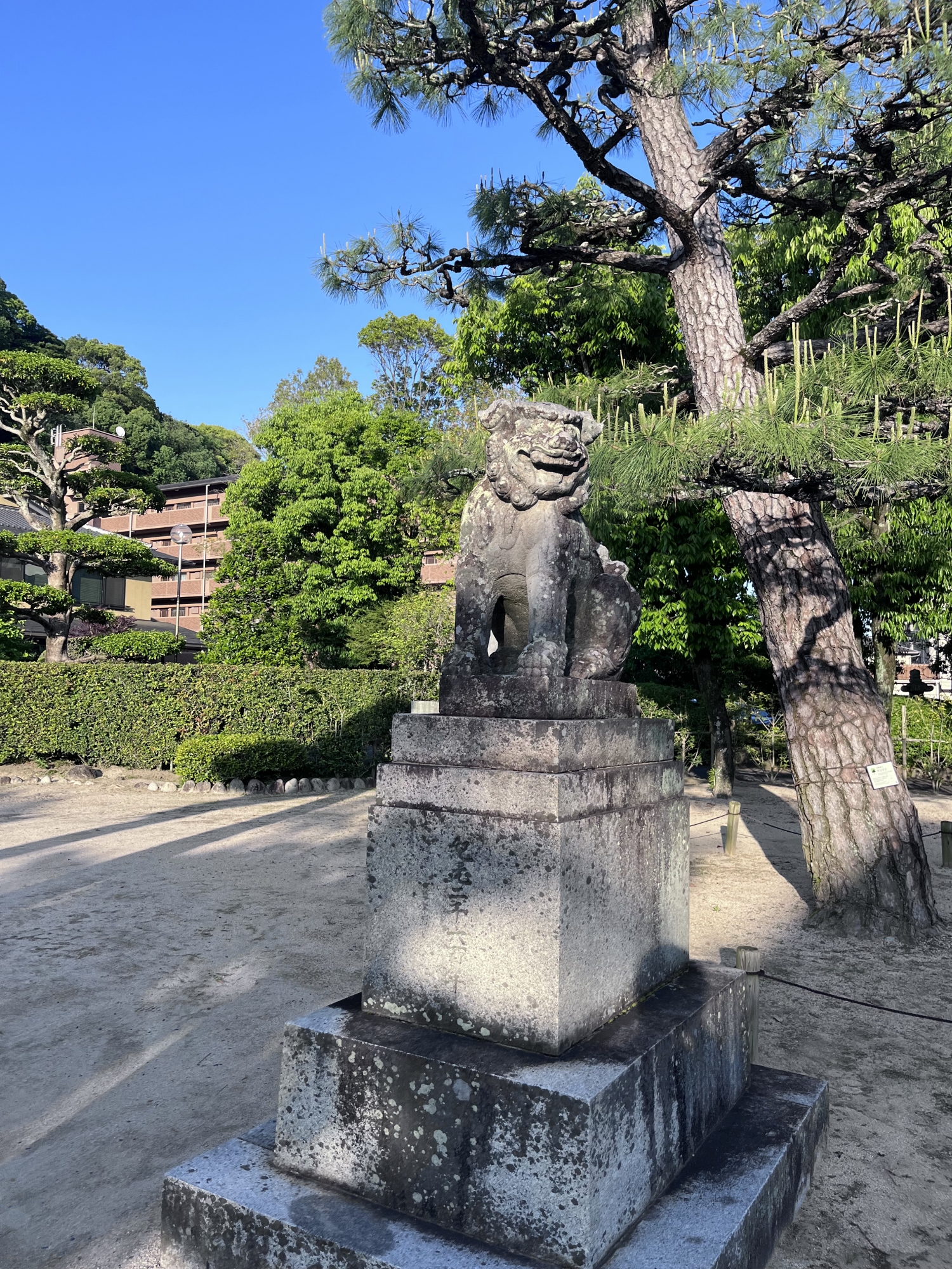 広い境内です。【古くは鎌倉時代に源頼政の室である菖蒲の前が現在の東広島市で落ち延のび、その没後、遺志により家臣であった池田左衛門によって1190年に創建された。修理に椎をつかったため、「椎の木八幡宮」と称した。しかし、享保(1716~1736)年間に火災にあい、のちに戦乱にもあったため荒廃した。近世になり復興を果たし、1835年に現在の饒津神社付近から、現在の位置に遷座した。】
