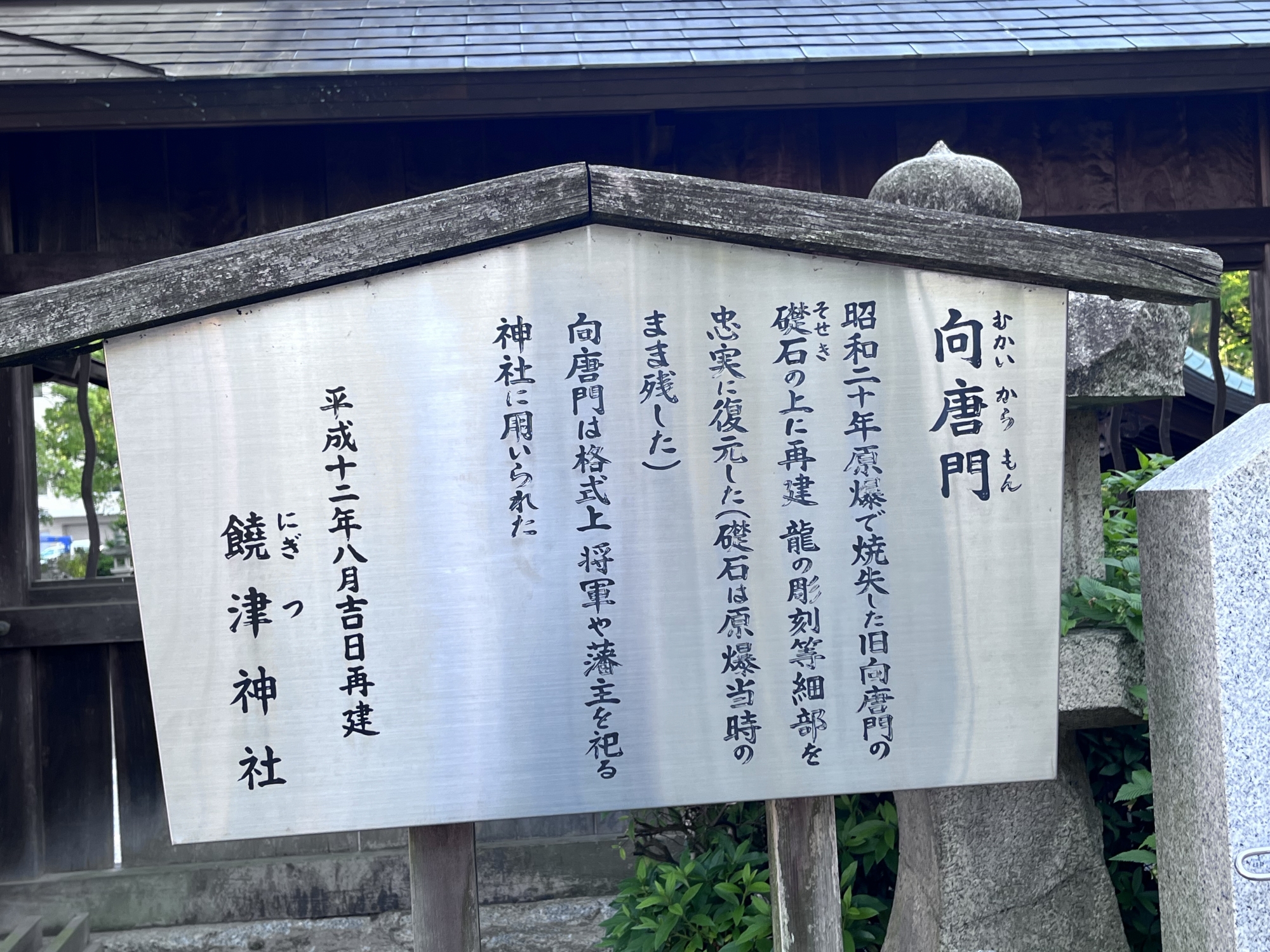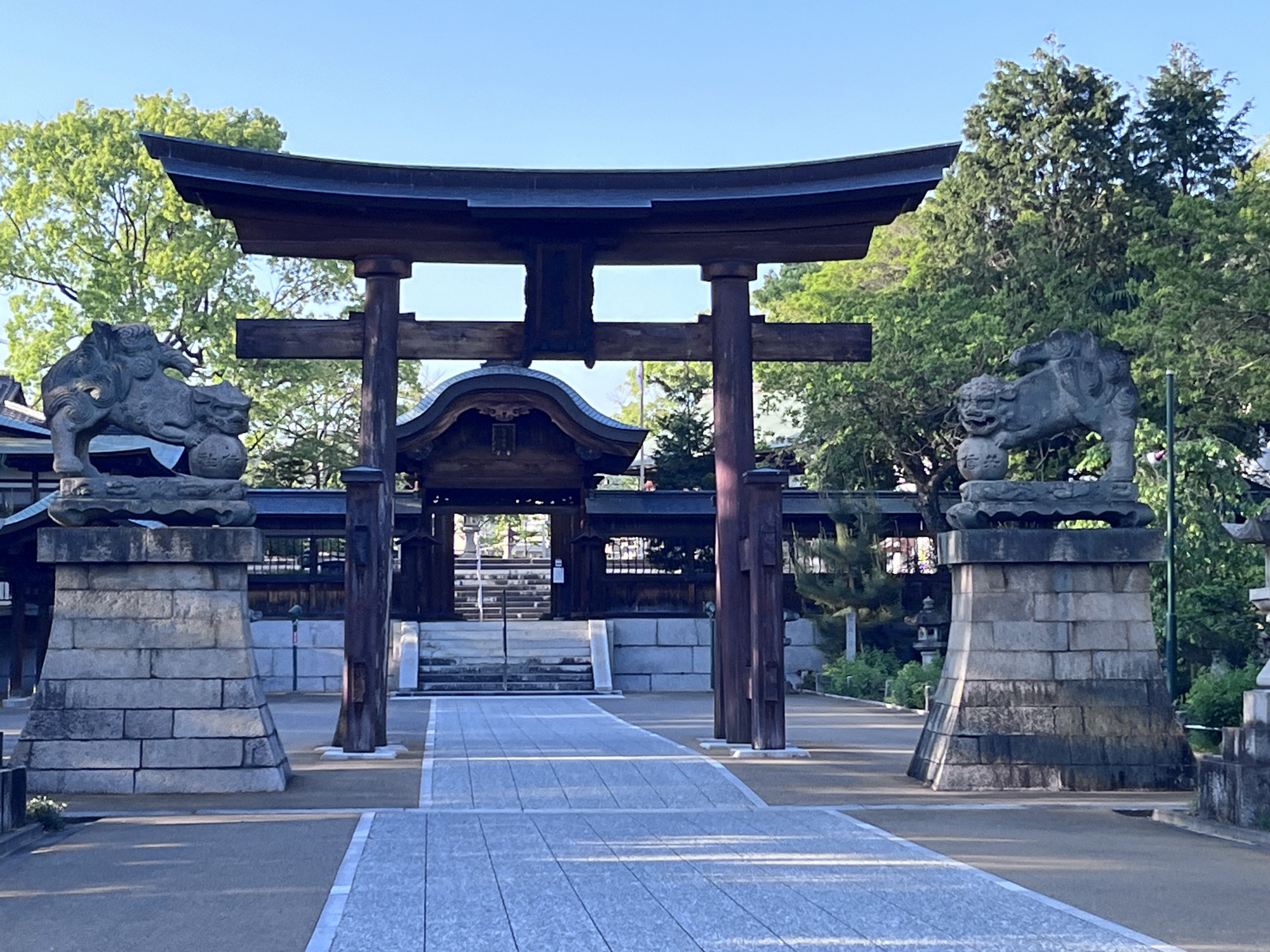 【戦後、仮殿、本殿が再建された。1984年(昭和59年)6月、本殿、拝殿、瑞垣が戦前の姿に復元された。2000年(平成12年)唐門も再建され(大きさは全国2位)、2005年(平成17年)唐門の前に木製の鳥居が再建された。】