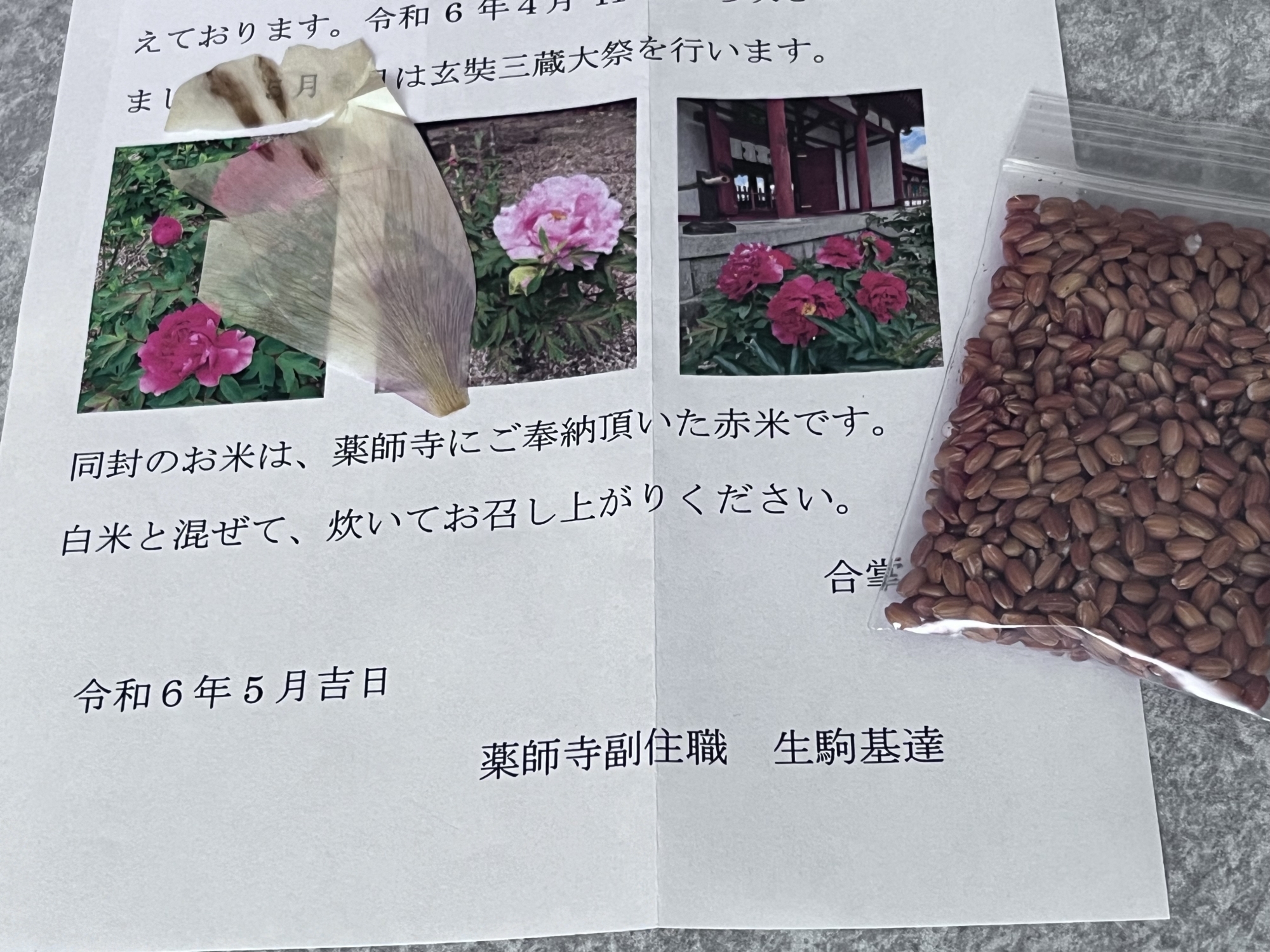 さて・・・母に黄色い薔薇と・・薬師寺からの赤米。