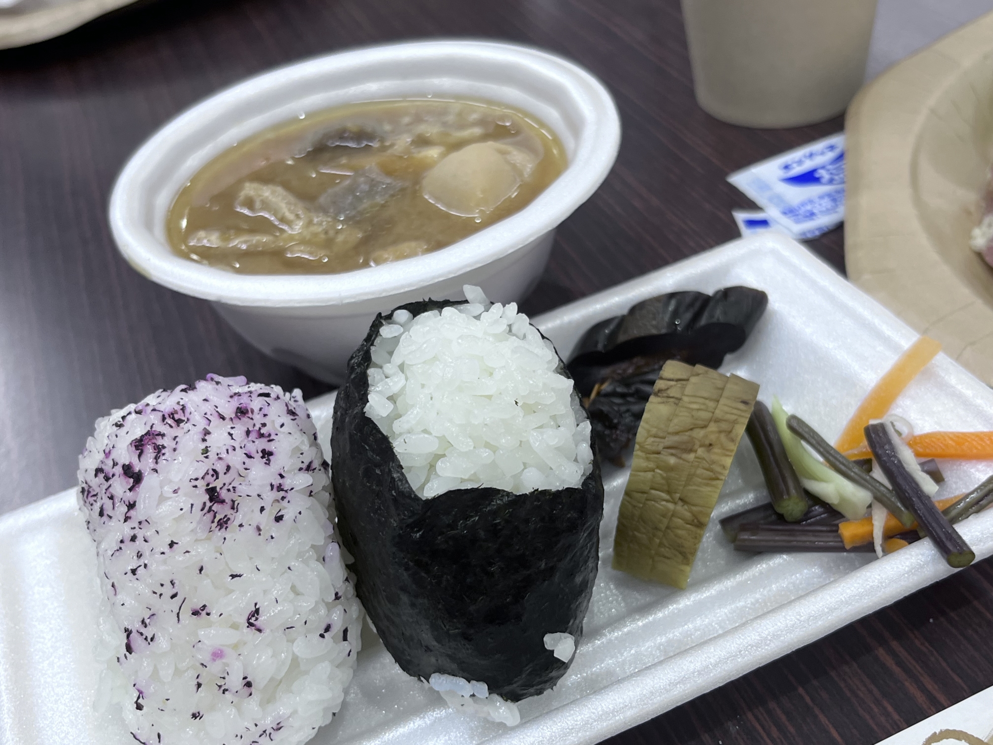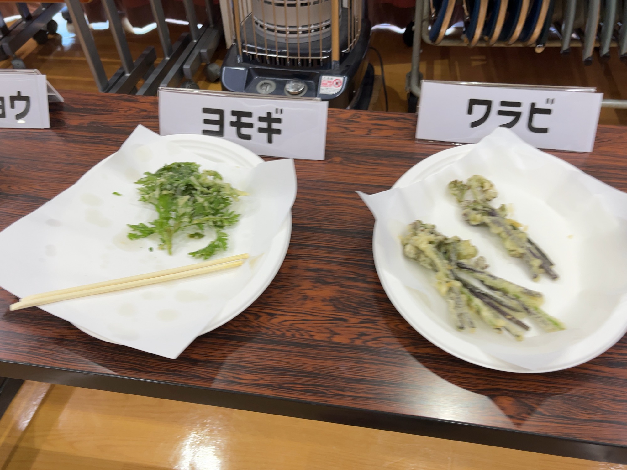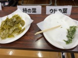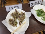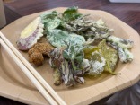 山菜の天ぷら:猪肉、ウド、柿の葉、ワラビ、ヨモギ、サンショウ、タキミズナ、イタドリ、ハナイカダ、クズ、サツマイモ。そして、おにぎりや豚汁や〜。お腹いっぱい。更に、お土産まで貰って、晩御飯ゲットです。