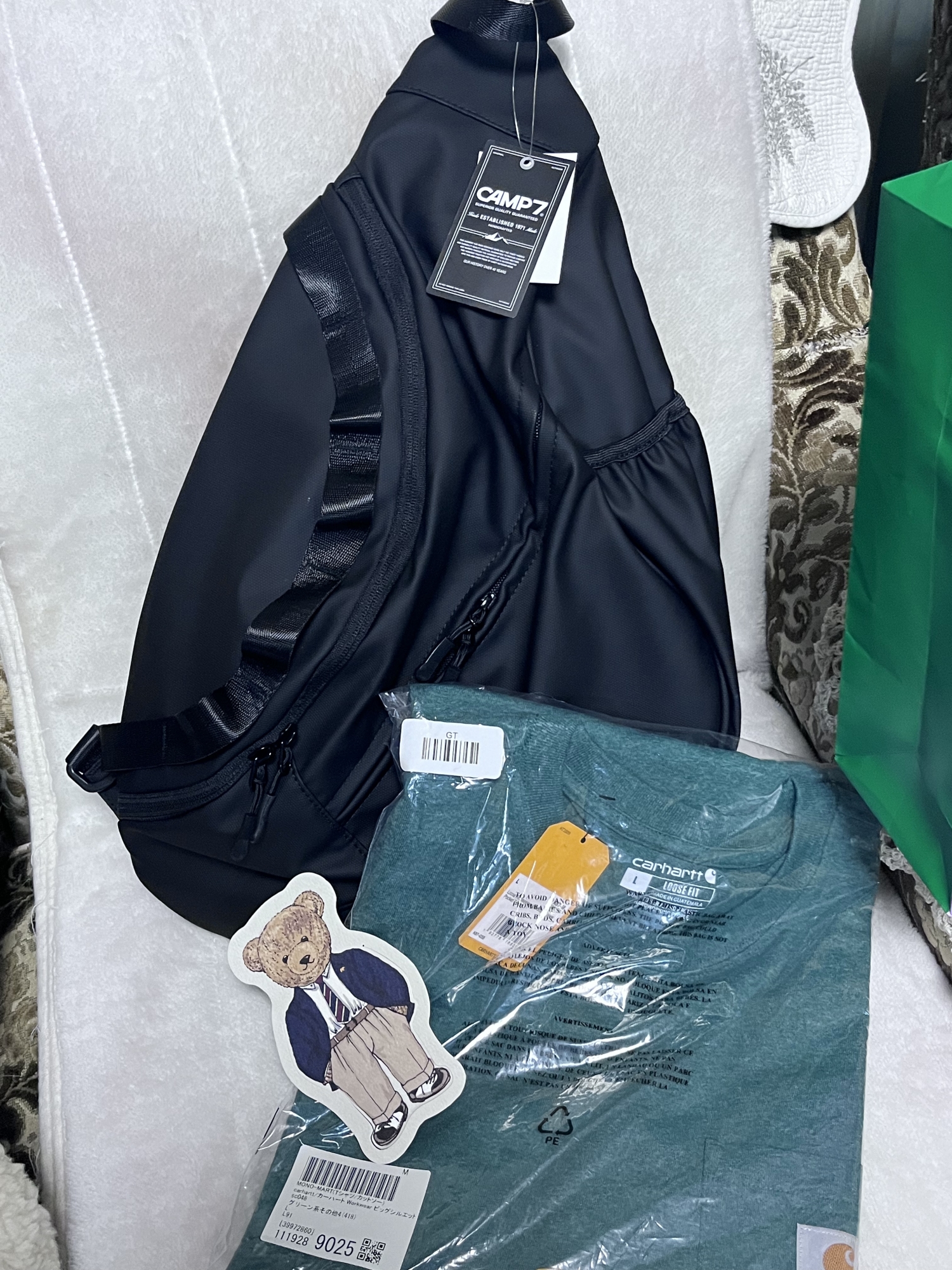ショルダーバッグとTシャツ(それにしてもやっぱり緑のTだ)。ありがとう!!!!!