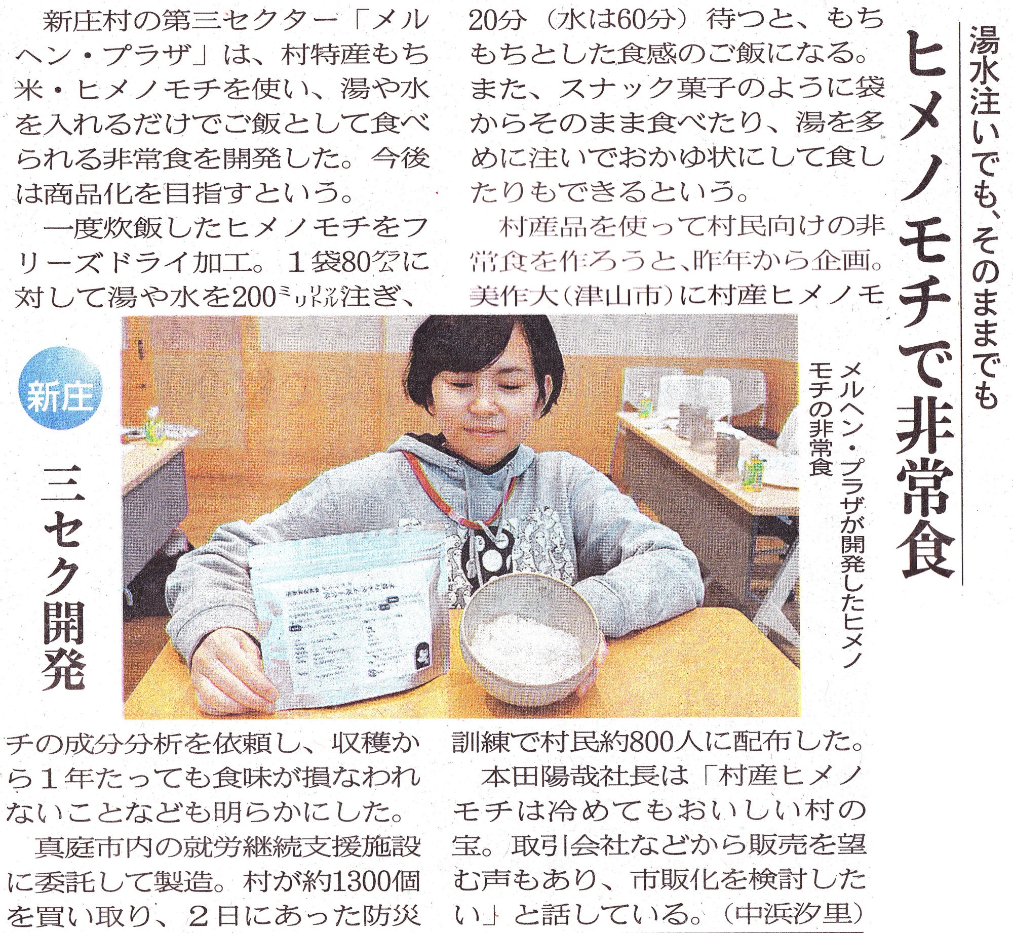 山陽新聞朝刊搾取版で…先だって配布を受けた非常食のヒメノモチごはんが紹介されていました。