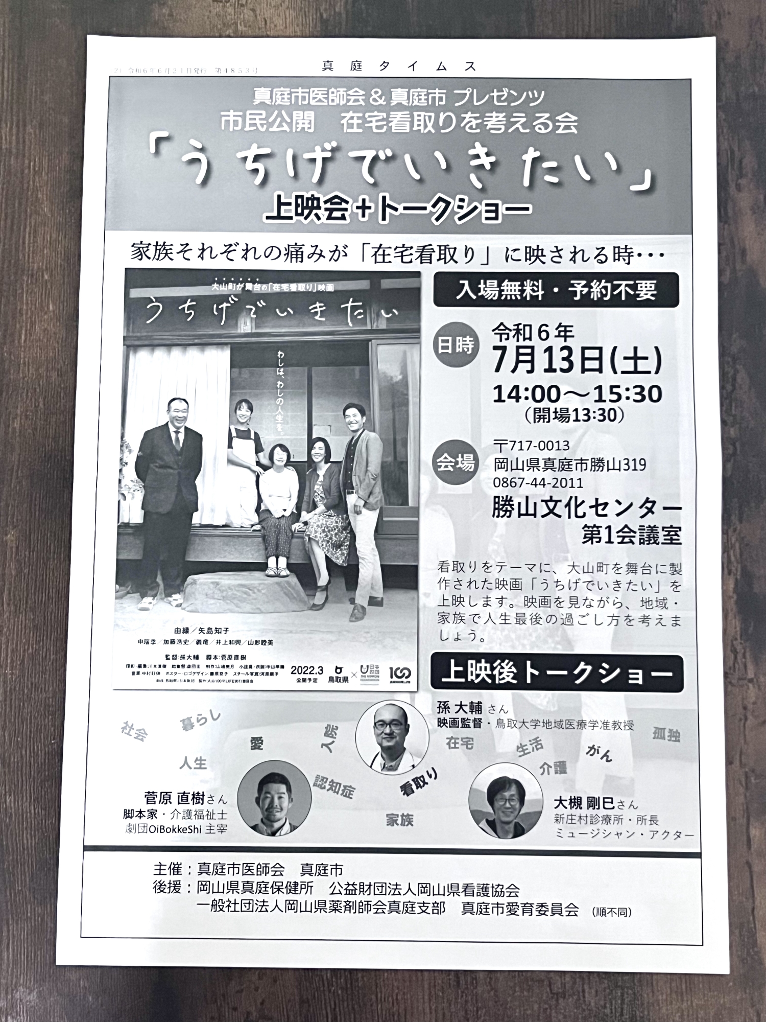 7/13:勝山文化ホール.映画「うちげでいきたい」上映会+トークショー(真庭市医師会+真庭市:主催)