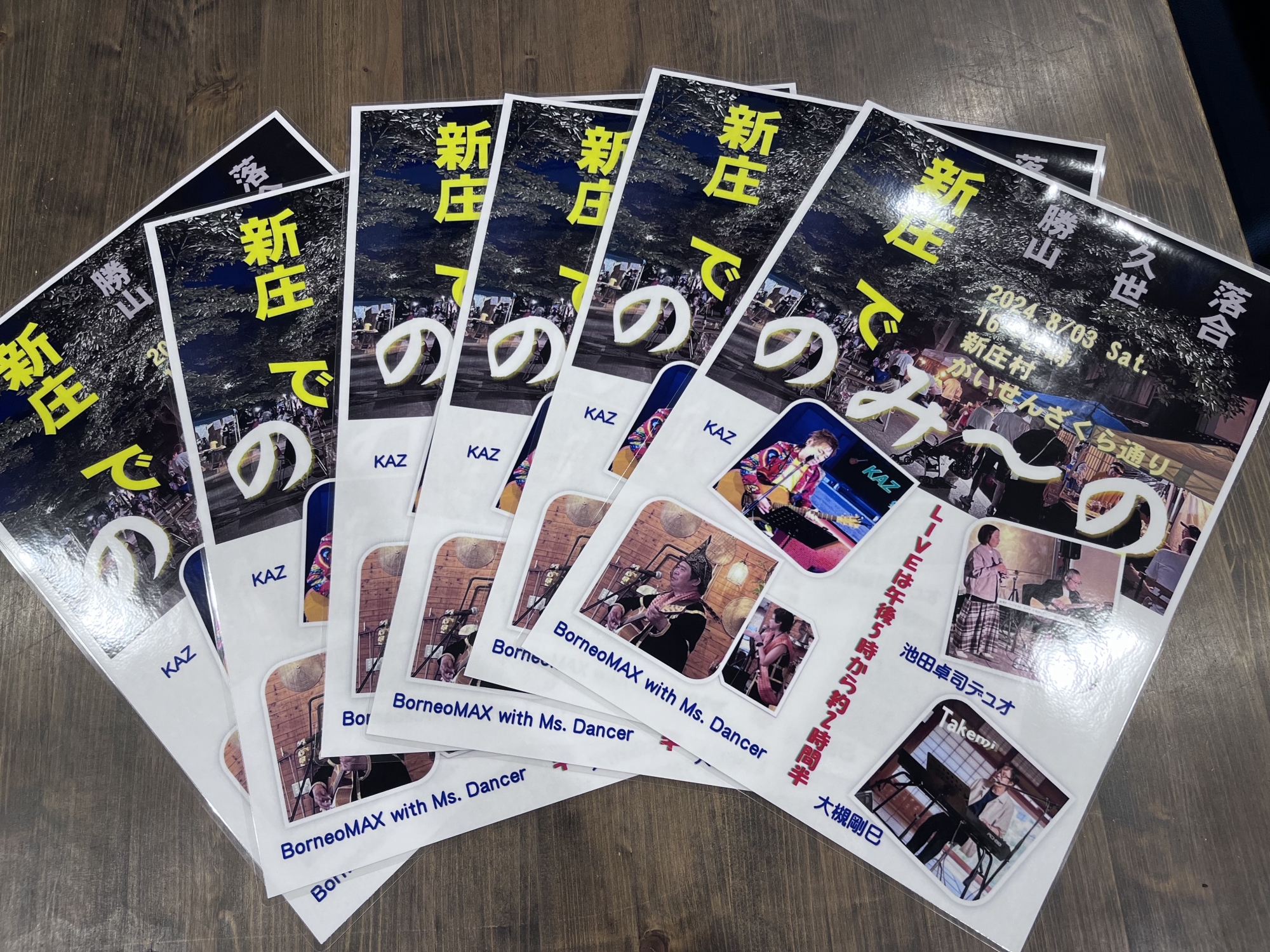 | 7/27:KAZ produceで吹屋で唄っちゃいます! | 8/03:真庭で「のみ~の」新庄版~LIVEもやってみましょう! | 8/04:農マル園芸音楽祭~LuCa & UG | 8/18:倉敷SomethingさんでEFTO (E. Fukushima & T. Otsuki) | |