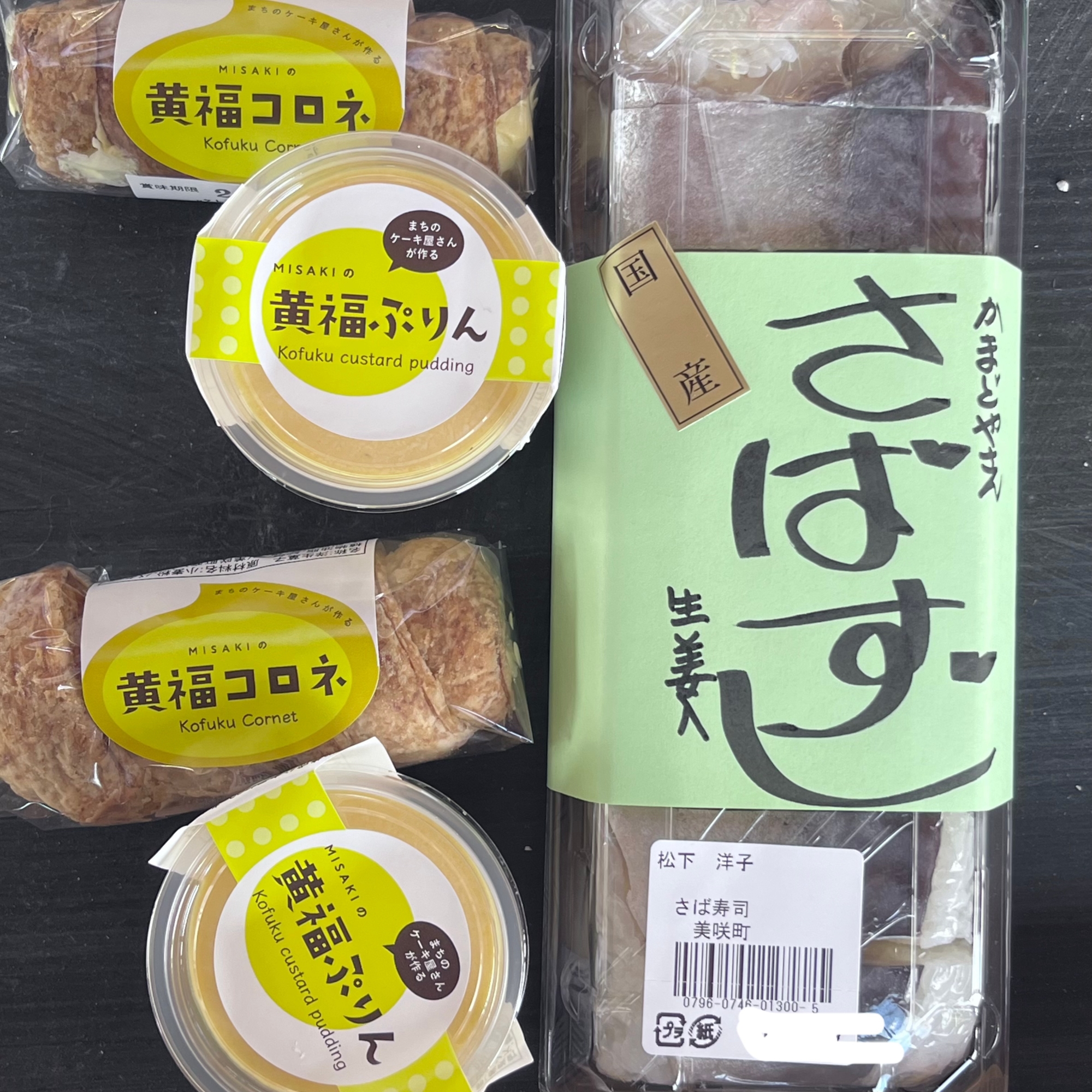 お土産は美咲町物産センターなので、鯖寿司(この前どこかで買った方と同じ生産者っぽい)と、さすが、卵を使ったデザート。