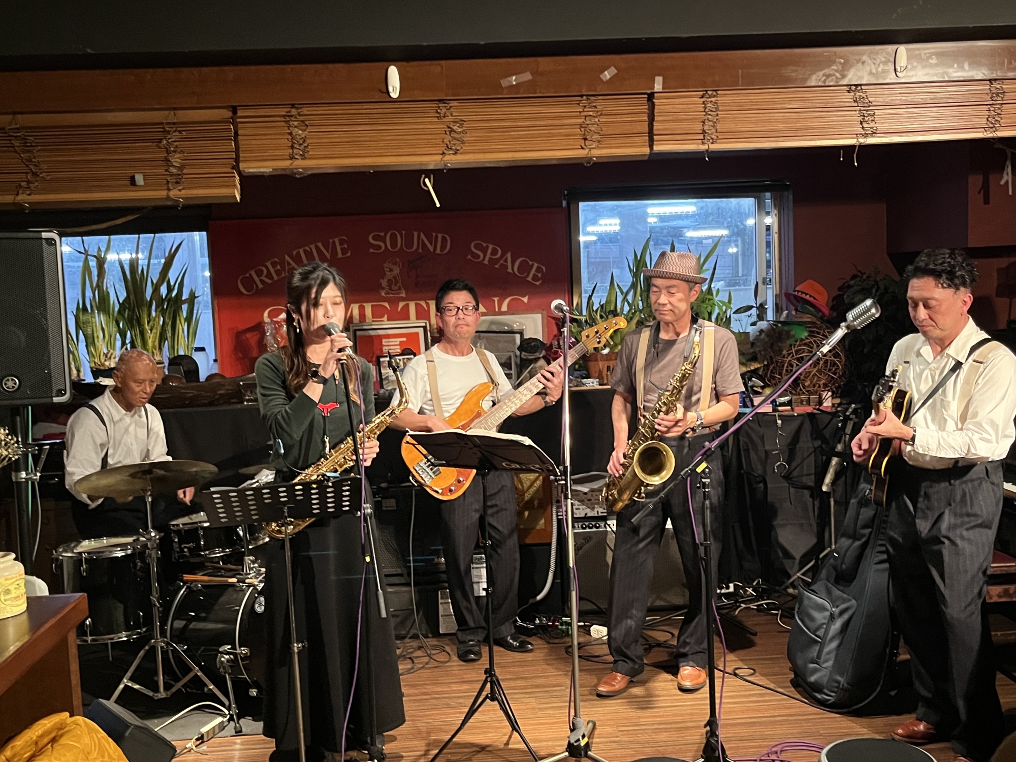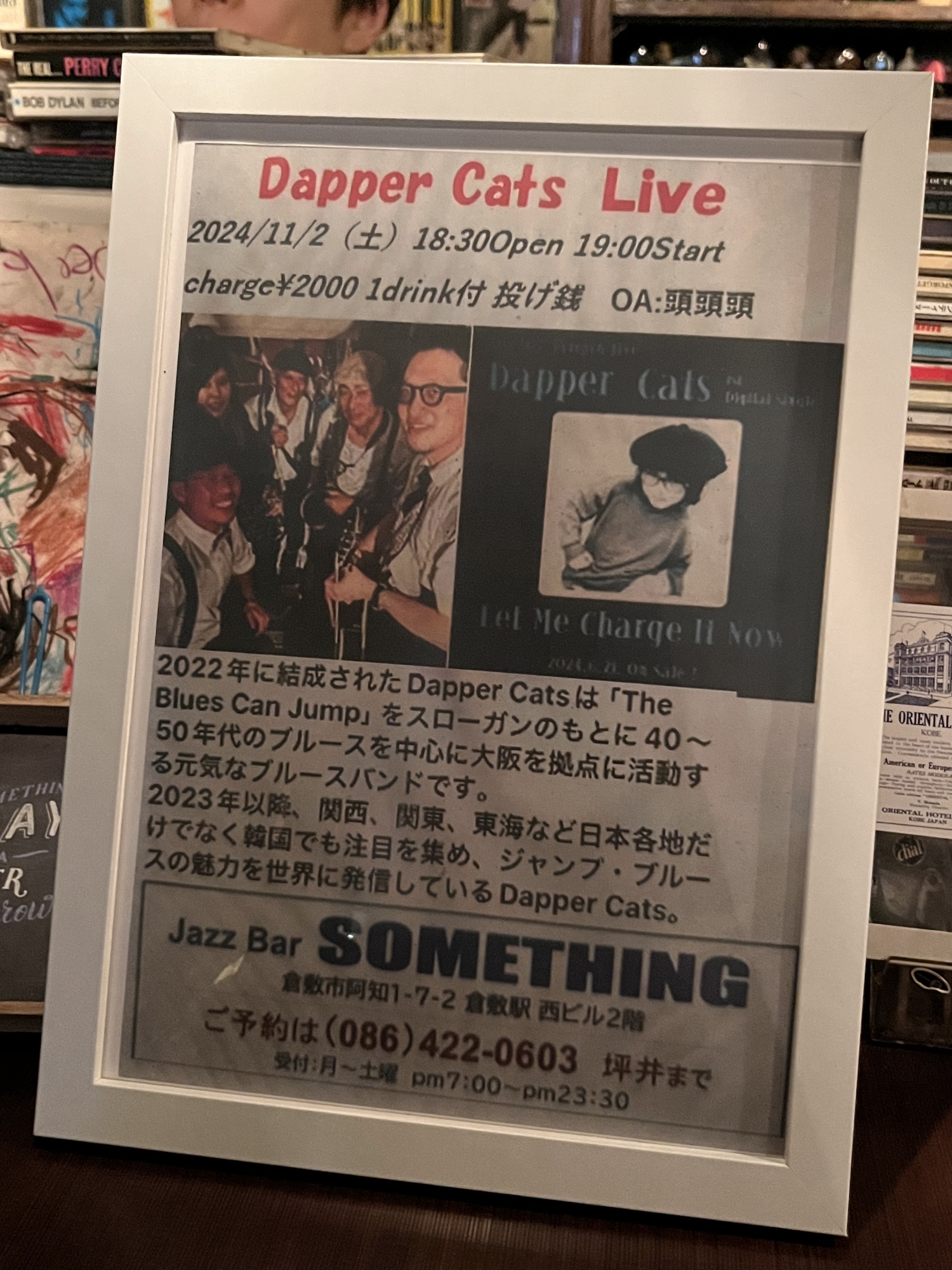 夜、倉敷市西ビルのMusic Bar Something さんで、Dapper Cats さんがら大阪から来られてLIVE。午後に倉敷ジャズストリートにもご出演予定だったそうですが、JR等の乱れで、夜のここだけになったとの由。ボクはズーズーズのピアノとしてオープニング・アクトに出演させて頂きます。