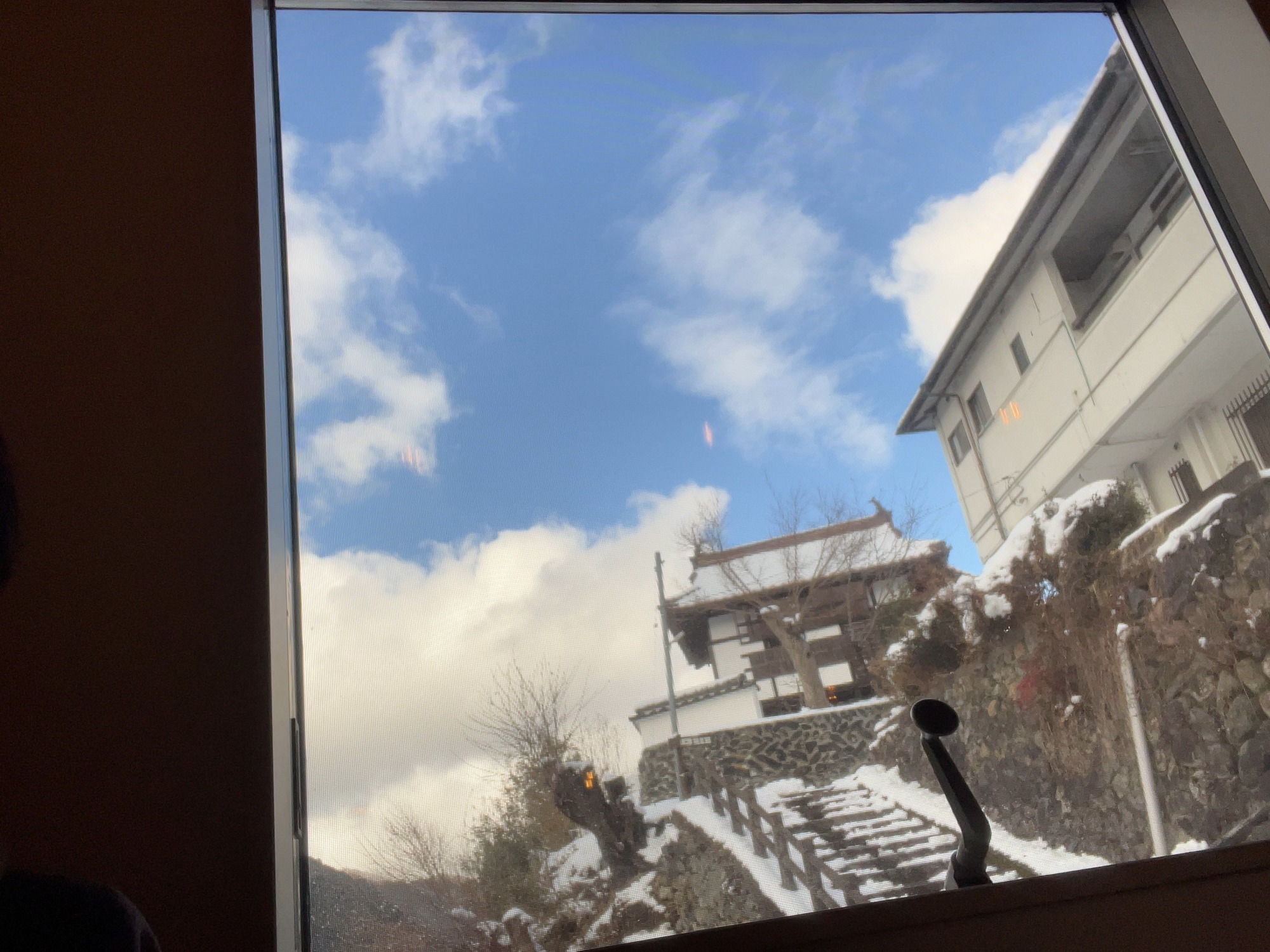 と、帰ってやっていたら、ドスンと……屋根の雪が庭に落ちました。