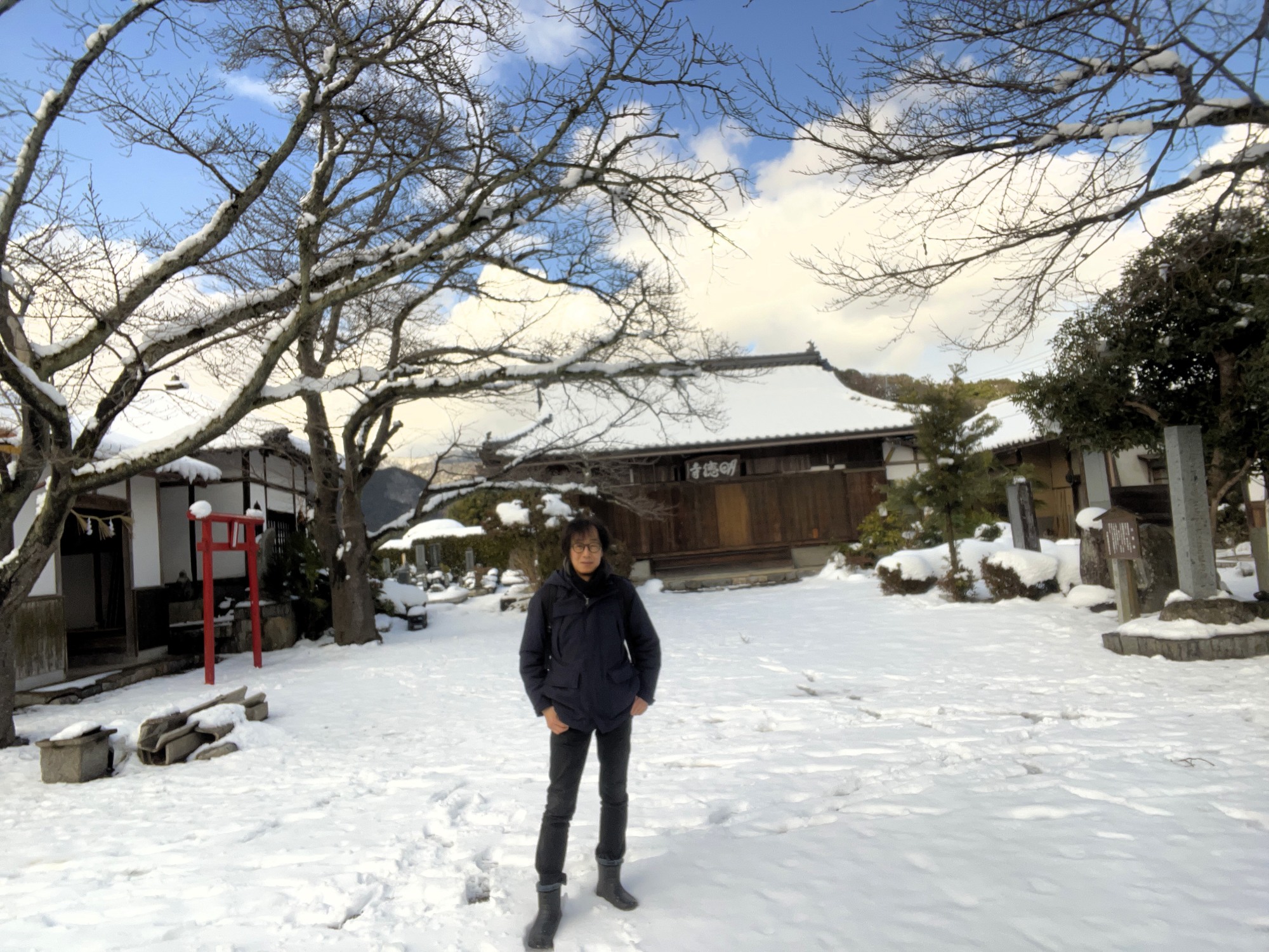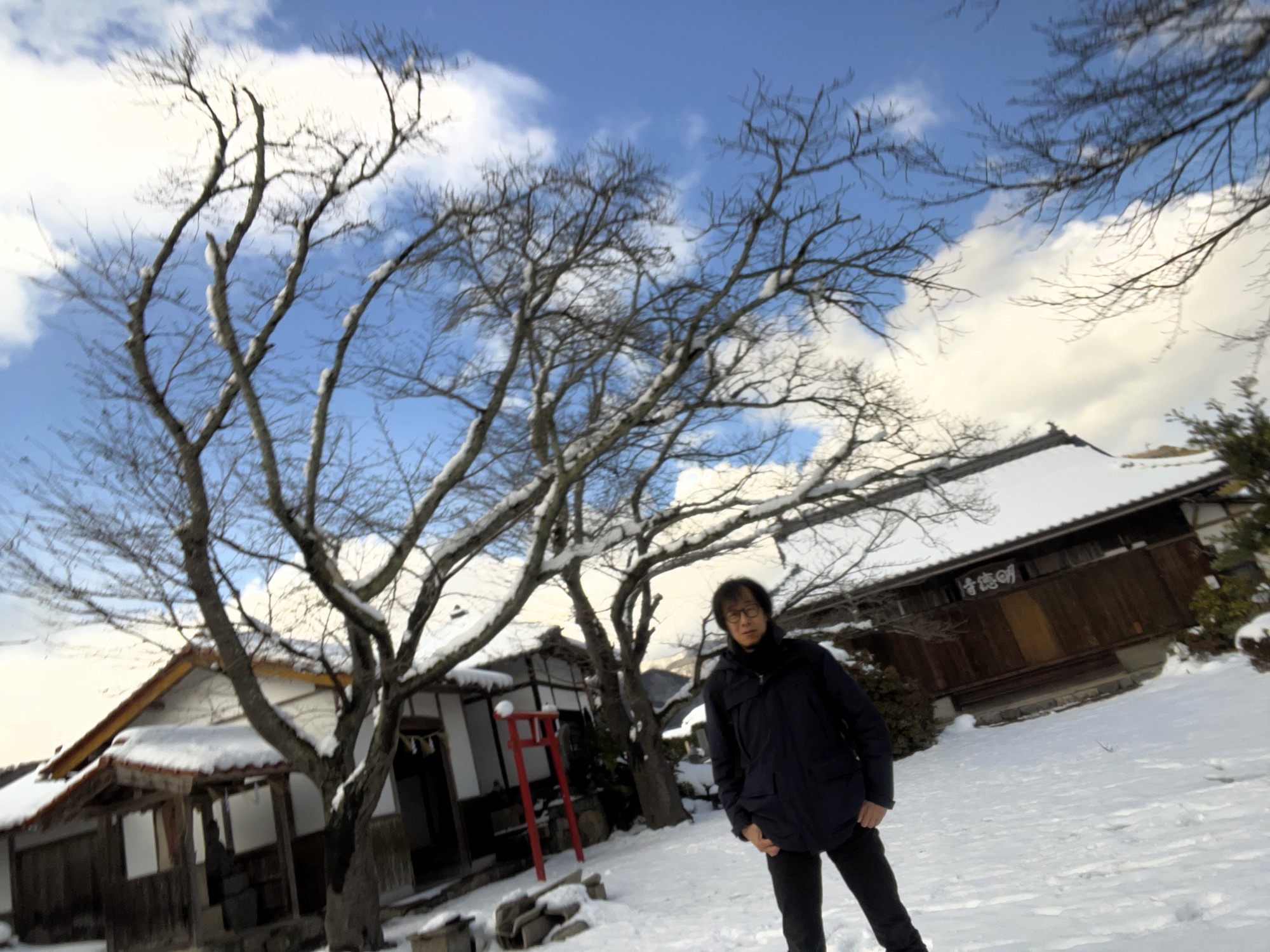 今日は境内一杯……雪です。