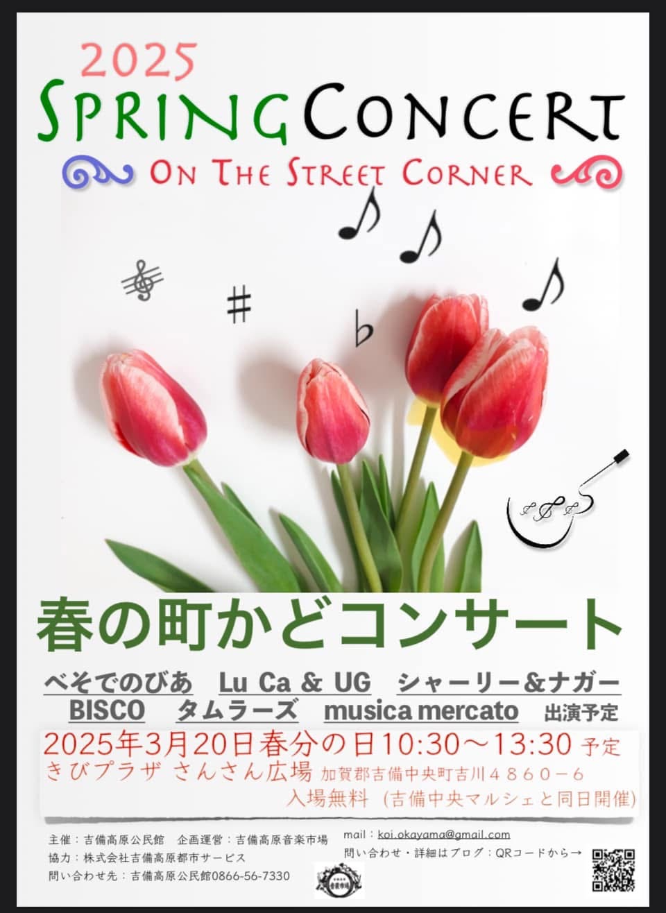 | 3/02:大国屋マルシェ@美袋にLuCa&UGで | 3/02:阿智の風音楽祭ひなまつりコンサート/LuCa&UGとケセラセラ | 3/15:ズーズーズは倉敷駅西ビルSOMETHING | 3/20:吉備中央町の町かどコンサートにLuCa&UGで。 |