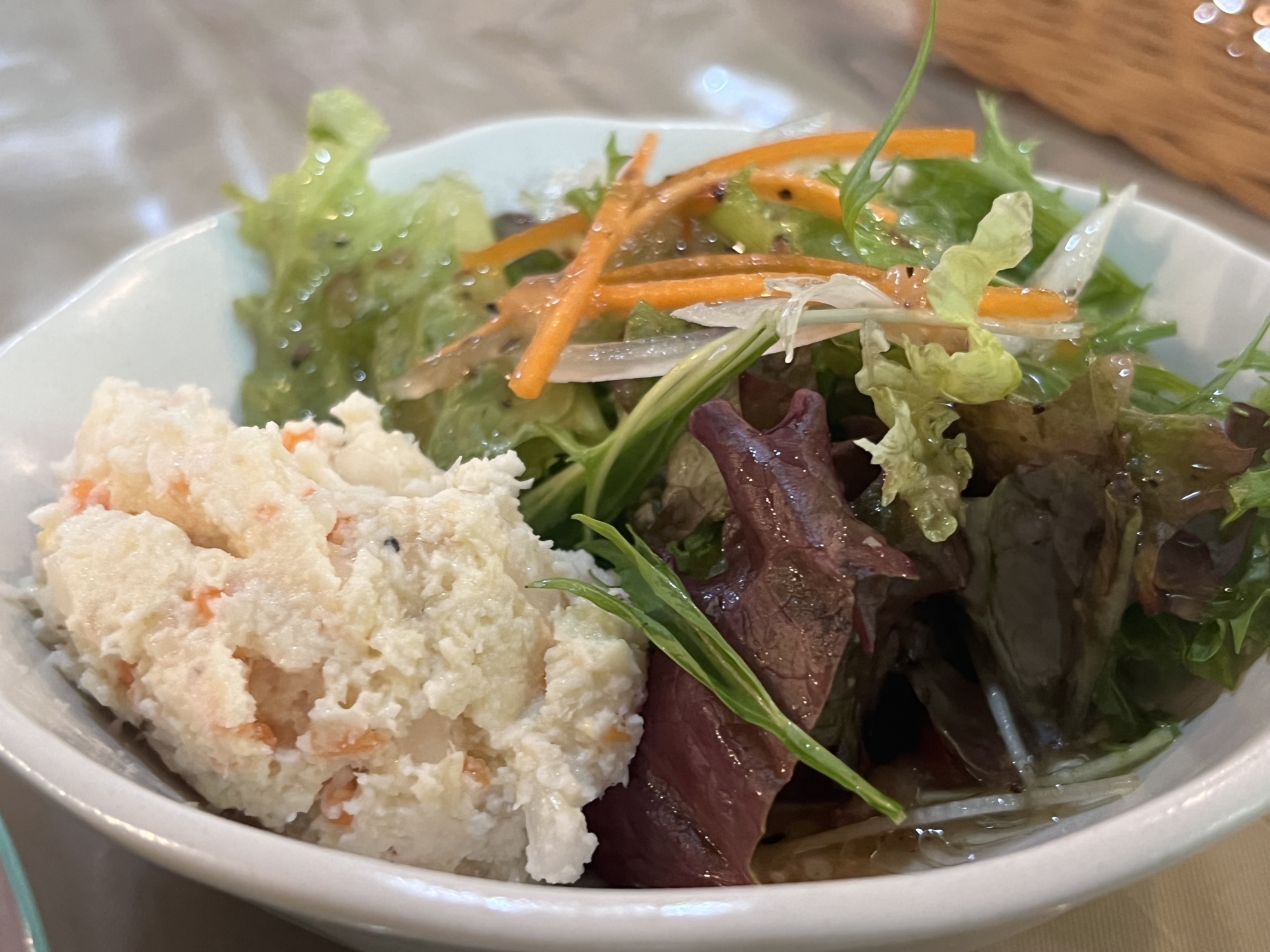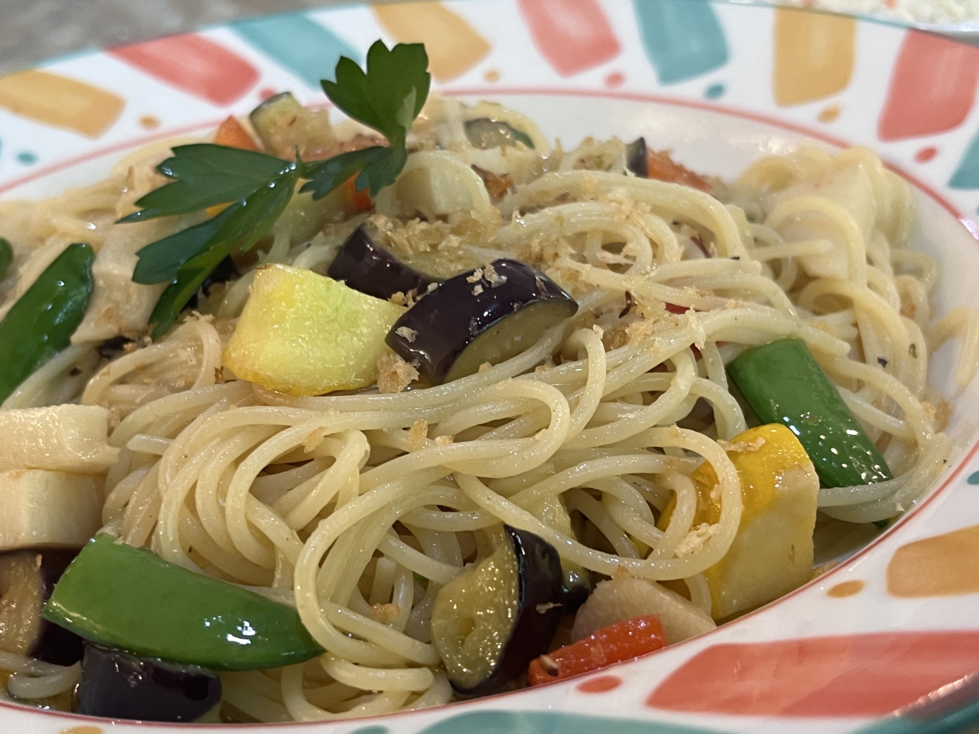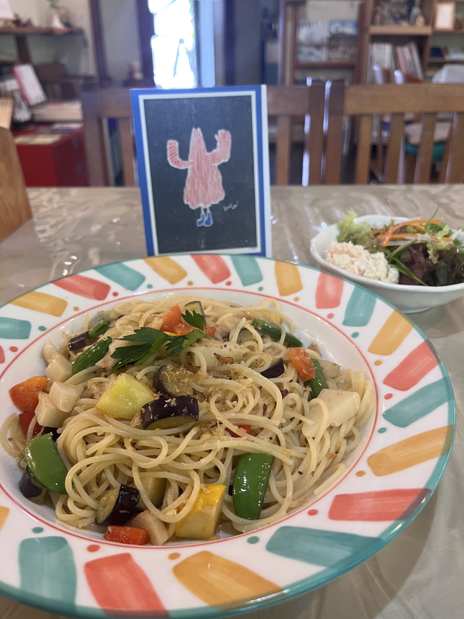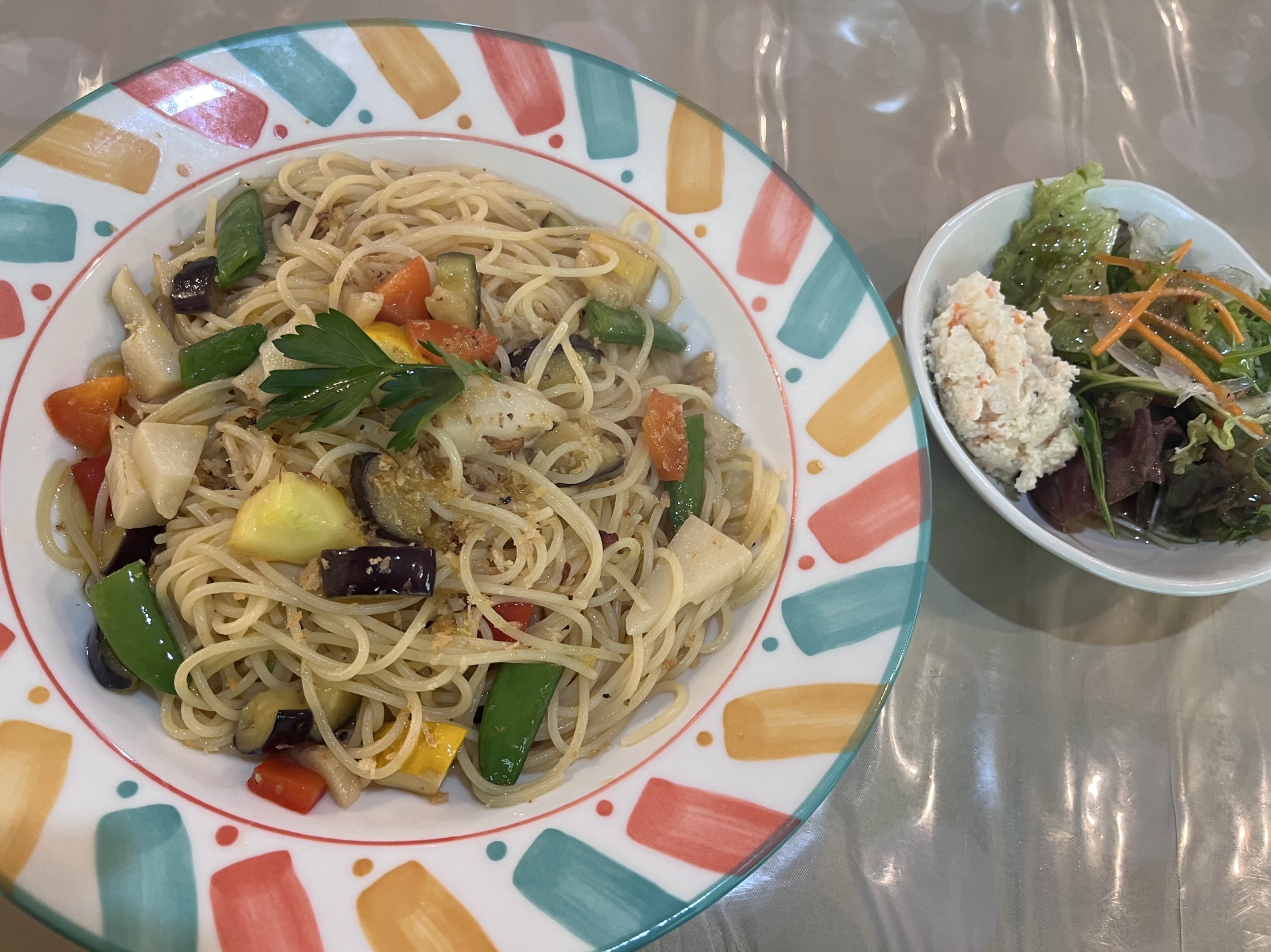 セットメニューの旬野菜のペペロンチーノです.サラダとハーブティーを付けてのセットでした.