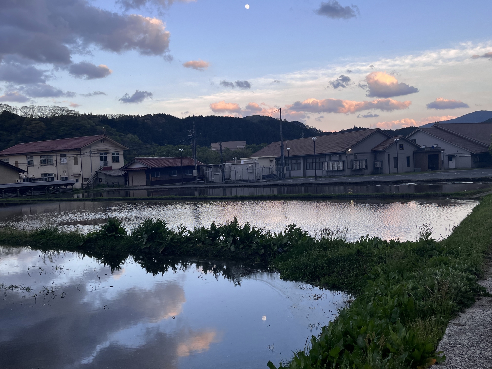 ほら、戻ってみたら、田植えも終わっていました.白い月.
