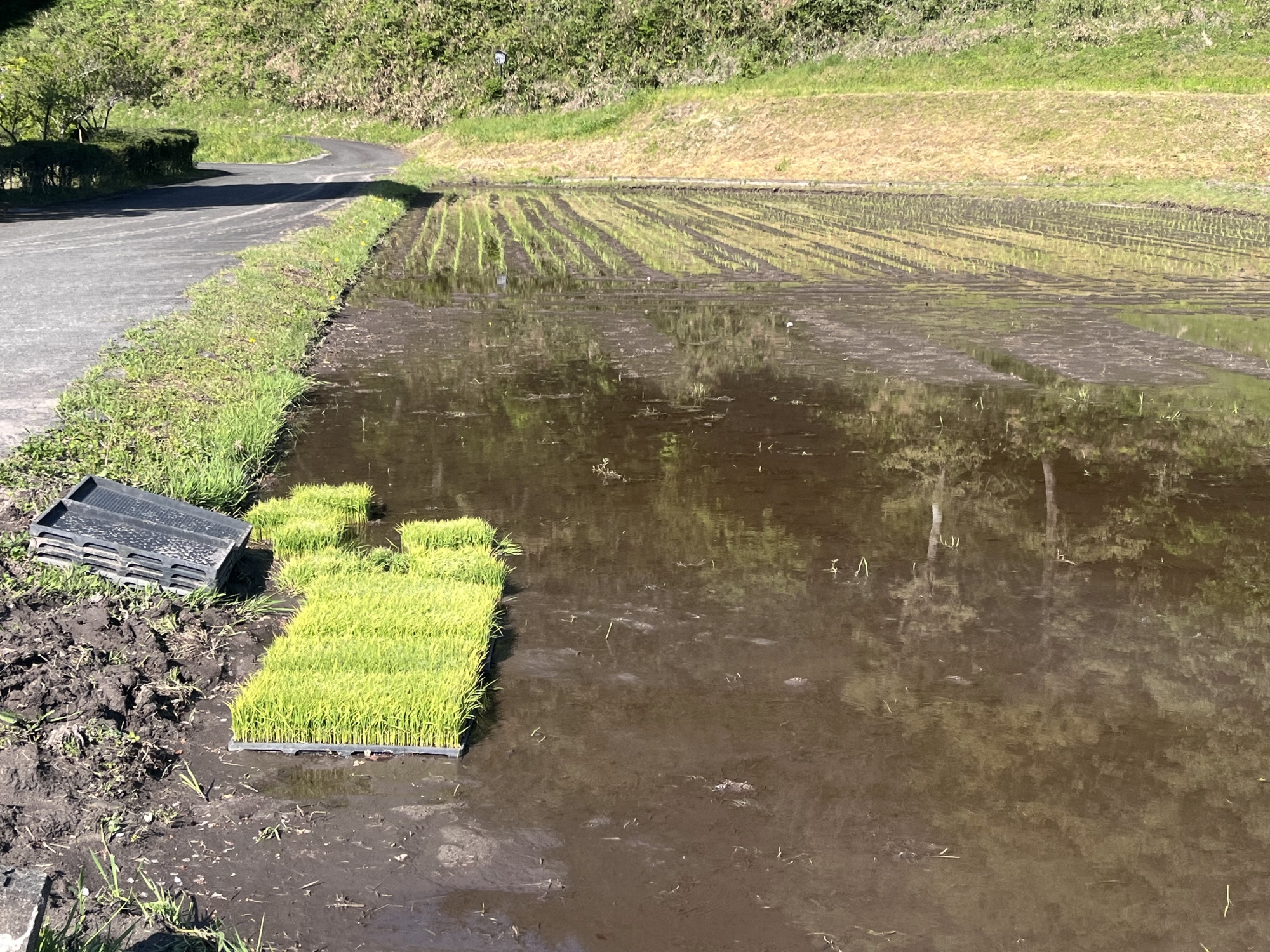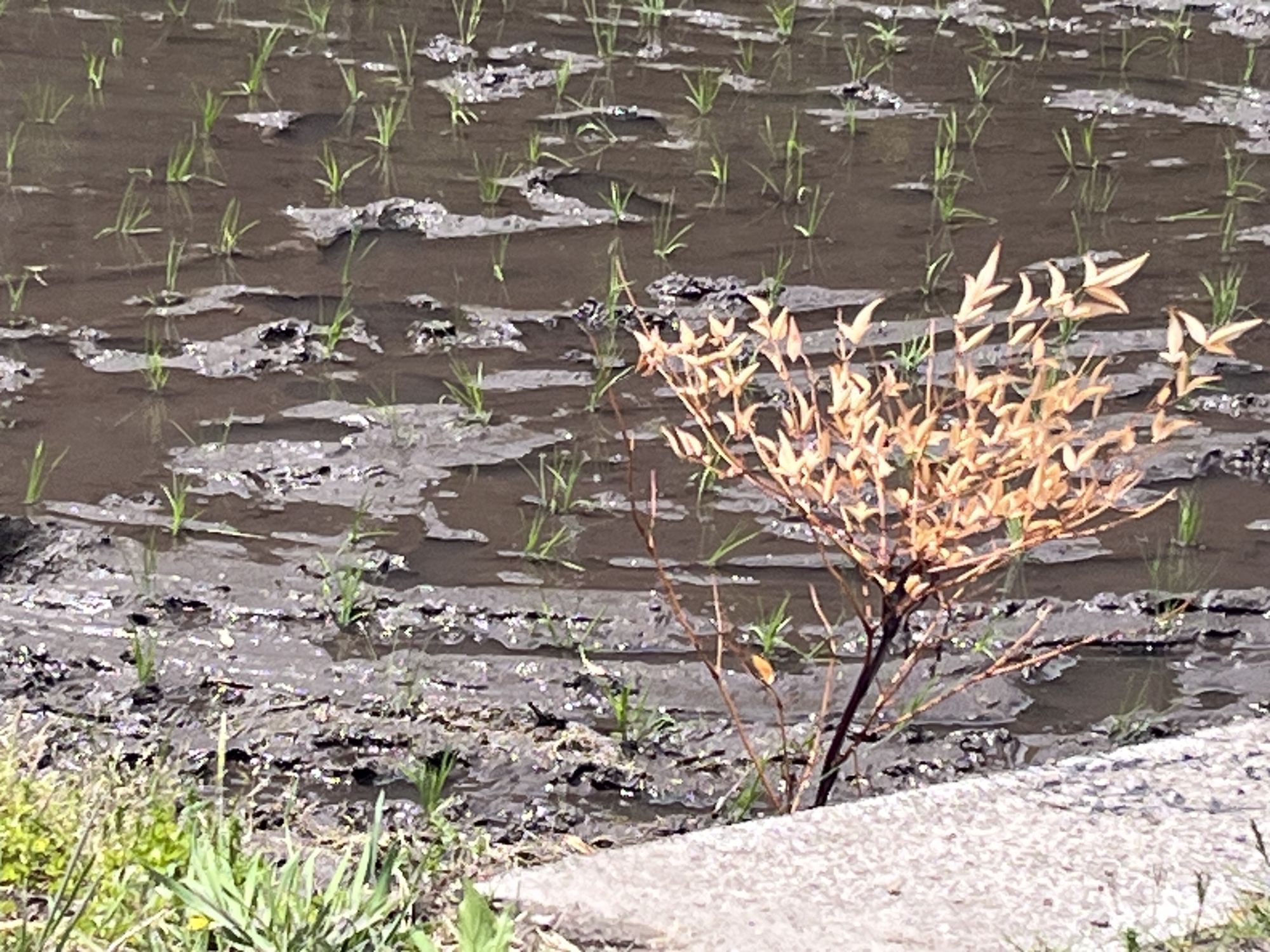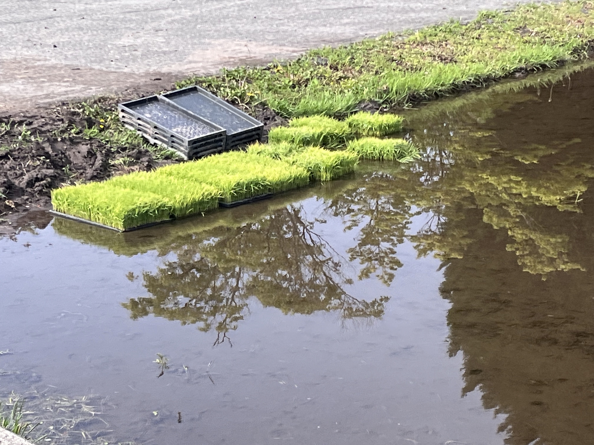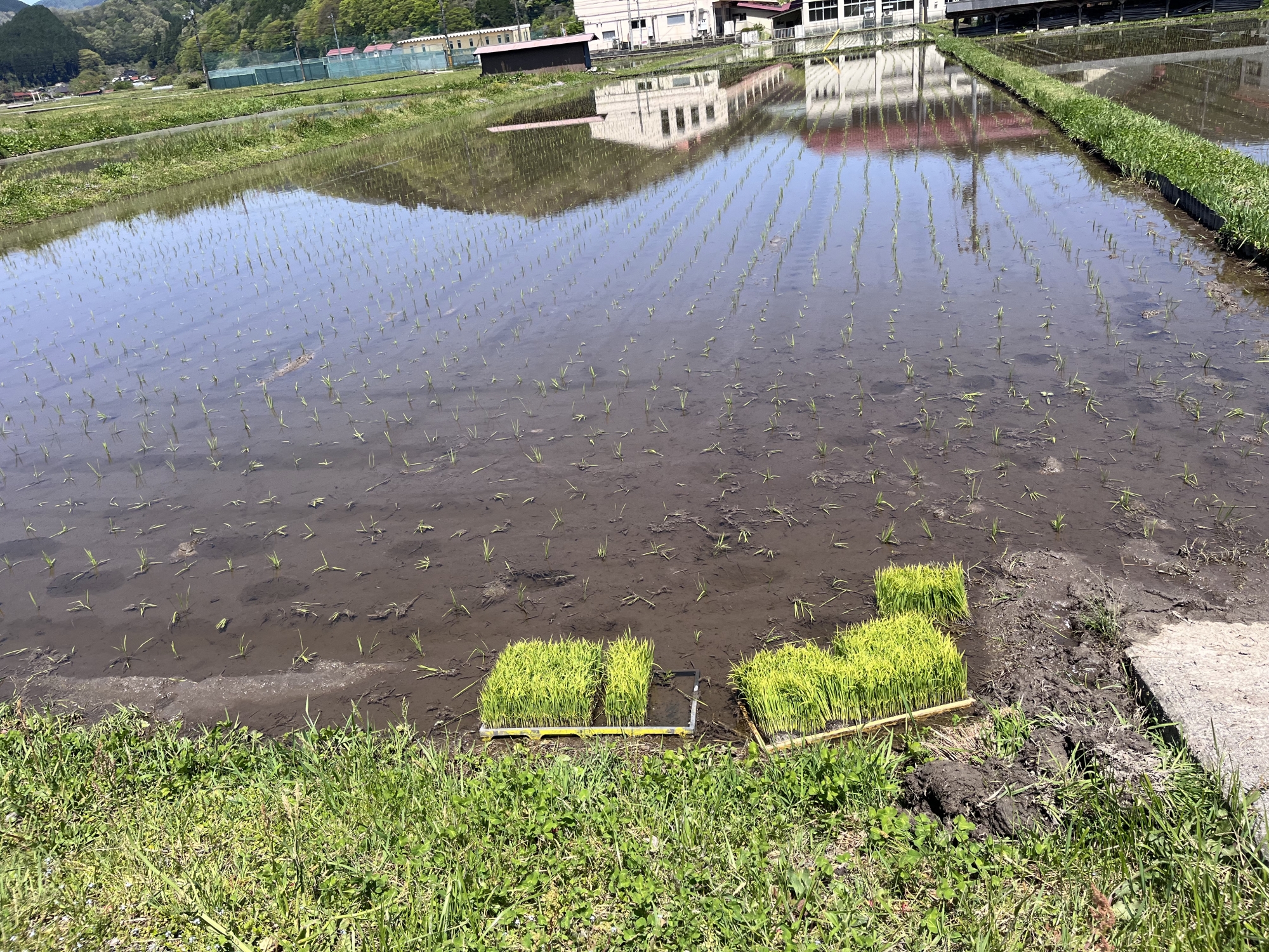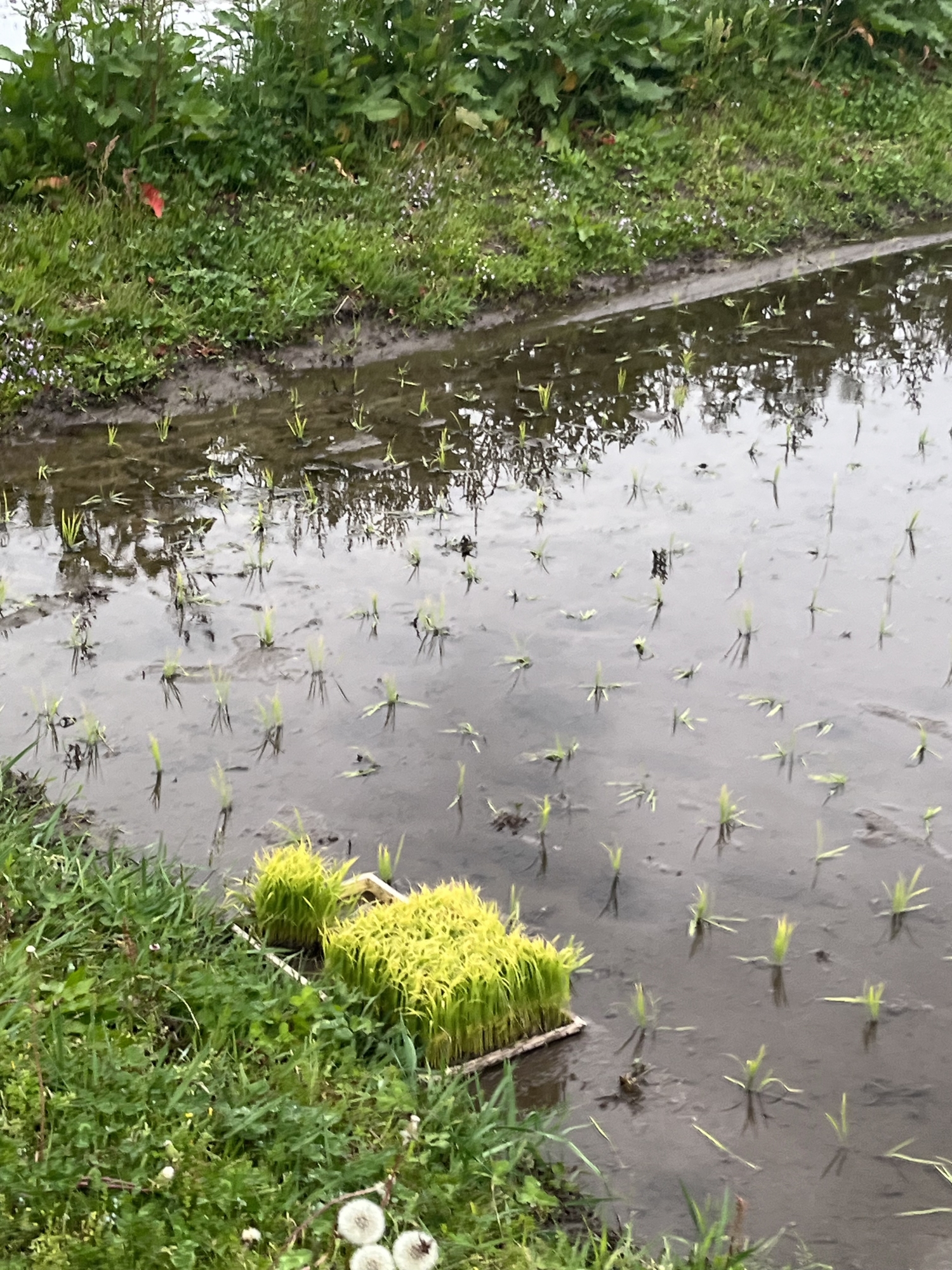 小学校の田圃は……少しだけ終わってて、まだ、苗が残ってて……岳ねんのグループで少しずつするのかな??