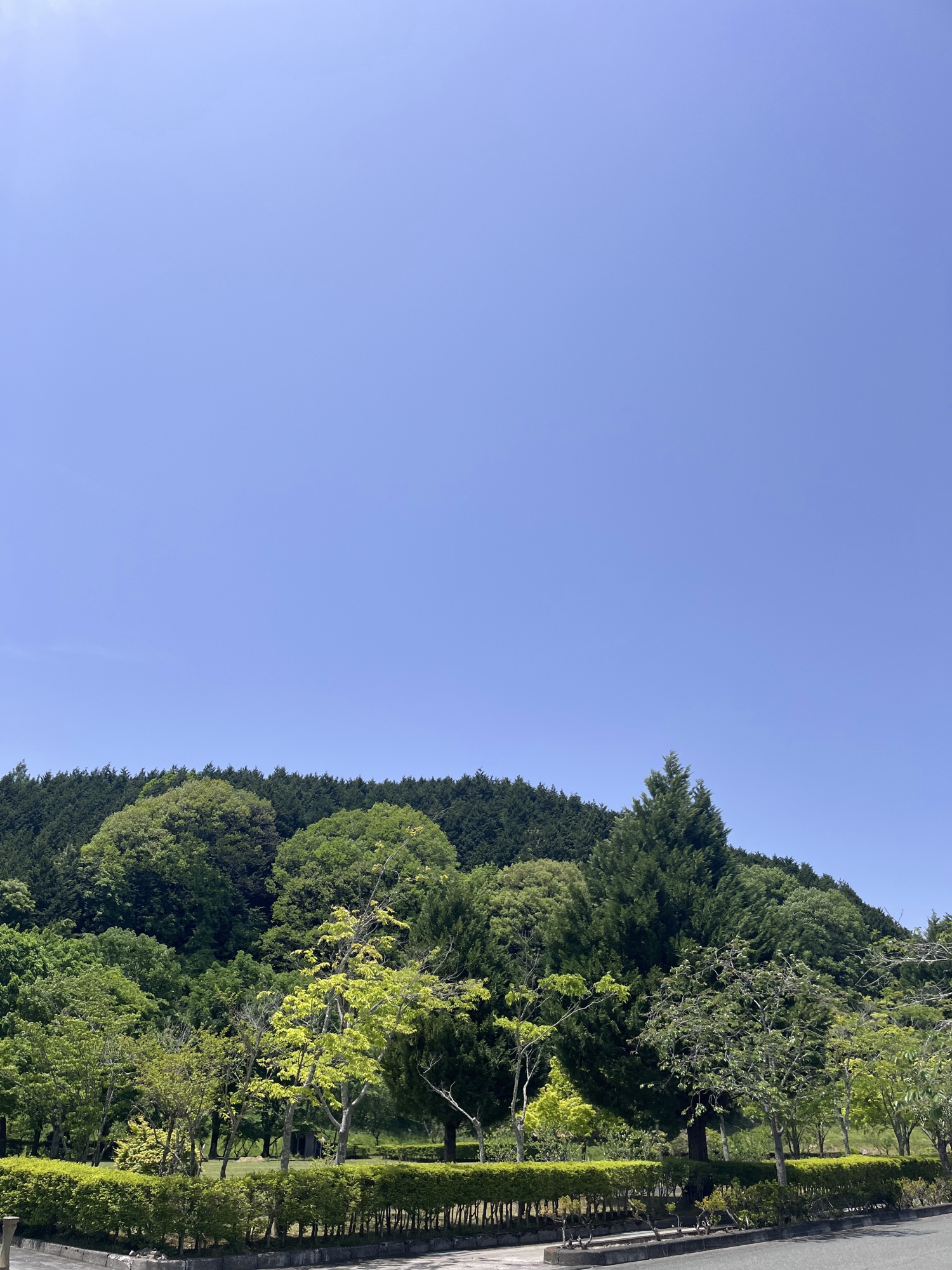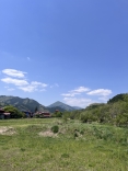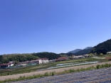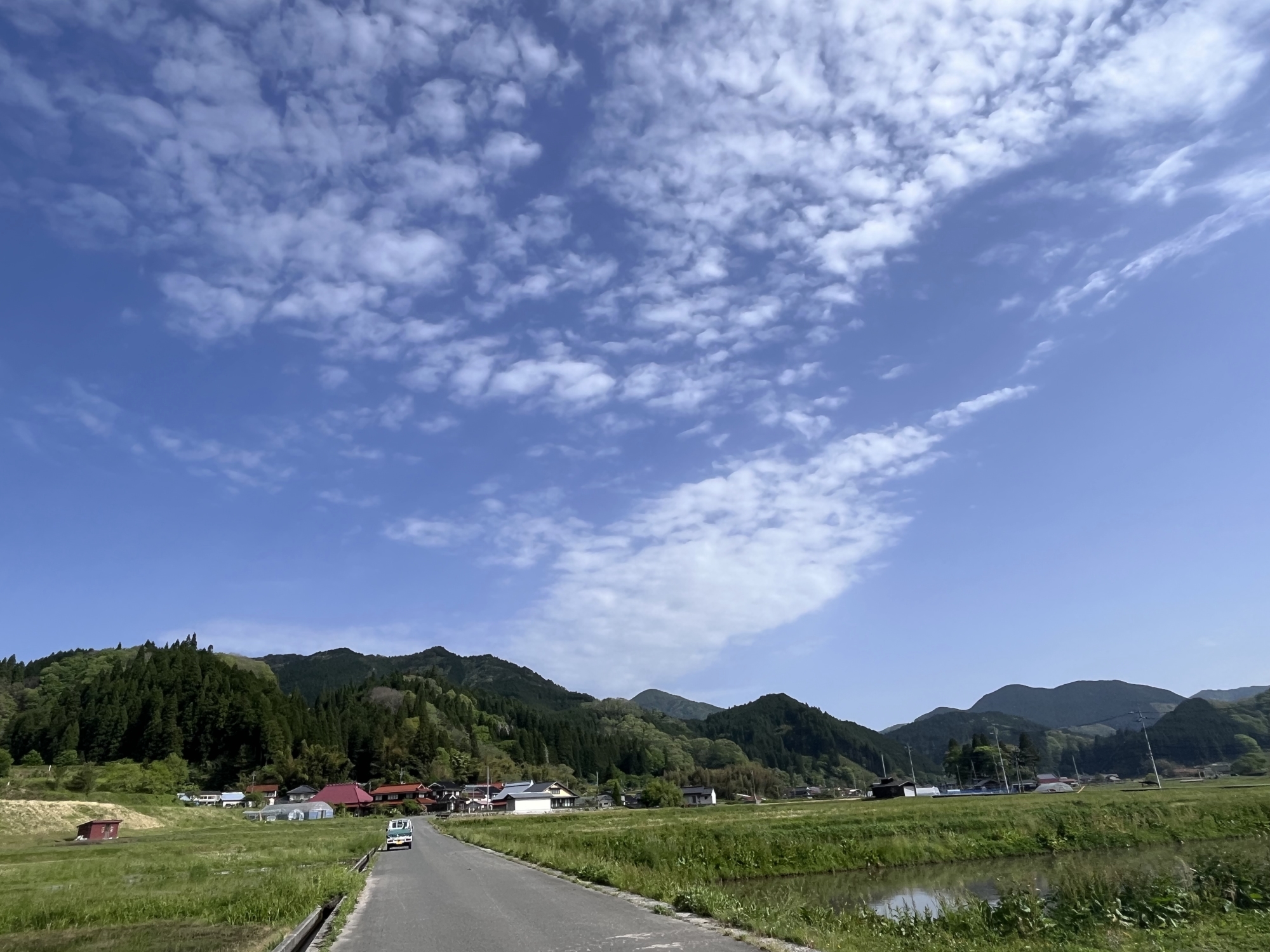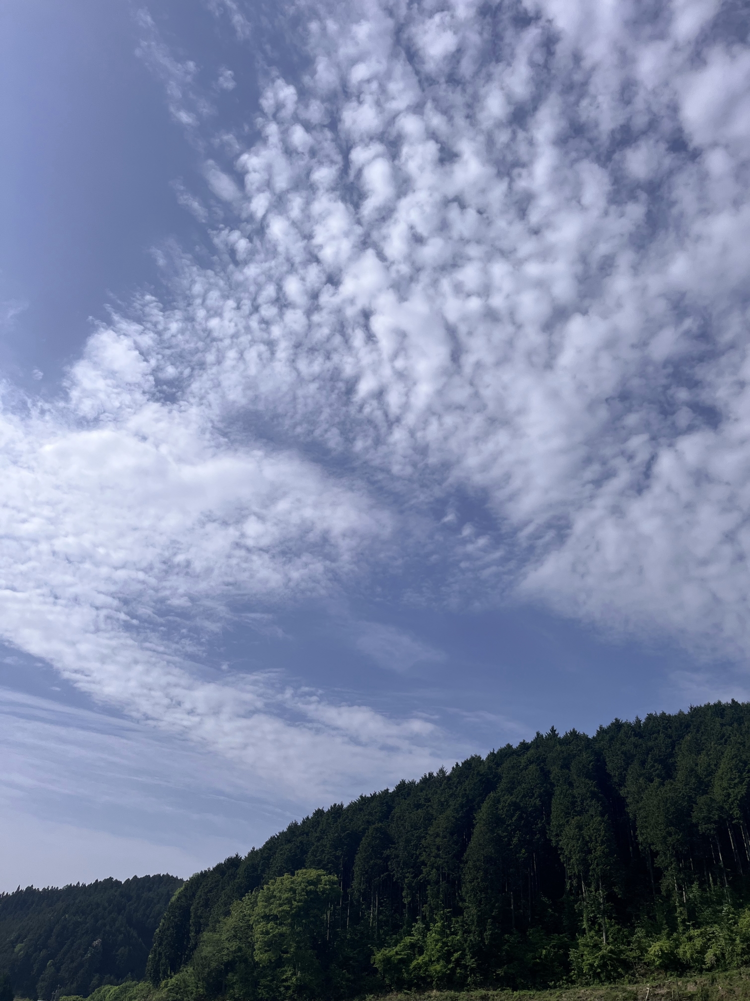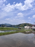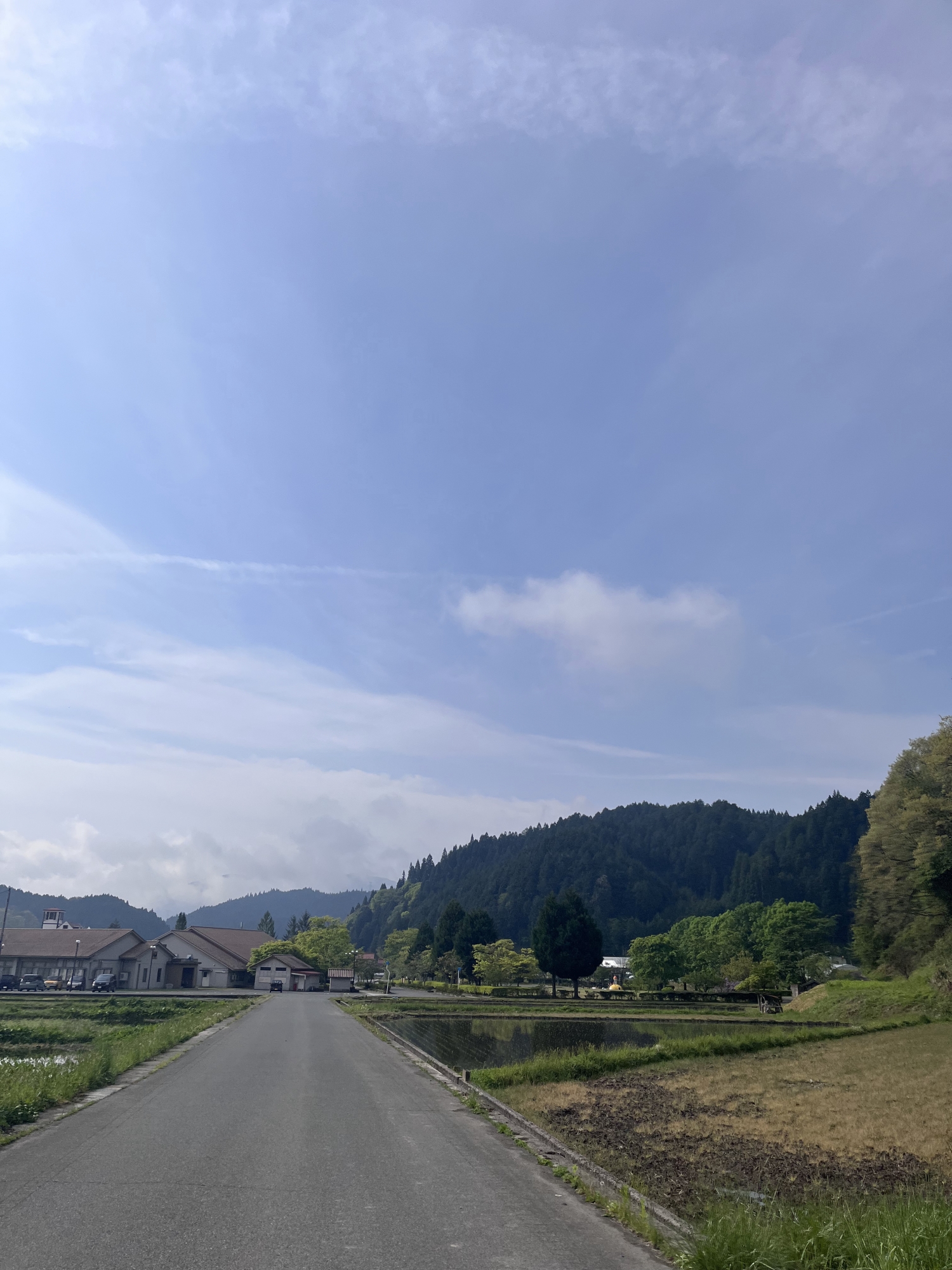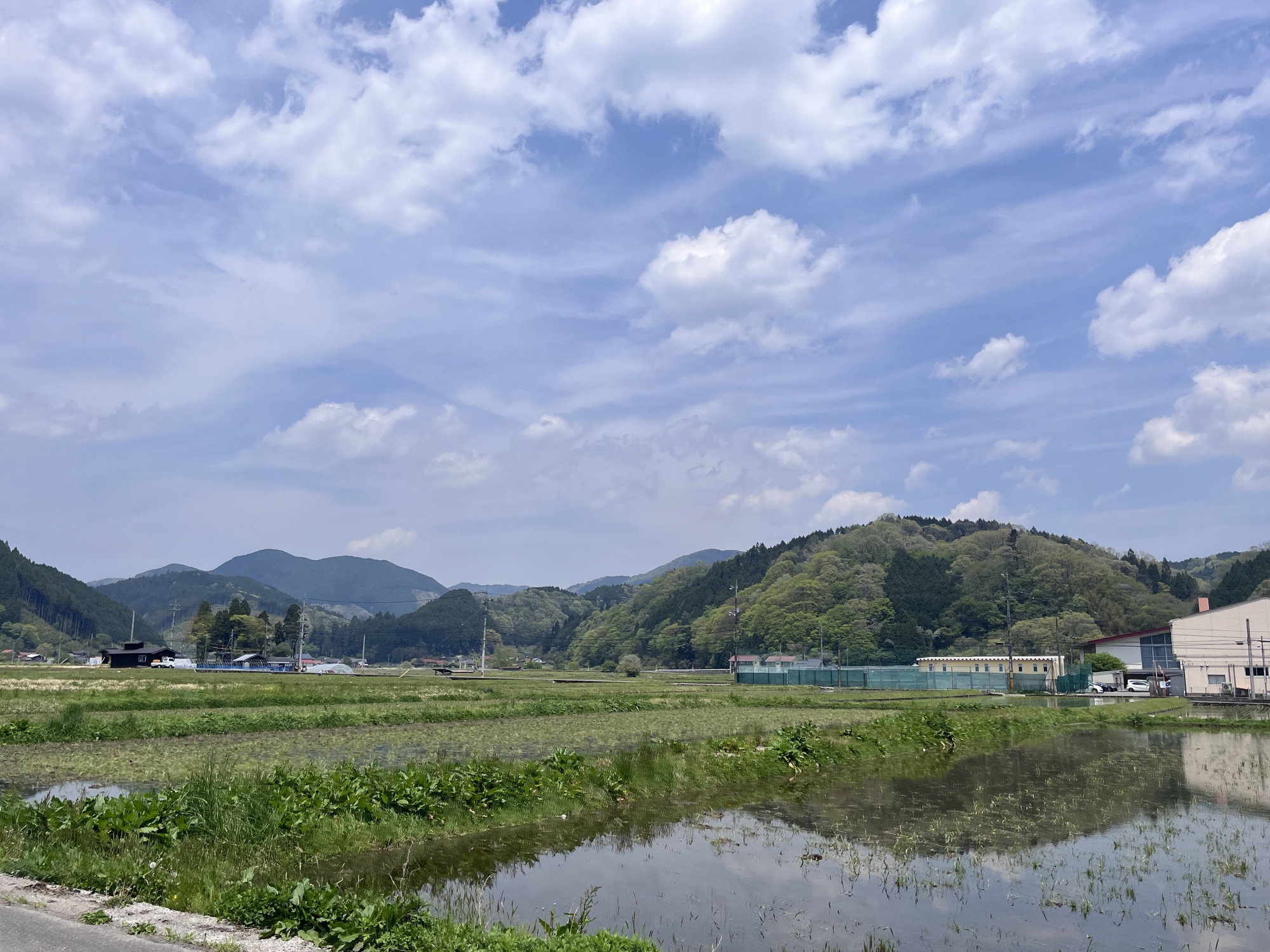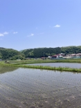 青空と白い雲と、あら、朝、苗が並んでいた田圃は、田植えが終わりました.